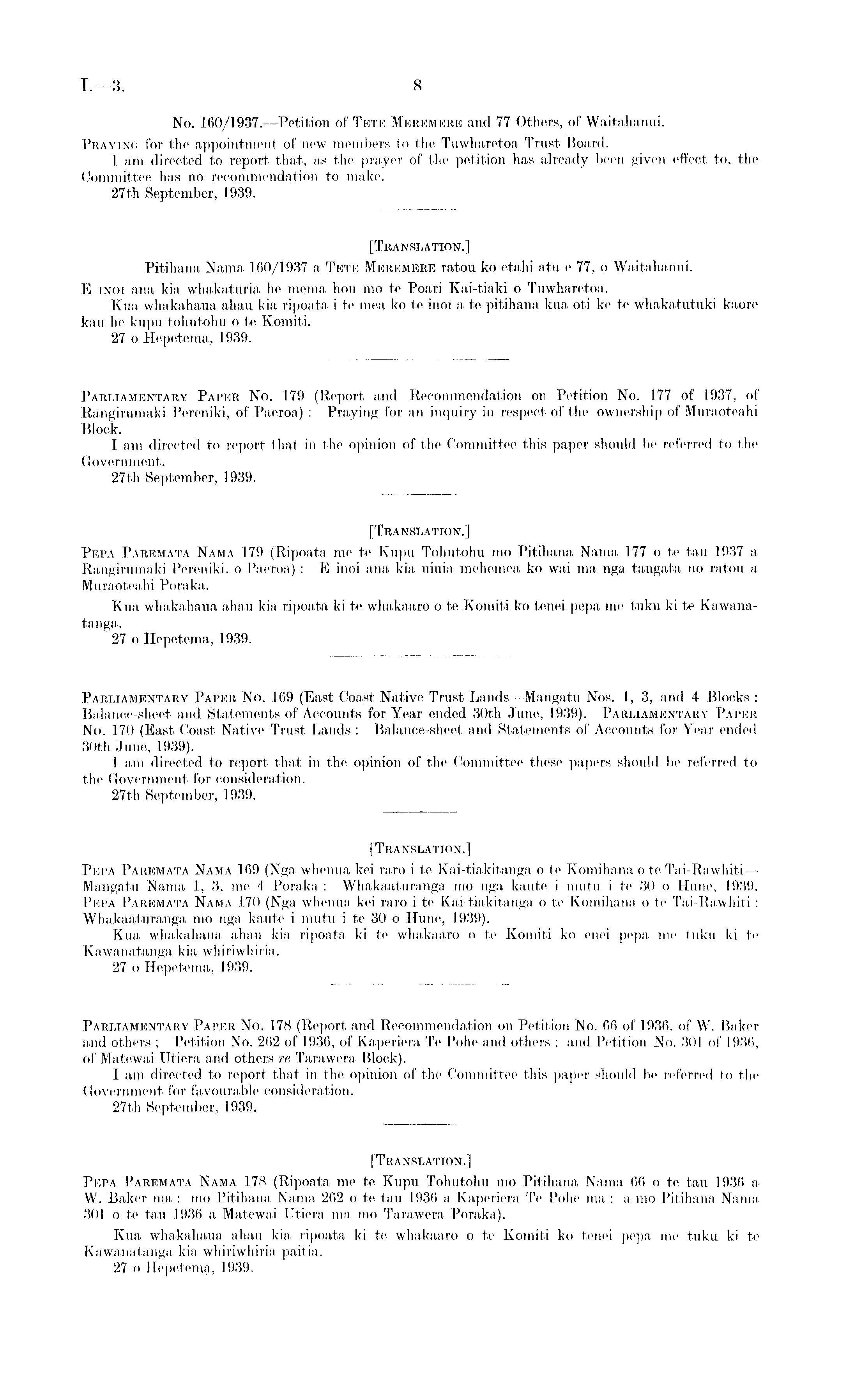 [Translation.] Pitihana Nama 160/1937 a Tete Meremere ratou ko etahi atu e 77, o Waitahanui. E inoi ana kia whakaturia ho mema hou mo te Poari Kai-tiaki o Tuwharetoa. Kua whakahaua ahau kia ripoata i to mea ko te inoi a to pitihana kua oti ke te whakatutuki kaore kau he kupu tohutohu o te Komiti. 27 o Hepetema, 1939.