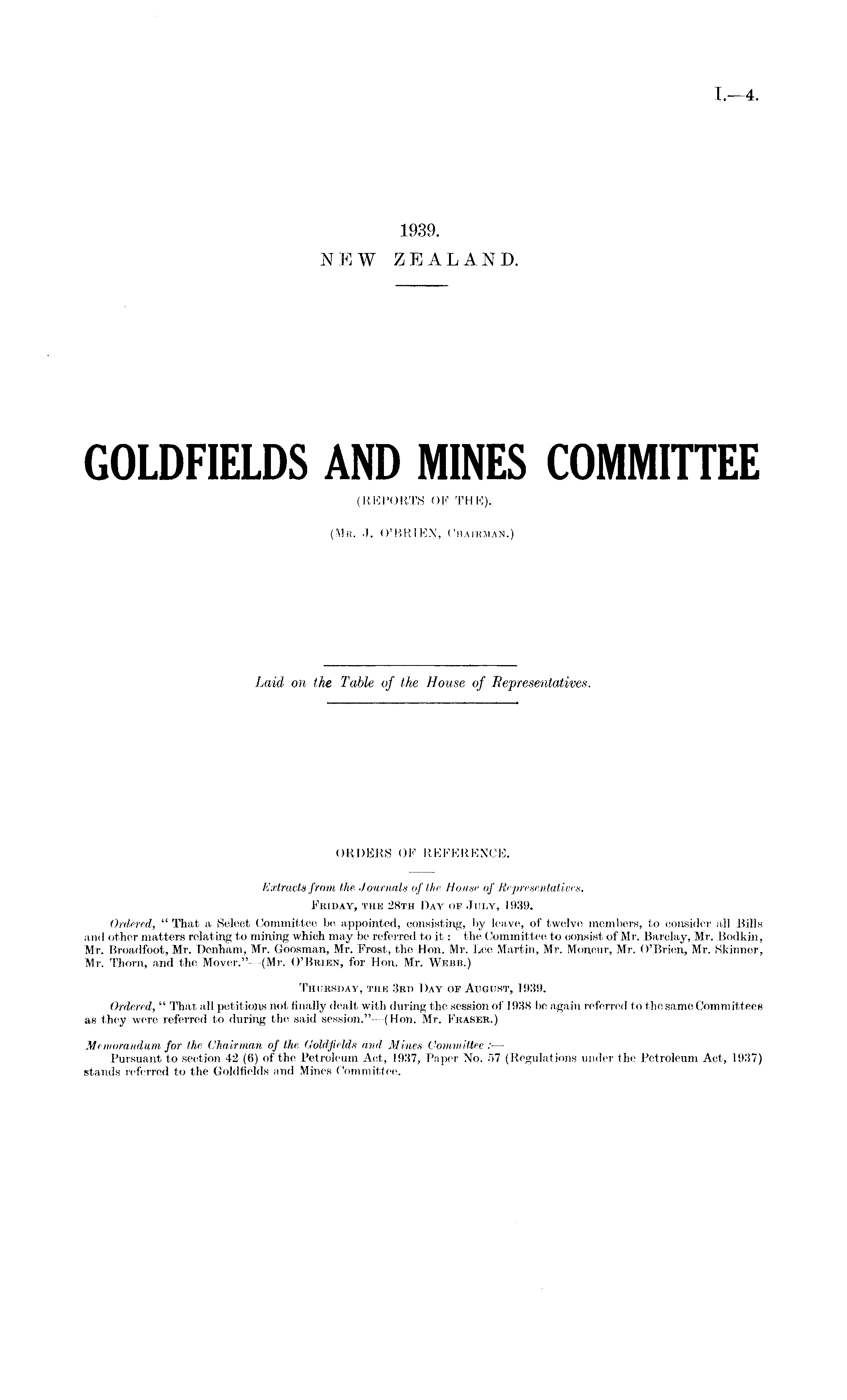 ORDERS OF REFERENCE. Extracts from the Journals of the House of Representatives. Friday, the 28th Day of July, 1939. Ordered, " That a Select Committee be appointed, consisting, by leave, of twelve members, to consider all Bills and other matters relating to mining which may be referred to it: the Committee to oonsist of Mr. Barclay, Mr. Bodkin, Mr. Broadfoot, Mr. Denham, Mr. Goosman, Mr. Frost, the Hon. Mr. Lee Martin, Mr. Monour, Mr. O'Brien, Mr. Skinner, Mr. Thorn, and the Mover."—(Mr. O'Brien, for Hon. Mr. Webb.) Thursday, the 3rd Day oe August, 1939. Ordered, " That all petitions not finally dealt with during the session of 1938 be again referred to the same Committees as they were referred to during the said session." —(Hon. Mr. Fraser.) Memorandum for the Chairman of the Goldfields and Mines Committee :— Pursuant to section 42 (6) of the Petroleum Act, 1937, Paper No. 57 (Regulations under the Petroleum Act, 1937) stands referred to the Goldfields and Mines Committee.