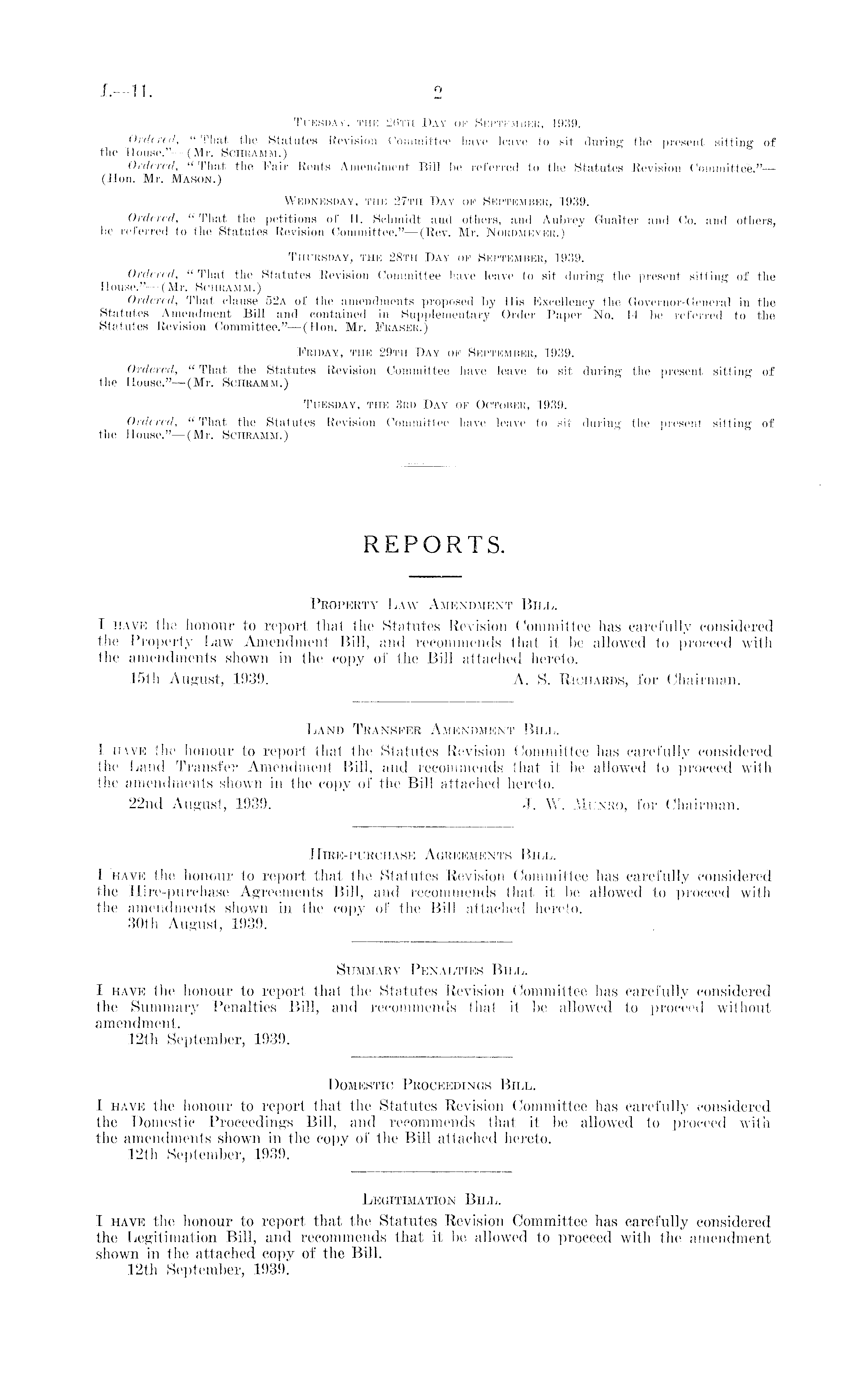 Tuesday, the 26th Day of September, 1939. Ordered, " That the Statutes Revision Committee have leave to sit during the present sitting of the House." —(Mr. Schramm.) Ordered, " That the .Fair Rents Amendment Bill be referred to the Statutes Revision Committee."— (Hon. Mr. Mason.) Wednesday, the 27th Day op September, 1939. Ordered, " That the petitions of H. Schmidt and others, and Aubrey Gualter and Co. and others, be referred to the Statutes Revision Committee." —(Rev. Mr. Nordmeyer.) Thursday, the 28th Day of September, 1939. Ordered, " That the Statutes Revision Committee have leave to sit during the present sitting of the House." —(Mr. Schramm.) Ordered, That clause 52a of the amendments proposed by His Excellency the Governor-General in the Statutes Amendment Bill and contained in Supplementary Order Paper No. 14 be referred to the Statutes Revision Committee." —(Hon. Mr. Phaser.) Friday, the 29tii Day Of September, 1939. Ordered, " That the Statutes Revision Committee have leave to sit during the present sitting of the House." —(Mr. Schramm.) Tuesday, the 3rd Day of October, 1939. Ordered, " That the Statutes Revision Committee have leave to sit during the present sitting of the House." —(Mr. Schramm.)