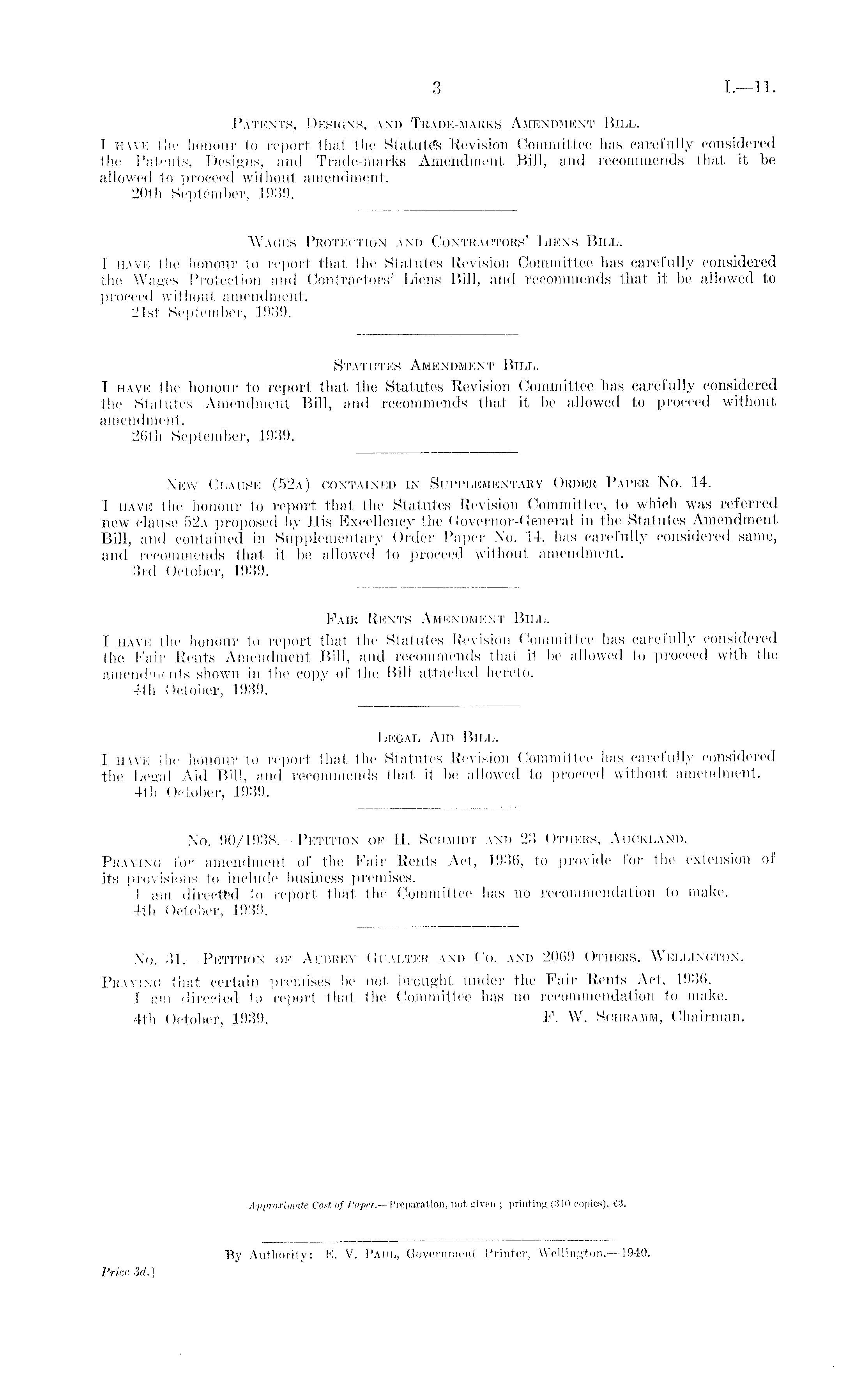 Pair Rents Amendment Bill. I have the honour to report that the Statutes Revision Committee has carefully considered the Pair Rents Amendment Bill, and recommends that it be allowed to proceed with the amendments shown in the copy of the Bill attached hereto. 4th October, 1939.