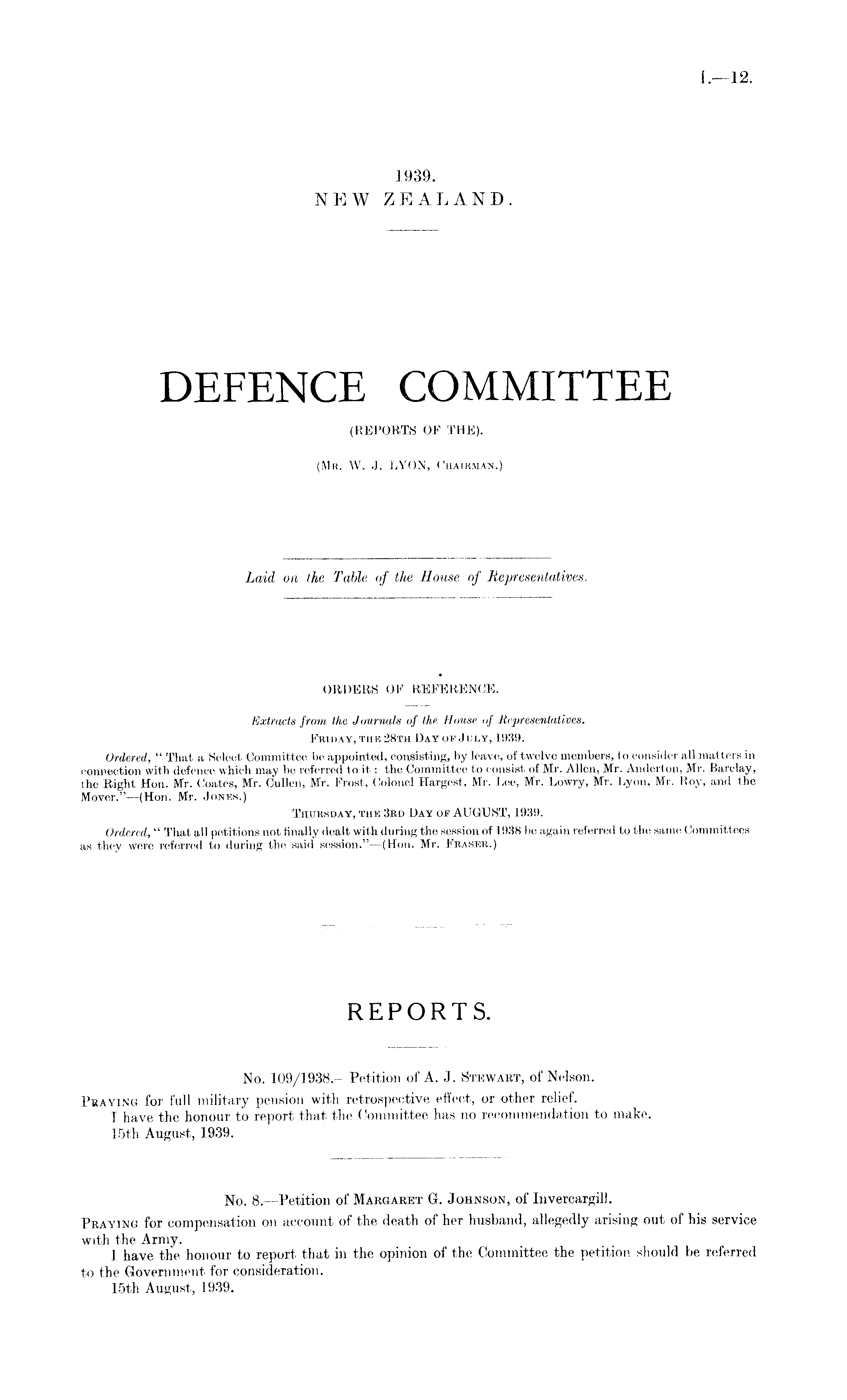 Extracts from the Journals of the House of Representatives. Friday, the 28th Day of July, 1939. Ordered, " That a Select Committee be appointed, consisting, by leave, of twelve members, to consider all matters in connection with defence which may be referred to it: the Committee to consist of Mr. Allen, Mr. Andorton, Mr. Barclay, the Right Hon. Mr. Coates, Mr. Cullen, Mr. Frost, Colonel Hargest, Mr. Lee, Mr. Lowry, Mr. Lyon, Mr. Roy, and the Mover."' —(Hon. Mr. Jones.) Thursday, the 3rd Bay of AUGUST, 1939. Ordered, " That all petitions not finally dealt with during the session of 1938 be again referred to the same Committees as they were referred, to during the said session." —(Hon. Mr. Fraser.)
