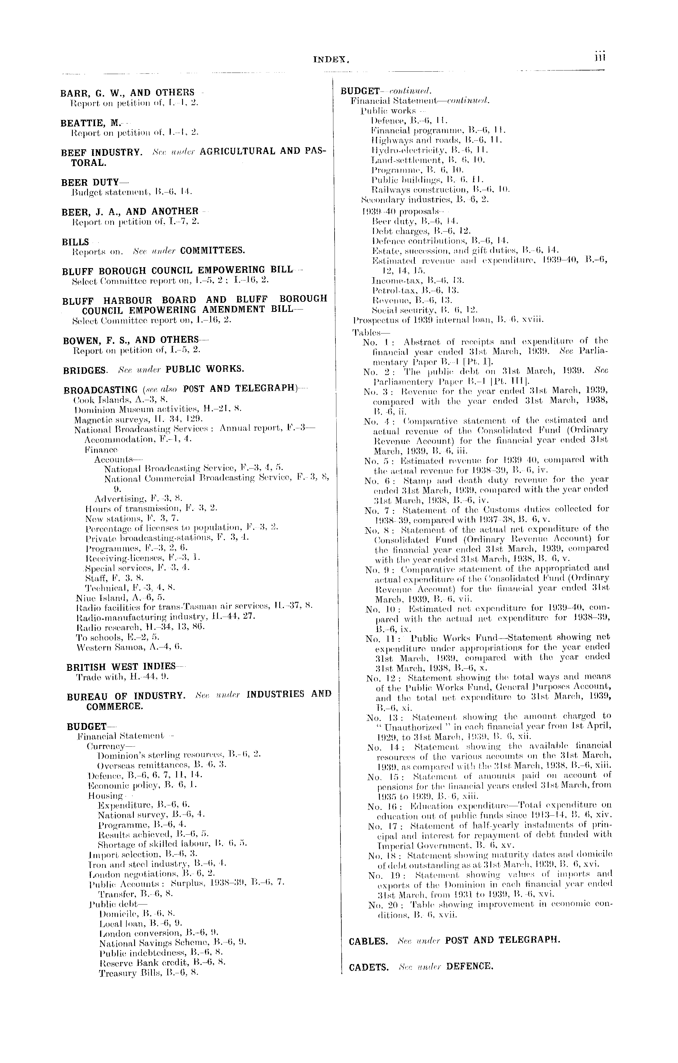 BARR, G. W., AND OTHERS— Report on petition of, 1.-l, 2. BEATTIE, M.— Report on petition of, 1.-l, 2. BEEF INDUSTRY. See under AGRICULTURAL AND PASTORAL. BEER DUTY— Budget statement, 8.-6, 14. BEER, J. A., AND ANOTHER— Report on petition of, 1.-7, 2. BILLS Reports on. See under COMMITTEES. BLUFF BOROUGH COUNCIL EMPOWERING BILL— Select Committee report on, 1.-5, 2 ; 1.-10, 2. BLUFF HARBOUR BOARD AND BLUFF BOROUGH COUNCIL EMPOWERING AMENDMENT BILL— Select Committee report on, 1.—16, 2. BOWEN, F. S., AND OTHERS Report on petition of, 1.-5, 2. BRIDGES. See under PUBLIC WORKS. BROADCASTING (see also POST AND TELEGRAPH)— Cook Islands, A.-3, 8. Dominion Museum activities, H.-21, 8. Magnetic surveys, H.-34, 129. National Broadcasting Services : Annual report, F.-3 — Accommodation, F.-l, 4. Finance — Accounts — National Broadcasting Service, F.-3, 4, 5. National Commercial Broadcasting Service, F.-3, 8, 9. Advertising, F.-3, 8. Hours of transmission, F.-3, 2. New stations, F.-3, 7. Percentage of licenses to population, F.-3, 2. Private broadcasting-stations, F.-3, 4. Programmes, F.-3, 2, 6. Receiving-licenses, F.-3, 1. Special services, F.-3, 4. Staff, F.-3, 8. Technical, F.-3, 4, 8. Niue Island, A.-6, 5. Radio facilities for trans-Tasman air services, H.-37, 8. Radio-manufacturing industry, H.-44, 27. Radio research, H.-34, 13, 86. To schools, E.-2, 5. Western Samoa, A.-4, 6. BRITISH WEST INDIES— Trade with, H.-44, 9. BUREAU OF INDUSTRY. See under INDUSTRIES AND COMMERCE. BUDGET— Financial Statement — Currency — Dominion's sterling resources, 8.-6, 2. Overseas remittances, 8.-6, 3. Defence, 8.-6, 6, 7, 11, 14. Economic policy, 8.-6, 1. Housing— Expenditure, 8.-6, 6. National survey, 8.-6, 4. Programme, 8.-6, 4. Results achieved, 8.-6, 5. Shortage of skilled labour, 8.-6, 5. Import selection, 8.-6, 3. Iron and steel industry, 8.-6, 4. London negotiations, 8.-6, 2. Public Accounts: Surplus, 1938-39, 8.-6, 7. Transfer, 8.-6, 8. Public debt — Domicile, 8.-6, 8. Local loan, 8.-6, 9. London conversion, 8.-6, 9. National Savings Scheme, 8.-6, 9. Public indebtedness, 8.-6, 8. Reserve Bank credit, 8.-6, 8. Treasury Bills, 8.-6, 8.