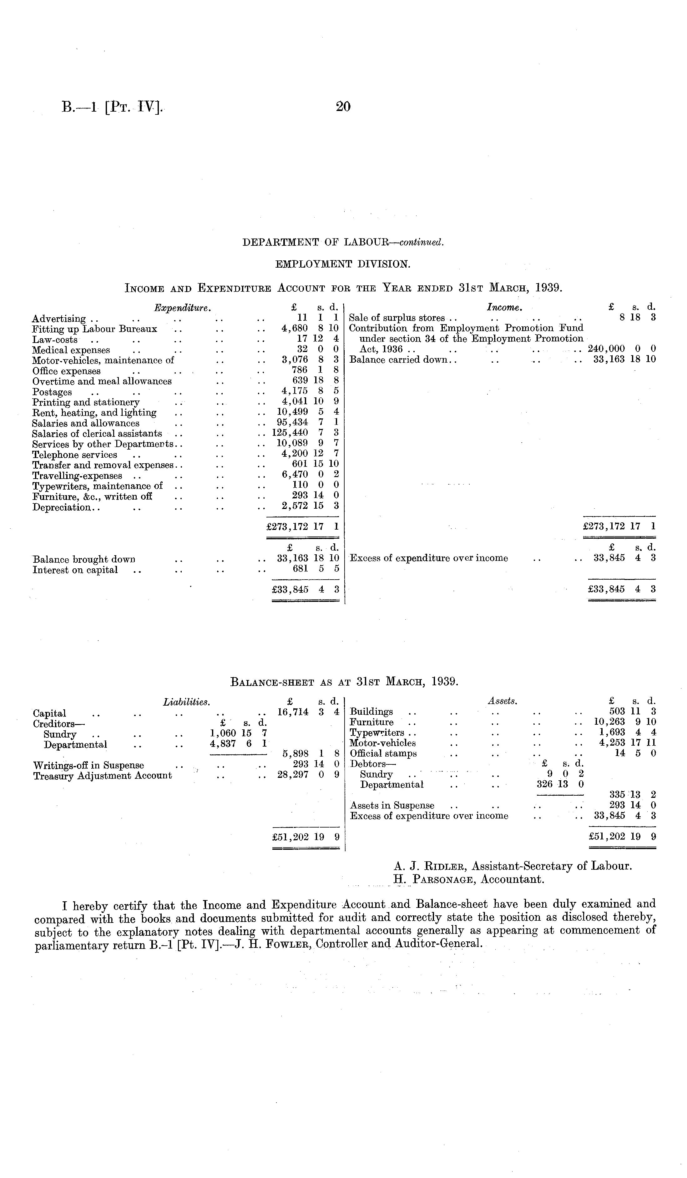 DEPARTMENT OF LABOUR—continued. EMPLOYMENT DIVISION. Income and Expenditure Account for the Year ended 31st March, 1939. Expenditure. £ s. d. Income. £ s. d. Advertising .. .. .. •• 11 1 1 Sale of surplus stores .. .. .. .. 8 18 3 Pitting up Labour Bureaux .. .. .. 4,680 810 Contribution from Employment Promotion Fund Law-costs .. .. .. • • • ■ 17 12 4 under section 34 of the Employment Promotion Medical expenses .. .. .. •. 32 0 0 Act, 1936 .. .. .. .. .. 240,000 0 0 Motor-vehicles, maintenance of .. .. 3,076 8 3 Balance carried down.. .. .. .. 33,163 18 10 Office expenses .. .. .. • • 786 1 8 Overtime and meal allowances .. . . 639 18 8 Postages .. .. •• •• •• 4,175 8 5 Printing and stationery .. .. .. 4,041 10 9 Rent, heating, and lighting .. .. •• 10,499 5 4 Salaries and allowances .. .. . . 95,434 7 1 Salaries of clerical assistants .. .. .. 125,440 7 3 Services by other Departments.. .. .. 10,089 9 7 Telephone services .. .. • • • • 4,200 12 7 Transfer and removal expenses.. .. .. 601 15 10 Travelling-expenses .. .. •• •• 6,470 0 2 Typewriters, maintenance of .. .. .. 110 0 0 Furniture, &c., written off .. .. .. 293 14 0 Depreciation.. .. •• •• 2,572153 £273,172 17 1 £273,172 17 1 £ s. d. £ s. d. Balance brought down .. .. .. 33,163 18 10 Excess of expenditure over income .. .. 33,845 4 3 Interest on capital .. .. . • • ■ 681 5 5 £33,845 4 3 £33,845 4 3 Balance-sheet as at 31st March, 1939. Liabilities. £ s. d. Assets. £ s. d. Capital .. .. .. •• •• 16,714 3 4 Buildings .. .. .. .. .. 503 11 3 Creditors — £ s- d. Furniture .. .. .. .. .. 10,263 910 Sundry .. .. .. 1,060 15 7 Typewriters.. .. .. .. .. 1,693 4 4 Departmental .. .. 4,837 6 1 Motor-vehicles .. . . . . •. 4,253 17 11 ——• 5,898 1 8 Official stamps .. .. .. .. 14 5 0 Writings-off in Suspense .. . • . • 293 14 0 Debtors—■ £ s. d. Treasury Adjustment Account .. .. 28,297 0 9 Sundry .. .. .. 9 0 2 Departmental .. .. 326 13 0 335 13 2 Assets in Suspense .. .. .. .. 293 14 0 Excess of expenditure over income .. .. 33,845 4 3 £51,202 19 9 £51,202 19 9 A. J. Ridler, Assistant-Secretary of Labour. H. Parsonage, Accountant. I hereby certify that the Income and Expenditure Account and Balance-sheet have been duly examined and compared with the books and documents submitted for audit and correctly state the position as disclosed thereby, subject to the explanatory notes dealing with departmental accounts generally as appearing at commencement of parliamentary return 8.-l [Pt. IV].—J. H. Fowler, Controller and Auditor-General.