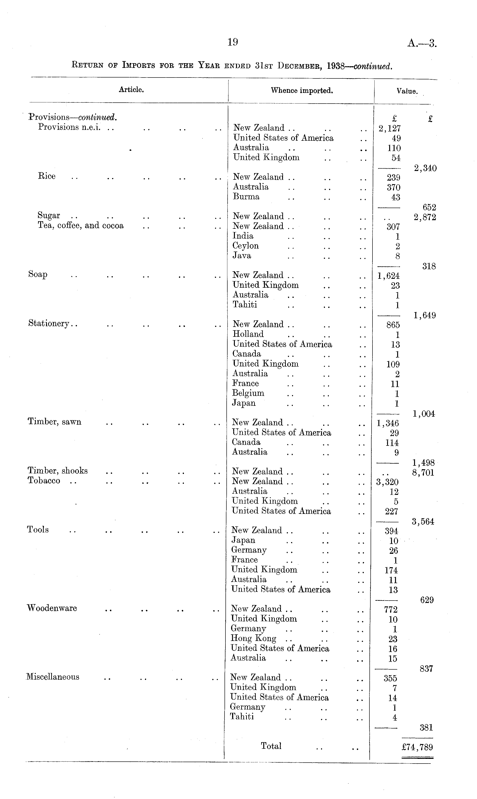 Article. Whence imported. Value. —__ _ Provisions—continued. £ £ Provisions n.e.i. .. .. .. .. New Zealand . . .. .. 2,127 United States of America .. 49 Australia .. .. .. 110 United Kingdom .. . . 54 2,340 Rice .. .. .. .. .. New Zealand .. .. .. 239 Australia .. .. .. 370 Burma .. .. .. 43 652 Sugar .. .. .. .. .. New Zealand .. .. .. .. 2,872 Tea, coffee, and cocoa .. .. .. New Zealand . . .. .. 307 India . . .. .. 1 Ceylon .. .. .. 2 Java .. .. .. 8 318 Soap .. .. .. .. .. New Zealand .. .. 1 ,,624 United Kingdom .. .. 23 Australia .. .. .. 1 Tahiti .. .. .. 1 — 1,649 Stationery.. .. .. .. .. New Zealand .. .. .. 865 Holland 1 United States of America .. 13 Canada .. .. .. 1 United Kingdom .. .. 109 Australia .. .. .. 2 France .. .. .. 11 Belgium .. .. .. 1 Japan .. .. .. 1 1,004 Timber, sawn .. .. .. .. New Zealand .. .. .. 1,346 United States of America .. 29 Canada .. .. .. 114 Australia .. .. .. 9 — 1,498 Timber, shooks .. .. .. .. New Zealand .. .. .. .. 8,701 Tobacco .. .. .. .. .. New Zealand .. .. .. 3,320 Australia .. .. .. 12 United Kingdom .. .. 5 United States of America .. 227 3,564 Tools .. .. .. .. .. New Zealand .. .. .. 394 Japan .. .. .. 10 Germany .. .. .. 26 France .. .. .. 1 United Kingdom .. .. 174 Australia .. .. .. 11 United States of America .. 13 629 Woodenware .. .. .. .. New Zealand .. .. .. 772 United Kingdom .. .. 10 Germany .. .. .. 1 Ilong Kong .. . . .. 23 United States of America .. 16 Australia .. .. .. 15 837 Miscellaneous .. .. .. .. New Zealand .. .. .. 355 United Kingdom .. .. 7 United States of America .. 14 Germany .. .. . . 1 Tahiti . . .. .. 4 381 | Total .. .. £74,789