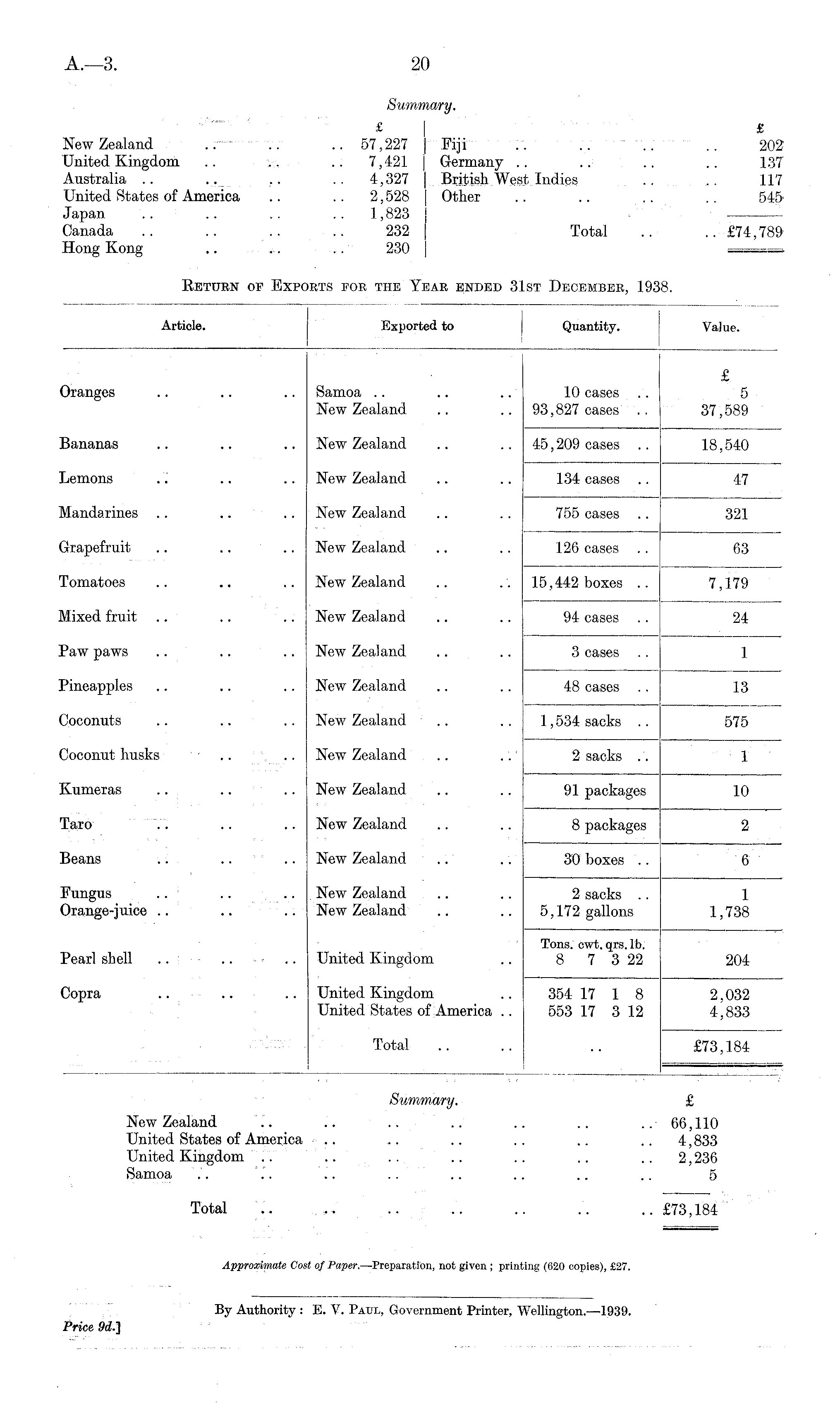 Summary. £ New Zealand .. .. .. .. .. .. .. 66,110 United States of America .. .. .. .. .. .. 4,833 United Kingdom .. .. .. .. .. .. 2,236 Samoa .. .. .. .. .. .. .. .. 5 Total .. .. .. .. .. .. .. £73,184
