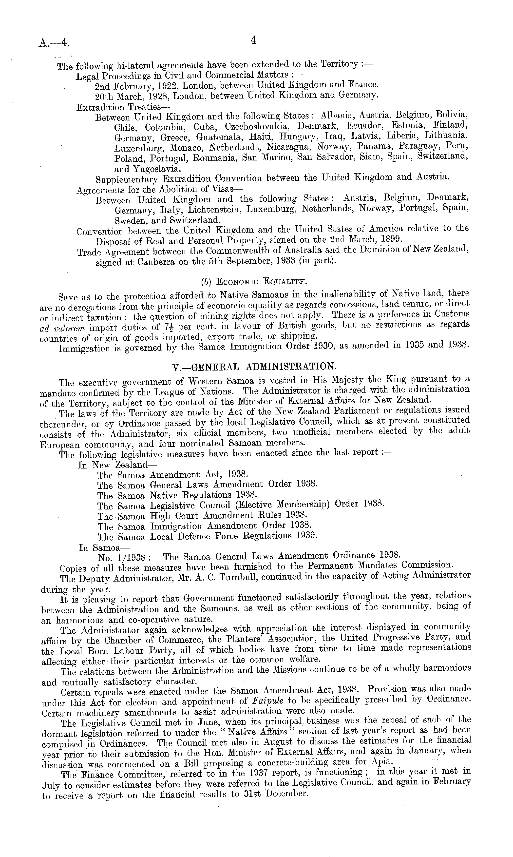 The following bi-lateral agreements have been extended to the Territory Legal Proceedings in Civil and Commercial Matters : — 2nd February, 1922, London, between United Kingdom and France. 20th March, 1928, London, between United Kingdom and Germany. Extradition Treaties — _ . Between United Kingdom and the following States : Albania, Austria, Belgium, Bolivia, Chile, Colombia, Cuba, Czechoslovakia, Denmark, Ecuador, Estonia, Finland, Germany, Greece, Guatemala, Haiti, Hungary, Iraq, Latvia, Liberia, Lithuania, Luxemburg, Monaco, Netherlands, Nicaragua, Norway, Panama, Paraguay, Peru, Poland, Portugal, Roumania, San Marino, San Salvador, Siam, Spain, Switzerland, and Yugoslavia. Supplementary Extradition Convention between the United Kingdom and Austria. Agreements for the Abolition of Visas — Between United Kingdom and the following States: Austria, Belgium, Denmark, Germany, Italy, Lichtenstein, Luxemburg, Netherlands, Norway, Portugal, Spain, Sweden, and Switzerland. Convention between the United Kingdom and the United States of America relative to the Disposal of Real and Personal Property, signed on the 2nd March, 1899. Trade Agreement between the Commonwealth of Australia and the Dominion of New Zealand, signed at Canberra on the sth September, 1933 (in part). (6) Economic Equality. Save as to the protection afforded to Native Samoans in the inalienability of Native land, there are no derogations from the principle of economic equality as regards concessions, land tenure, or direct or indirect taxation ; the question of mining rights does not apply. There is a preference in Customs ad valorem import duties of 7| per cent, in favour of British goods, but no restrictions as regards countries of origin of goods imported, export trade, or shipping. Immigration is governed by the Samoa Immigration Order 1930, as amended m 1935 and 1938. V.—GENERAL ADMINISTRATION. The executive government of Western Samoa is vested in His Majesty the King pursuant to a mandate- confirmed by the League of Nations. The Administrator is charged with the administration of the Territory, subject to the control of the Minister of External Affairs for New Zealand. The laws of the Territory are made by Act of the New Zealand Parliament or regulations issued thereunder, or by Ordinance passed by the local Legislative Council, which as at present constituted consists of the Administrator, six official members, two unofficial members elected by the adult European community, and four nominated Samoan members. The following legislative measures have been enacted since the last report: — In New Zealand —- The Samoa Amendment Act, 1938. The Samoa General Laws Amendment Order 1938. The Samoa Native Regulations 1938. The Samoa Legislative Council (Elective Membership) Order 1938. The Samoa High Court Amendment Rules 1938. The Samoa Immigration Amendment Order 1938. The Samoa Local Defence Force Regulations 1939. In Samoa — No. 1/1938 : The Samoa General Laws Amendment Ordinance 1938. Copies of all these measures have been furnished to the Permanent Mandates Commission. The Deputy Administrator, Mr. A. C. Turnbull, continued in the capacity of Acting Administrator during the yeax. It is pleasing to report that Government functioned satisfactorily throughout the year, relations between the Administration and the Samoans, as well as other sections of the community, being ol an harmonious and co-operative nature. _ . The Administrator again acknowledges with appreciation the interest displayed m community affairs by the Chamber of Commerce, the Planters' Association, the United Progressive Party, and the Local Born Labour Party, all of which bodies have from time to time made representations affecting either their particular interests or the common welfare. The relations between the Administration and the Missions continue to be of a wholly harmonious and mutually satisfactory character. Certain repeals were enacted under the Samoa Amendment Act, 1938. Provision was also made under this Act for election and appointment of Faipule to be specifically prescribed by Ordinance. Certain machinery amendments to assist administration were also made. The Legislative Council met in June, when its principal business was the repeal of such ol the dormant legislation referred to under the " Native Affairs " section of last year s report as had been comprised .in Ordinances. The Council met also in August to discuss the estimates for the financial vear prior to their submission to the Hon. Minister of External Affairs, and again in January, when discussion was commenced on a Bill proposing a concrete-building area for Apia. The Finance Committee, referred to in the 1937 report, is functioning ; in this year it met m July to consider estimates before they were referred to the Legislative Council, and again in February to receive a "report on the financial results to 31st December.