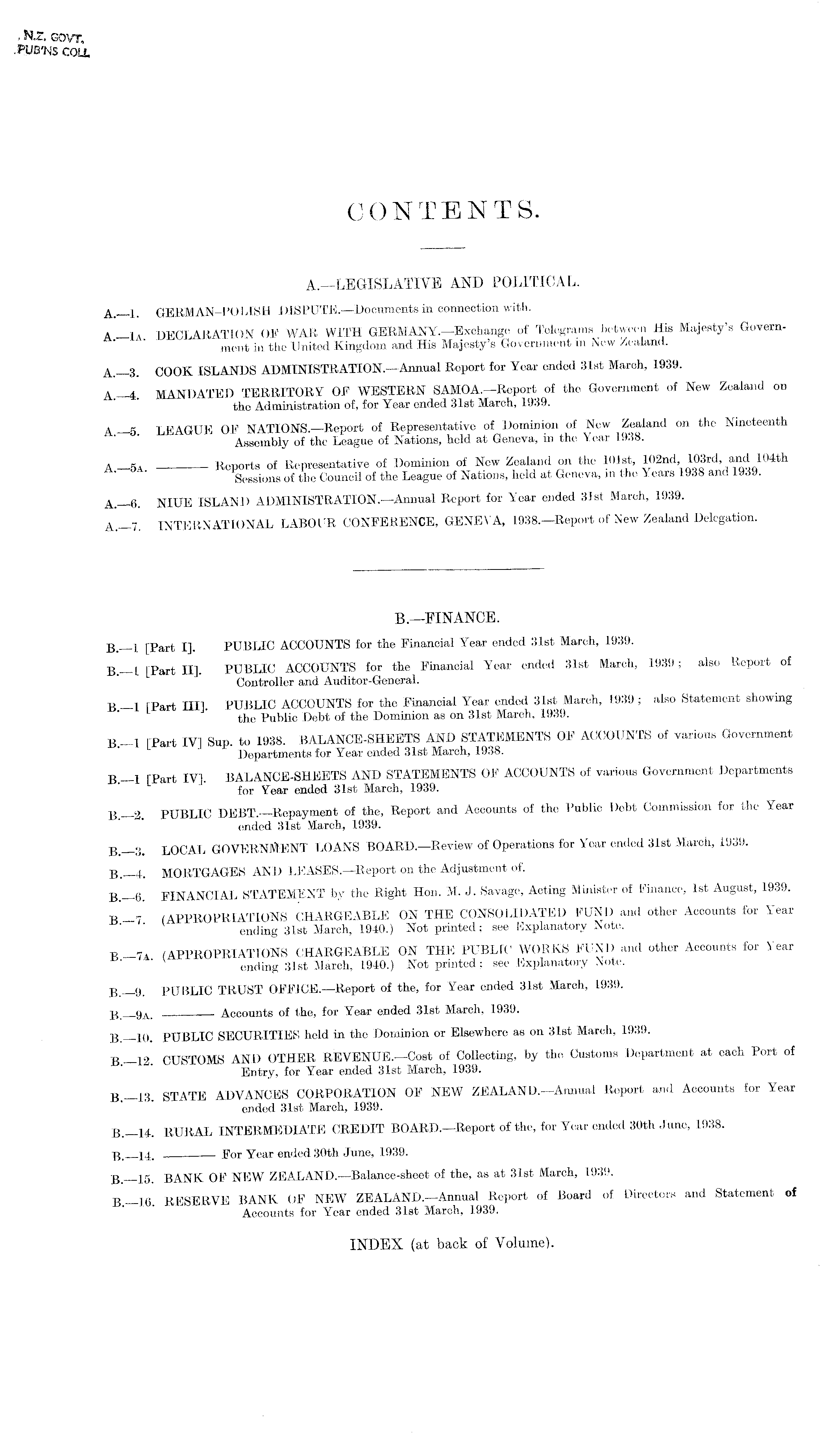 CONTENTS. A.—LEGISLATIVE AND POLITICAL. A.—l. GERMAN-POLISH DlSPUTE.—Documents in connection with. A— I a DECLARATION OF WAR WITH GERMANY.—Exchange of Telegrams between His Majesty's Government in the United Kingdom and His Majesty's Government m New Zealand. A _3. COOK ISLANDS ADMINISTRATION.—AnnuaI Report for Year ended 31st March, 1939. A.—4. MANDATED TERRITORY OF WESTERN SAMOA.—Report of the Government of New Zealand on the Administration of, for Year ended 31st March, 1939. » g LEAGUE OF NATIONS.—Report of Representative of Dominion of New Zealand on the Nineteenth Assembly of the League of Nations, held at Geneva, in the Year 1938. a _ sa Reports of Representative of Dominion of New Zealand on the 101 st, 102 nd, 103 rd, and 104 th Sessions of the Council of the League of Nations, held at Geneva, m the Years 1938 and 1939. A.—6. NIUE ISLAND ADMINISTRATION.—AnnuaI Report for Year ended 31st March, 1939. A.—7. INTERNATIONAL LABOUR CONFERENCE, GENEVA, 1938.—Report of New Zealand Delegation.
