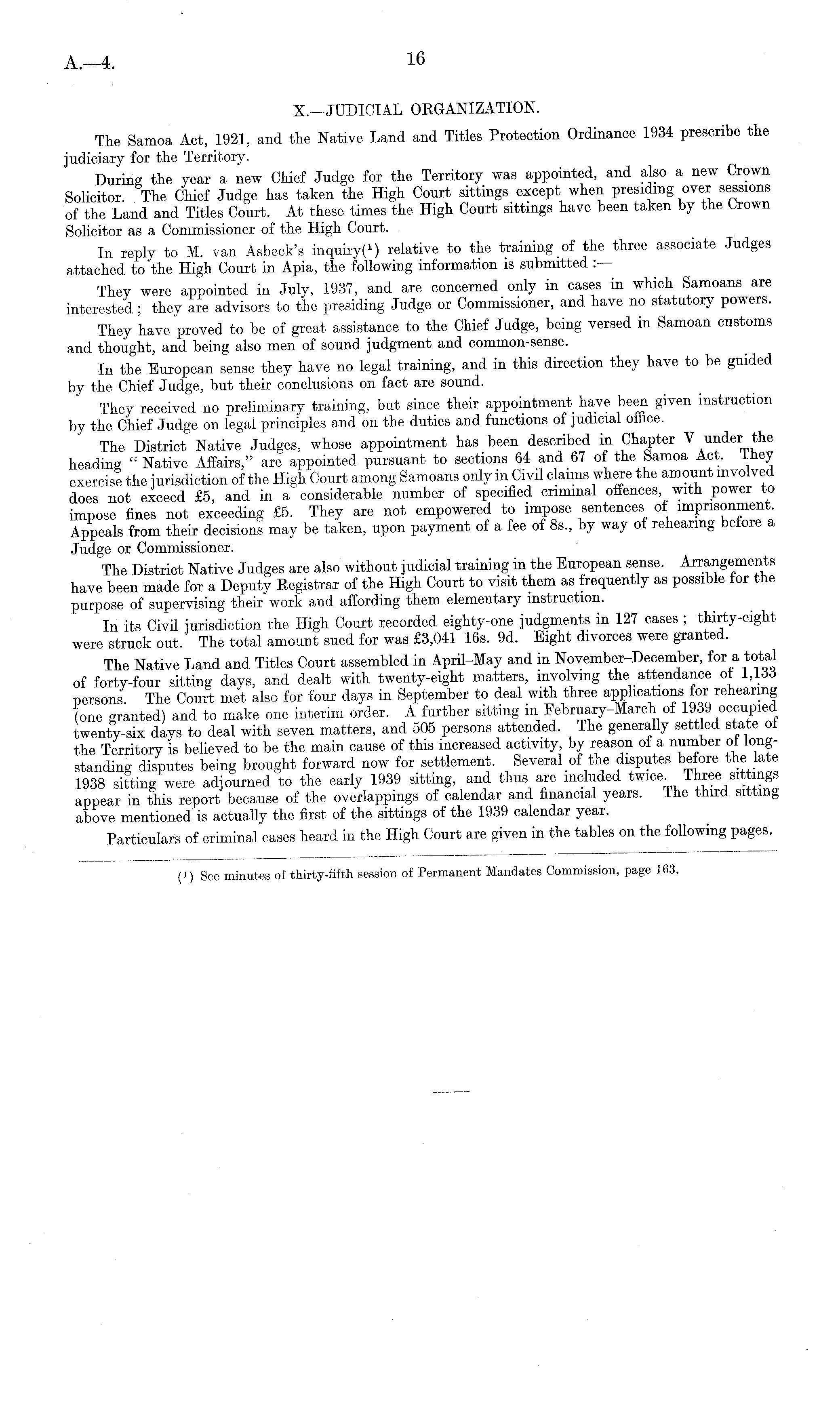 X.—JUDICIAL ORGANIZATION. The Samoa Act, 1921, and the Native Land and Titles Protection Ordinance 1934 prescribe the judiciary for the Territory. During the year a new Chief Judge for the Territory was appointed, and also a new Crown Solicitor. The Chief Judge has taken the High Court sittings except when presiding over sessions of the Land and Titles Court. At these times the High Court sittings have been taken by the Crown Solicitor as a Commissioner of the High Court. In reply to M. van Asbeck's relative to the training of the three associate Judges attached to the High Court in Apia, the following information is submitted They were appointed in July, 1937, and are concerned only in cases in which Samoans are interested ; they are advisors to the presiding Judge or Commissioner, and have no statutory powers. They have proved to be of great assistance to the Chief Judge, being versed in Samoan customs and thought, and being also men of sound judgment and common-sense. In the European sense they have no legal training, and in this direction they have to be guided by the Chief Judge, but their conclusions on fact are sound. They received 110 preliminary training, but since their appointment have been given instruction by the Chief Judge on legal principles and on the duties and functions of judicial office. The District Native Judges, whose appointment has been described in Chapter V under the heading " Native Affairs," are appointed pursuant to sections 64 and 67 of the Samoa Act. lhey exercise the jurisdiction of the High Court among Samoans only in Civil claims where the amount involved does not exceed £5, and in a considerable number of specified criminal offences with power to impose fines not exceeding £5. They are not empowered to impose sentences of imprisonment Appeals from their decisions may be taken, upon payment of a fee of Bs., by way of rehearing before a Judge or Commissioner. The District Native Judges are also without judicial training in the European sense. Arrangements have been made for a Deputy Registrar of the High Court to visit them as frequently as possible for the purpose of supervising their work and affording them elementary instruction. In its Civil jurisdiction the High Court recorded eighty-one judgments in 127 cases ; thirty-eight were struck out. The total amount sued for was £3,041 16s. 9d. Eight divorces were granted. The Native Land and Titles Court assembled in April-May and in November-December, for a total of forty-four sitting days, and dealt with twenty-eight matters, involving the attendance ot 1,1« persons. The Court met also for four days in September to deal with three applications. for rehearing (one granted) and to make one interim order. A further sitting in February-March of 1939 occupied twenty-six days to deal with seven matters, and 505 persons attended. The generally settled state ot the Territory is believed to be the main cause of this increased activity, by reason of a number ot longstanding disputes being brought forward now for settlement. Several of the disputes before the late 1938 sitting were adjourned to the early 1939 sitting, and thus are included twice. Three sitting appear in this report because of the overlapjnngs of calendar and financial years. The third sitting above mentioned is actually the first of the sittings of the 1939 calendar year. Particulars of criminal cases heard in the High Court are given in the tables on the following pages.