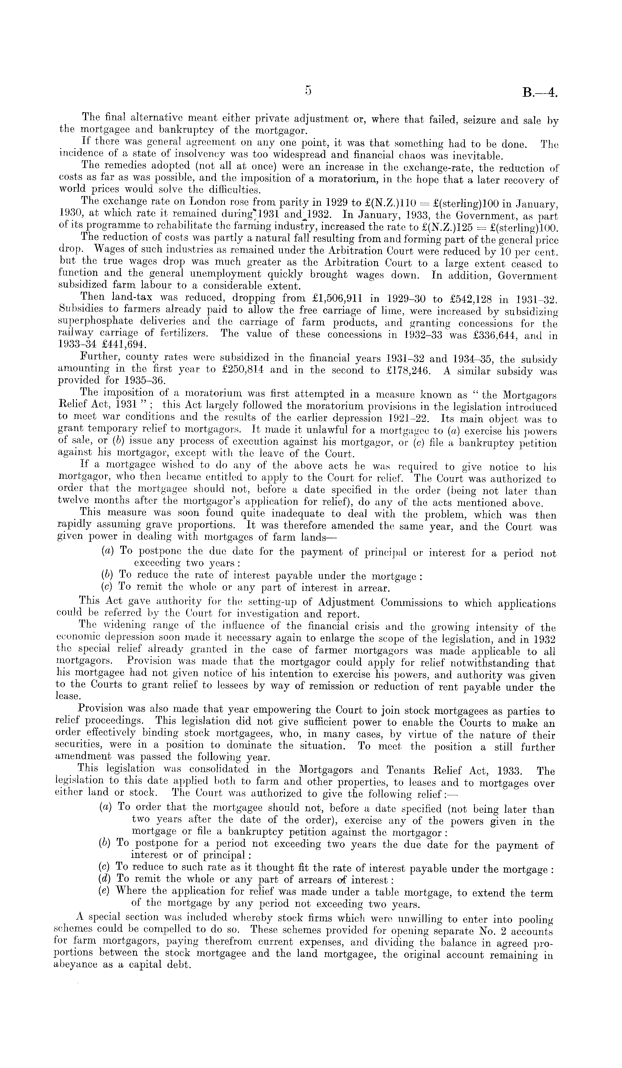 The final alternative meant either private adjustment or, where that failed, seizure and sale by the mortgagee and bankruptcy of the mortgagor. If there was general agreement on any one point, it was that something had to be done. The incidence of a state of insolvency was too widespread and financial chaos was inevitable. The remedies adopted (not all at once) were an increase in the exchange-rate, the reduction of costs as far as was possible, and the imposition of a moratorium, in the hope that a later recovery of world prices would solve the difficulties. The exchange rate on London rose from parity in 1929 to £(N.Z.)110 = £(sterling)loo in January, 1930, at which rate it remained during}l93l and - 1932. In January, 1933, the Government, as part of its programme to rehabilitate the farming industry, increased the rate to £(N.Z.)125 = £(sterling)loo. The reduction of costs was partly a natural fall resulting from and forming part of the general price drop. Wages of such industries as remained under the Arbitration Court were reduced by 10 per cent, but the true wages drop was much greater as the Arbitration Court to a large extent ceased to function and the general unemployment quickly brought wages down. In addition, Government subsidized, farm labour to a considerable extent. Then land-tax was reduced, dropping from £1,506,911 in 1929-30 to £542,128 in 1931-32. Subsidies to farmers already paid to allow the free carriage of lime, were increased by subsidizing superphosphate deliveries and the carriage of farm products, and granting concessions for the railway carriage of fertilizers. The value of these concessions in 1932-33 was £336,644, and in 1933-34 £441,694. Further, county rates were subsidized in the financial years 1931-32 and 1934-35, the subsidy amounting in the first year to £250,814 and in the second to £178,246. A similar subsidy was provided for 1935-36. The imposition of a moratorium was first attempted in a measure known as " the Mortgagors Relief Act, 1931 " ; this Act largely followed the moratorium provisions in the legislation introduced to meet war conditions and the results of the earlier depression 1921-22. Its main object was to grant temporary relief to mortgagors. It made it unlawful for a mortgagee to (a) exercise his powers of sale, or (6) issue any process of execution against his mortgagor, or (c) file a bankruptcy petition against his mortgagor, except with the leave of the Court. If a mortgagee wished to do any of the above acts he was required to give notice to his mortgagor, who then became entitled to apply to the Court for relief. The Court was authorized to order that the mortgagee should not, before a date specified in the order (being not later than twelve months after the mortgagor's application for relief), do any of the acts mentioned above. _ This measure was soon found quite inadequate to deal with the problem, which was then rapidly assuming grave proportions. It was therefore amended the same year, and the Court was given power in dealing with mortgages of farm lands — (a) To postpone the due date for the payment of principal or interest for a period not exceeding two years : (b) To reduce the rate of interest payable under the mortgage : (c) To remit the whole or any part of interest in arrear. This Act gave authority for the setting-up of Adjustment Commissions to which applications could be referred by the Court for investigation and report. The widening range of the influence of the financial crisis and the growing intensity of the economic depression soon made it necessary again to enlarge the scope of the legislation, and in 1932 the special relief already granted in the case of farmer mortgagors was made applicable to all mortgagors. Provision was made that the mortgagor could apply for relief notwithstanding that his mortgagee had not given notice of his intention to exercise his powers, and authority was given to the Courts to grant relief to lessees by way of remission or reduction of rent payable under the lease. Provision was also made that year empowering the Court to join stock mortgagees as parties to relief proceedings. This legislation did not give sufficient power to enable the Courts to make an order efiectively binding stock mortgagees, who, in many cases, by virtue of the nature of their securities, were in a position to dominate the situation. To meet the position a still further amendment was passed the following year. This legislation was consolidated in the Mortgagors and Tenants Relief Act, 1933. The legislation to this date applied both to farm and other properties, to leases and to mortgages over either land or stock. The Court was authorized to give the following relief: — (a) To order that the mortgagee should not, before a date specified (not being later than two years after the date of the order), exercise any of the powers given in the mortgage or file a bankruptcy petition against the mortgagor: (b) To postpone for a period not exceeding two years the due date for the payment of interest or of principal: (c) To reduce to such rate as it thought fit the rate of interest payable under the mortgage : (d) To remit the whole or any part of arrears of interest: (e) Where the application for relief was made under a table mortgage, to extend the term of the mortgage by any period not exceeding two years. A special section was included whereby stock firms which were unwilling to enter into pooling schemes could be compelled to do so. These schemes provided for opening separate No. 2 accounts for farm mortgagors, paying therefrom current expenses, and dividing the balance in agreed proportions between the stock mortgagee and the land mortgagee, the original account remaining in abeyance as a capital debt.