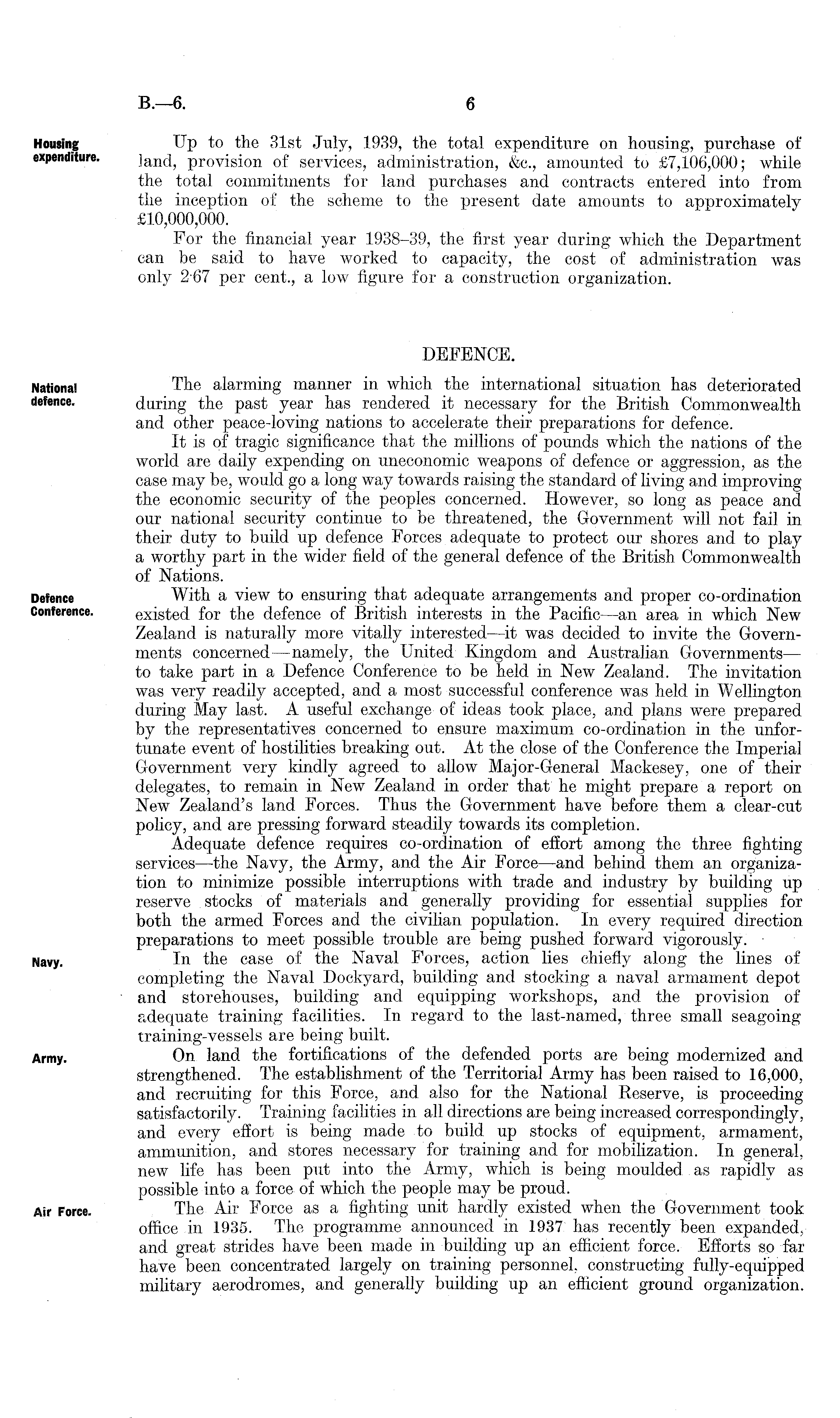 Up to the 31st -July, 1939, the total expenditure on housing, purchase of land, provision of services, administration, &c., amounted to £7,106,000; while the total commitments for land purchases and contracts entered into from the inception of the scheme to the present date amounts to approximately £10,000,000. For the financial year 1938-39, the first year during which the Department can be said to have worked to capacity, the cost of administration was only 2 67 per cent., a low figure for a construction organization. DEFENCE. The alarming manner in which the international situation has deteriorated during the past year has rendered it necessary for the British Commonwealth and other peace-loving nations to accelerate their preparations for defence. It is of tragic significance that the millions of pounds which the nations of the world are daily expending on uneconomic weapons of defence or aggression, as the case may be, would go a long way towards raising the standard of living and improving the economic security of the peoples concerned. However, so long as peace and our national security continue to be threatened, the Government will not fail in their duty to build up defence Forces adequate to protect our shores and to play a worthy part in the wider field of the general defence of the British Commonwealth of Nations. With a view to ensuring that adequate arrangements and proper co-ordination existed for the defence of British interests in the Pacific—an area in which New Zealand is naturally more vitally interested —it was decided to invite the Governments concerned —namely, the United Kingdom and Australian Governments— to take part in a Defence Conference to be held in New Zealand. The invitation was very readily accepted, and a most successful conference was held in Wellington during May last. A useful exchange of ideas took place, and plans were prepared by the representatives concerned to ensure maximum co-ordination in the unfortunate event of hostilities breaking out. At the close of the Conference the Imperial Government very kindly agreed to allow Major-General Mackesey, one of their delegates, to remain in New Zealand in order that he might prepare a report on New Zealand's land Forces. Thus the Government have before them a clear-cut policy, and are pressing forward steadily towards its completion. Adequate defence requires co-ordination of effort among the three fighting services—the Navy, the Army, and the Air Force—and behind them an organization to minimize possible interruptions with trade and industry by building up reserve stocks of materials and generally providing for essential supplies for both the armed Forces and the civilian population. In every required direction preparations to meet possible trouble are being pushed forward vigorously. In the case of the Naval Forces, action lies chiefly along the lines of completing the Naval Dockyard, building and stocking a naval armament depot and storehouses, building and equipping workshops, and the provision of adequate training facilities. In regard to the last-named, three small seagoing training-vessels are being built. On land the fortifications of the defended ports are being modernized and strengthened. The establishment of the Territorial Army has been raised to 16,000. and recruiting for this Force, and also for the National Reserve, is proceeding satisfactorily. Training facilities in all directions are being increased correspondingly, and every effort is being made to build up stocks of equipment, armament, ammunition, and stores necessary for training and for mobilization. In general, new life has been put into the Army, which is being moulded as rapidly as possible into a force of which the people may be proud. The Air Force as a fighting unit hardly existed when the Government took office in 1935. The programme announced in 1937 has recently been expanded, and great strides have been made in building up an efficient force. Efforts so far have been concentrated largely on training personnel, constructing fully-equipped military aerodromes, and generally building up an efficient ground organization.