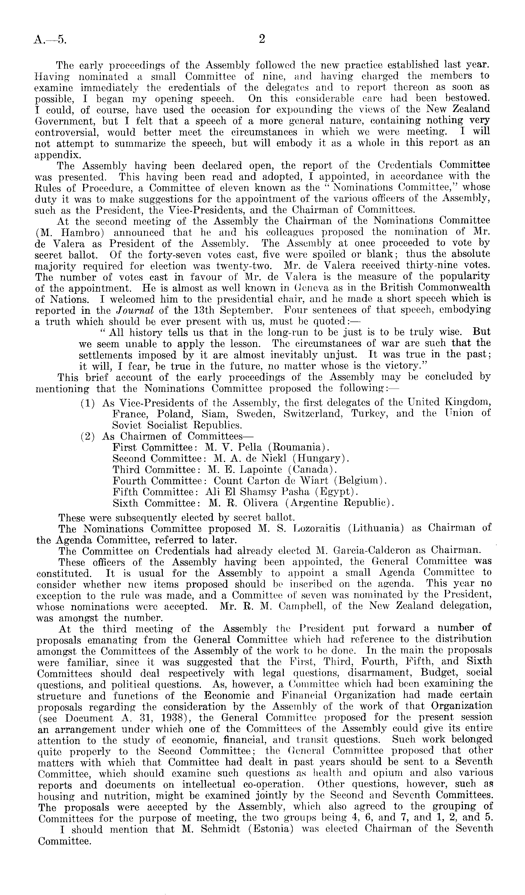 The early proceedings of the Assembly followed the new practice established last year. Having nominated a small Committee of nine, and having charged the members to examine immediately the credentials of the delegates and to report thereon as soon as possible, I began my opening speech. On this considerable care had been bestowed. I could, of course, have used the occasion for expounding the views of the New Zealand Government, but I felt that a speech of a more general nature, containing nothing very controversial, would better meet the circumstances in which we were meeting. I will not attempt to summarize the speech, but will embody it as a whole in this report as an appendix. The Assembly having been declared open, the report of the Credentials Committee was presented. This having been read and adopted, I appointed, in accordance with the Rules of Procedure, a Committee of eleven known as the " Nominations Committee," whose duty it was to make suggestions for the appointment of the various officers of the Assembly, such as the President, the Yice-Presidents, and the Chairman of Committees. At the second meeting of the Assembly the Chairman of the Nominations Committee (M. Hambro) announced that he and his colleagues proposed the nomination of Mr. de Yalera as President of the Assembly. The Assembly at once proceeded to vote by secret ballot. Of the forty-seven votes cast, five were spoiled or blank; thus the absolute majority required for election was twenty-two. Mr. de Yalera received thirty-nine votes. The number of votes cast in favour of Mr. de Valera is the measure of the popularity of the appointment. He is almost as well known in Geneva as in the British Commonwealth of Nations. I welcomed him to the presidential chair, and he made a short speech which is reported in the Journal of the 13th September. Pour sentences of that speech, embodying a truth which should be ever present with us, must be quoted:— " All history tells us that in the long-run to be just is to be truly wise. But we seem unable to apply the lesson. The circumstances of war are such that the settlements imposed by it are almost inevitably unjust. It was true in the past; it will, I fear, be true in the future, no matter whose is the victory." This brief account of the early proceedings of the Assembly may be concluded by mentioning that the Nominations Committee proposed the following:— (1) As Vice-Presidents of the Assembly, the first delegates of the United Kingdom, Prance, Poland, Siam, Sweden, Switzerland, Turkey, and the Union of Soviet Socialist Republics. (2) As Chairmen of Committees— First Committee: M. V. Pella (Roumania). Second Committee: M. A. de Nickl (Hungary). Third Committee: M. E. Lapointe (Canada). Fourth Committee: Count Carton de Wiart (Belgium). Fifth Committee: Ali El Shamsy Pasha (Egypt). Sixth Committee: M. R. Olivera (Argentine Republic). These were subsequently elected by secret ballot. The Nominations Committee proposed M. S. Lozoraitis (Lithuania) as Chairman of the Agenda Committee, referred to later. The Committee on Credentials had already elected M. Garcia-Calderon as Chairman. These officers of the Assembly having been appointed, the General Committee was constituted. It is usual for the Assembly to appoint a small Agenda Committee to consider whether new items proposed should be inscribed on the agenda. This year no exception to the rule was made, and a Committee of seven was nominated by the President, whose nominations were accepted. Mr. R. M. Campbell, of the New Zealand delegation, was amongst the number. At the third meeting of the Assembly the President put forward a number of proposals emanating from the General Committee which had reference to the distribution amongst the Committees of the Assembly of the work to be done. In the main the proposals were familiar, since it was suggested that the First, Third, Fourth, Fifth, and Sixth Committees should deal respectively with legal questions, disarmament, Budget, social questions, and political questions. As, however, a Committee which had been examining the structure and functions of the Economic and Financial Organization had made certain proposals regarding the consideration by the Assembly of the work of that Organization (see Document A. 31, 1938), the General Committee proposed for the present session an arrangement under which one of the Committees of the Assembly could give its entire attention to the study of economic, financial, and transit questions. Such work belonged quite properly to the Second Committee; the General Committee proposed that other matters with which that Committee had dealt in past years should be sent to a Seventh Committee, which should examine such questions as health and opium and also various reports and documents on intellectual co-operation. Other questions, however, such as housing and nutrition, might be examined jointly by the Second and Seventh Committees. The proposals were accepted by the Assembly, which also agreed to the grouping of Committees for the purpose of meeting, the two groups being 4, 6, and 7, and 1, 2, and 5. I should mention that M. Schmidt (Estonia) was elected Chairman of the Seventh Committee.