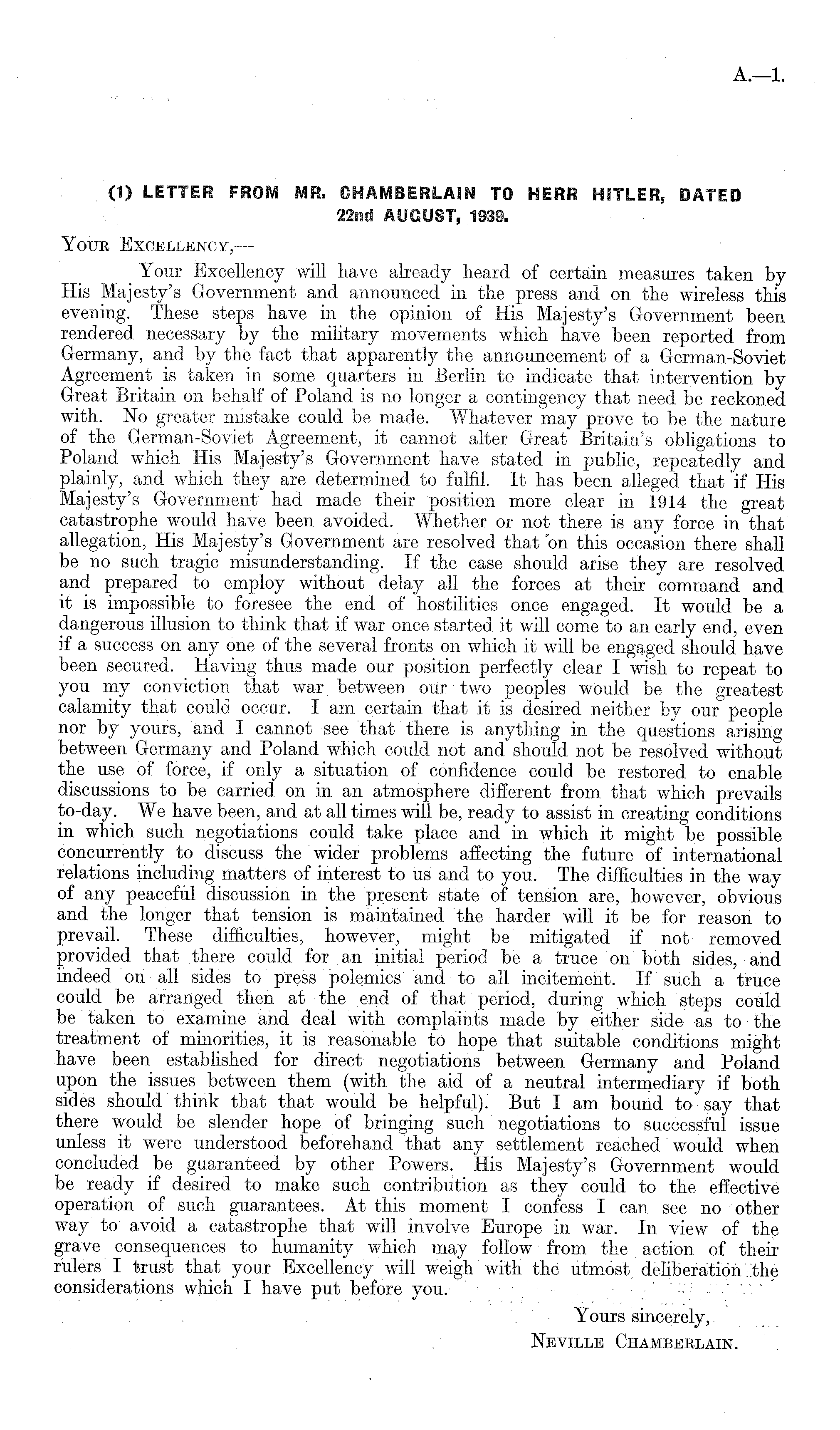 (t) LETTER FROM MR, CH AIVIBERLAS W TO MERR HSTLER, DATED 22nsd AUGUST, 1939. Yotjr Excellency,— Your Excellency will have already heard of certain measures taken by His Majesty's Government and announced in the press and 011 the wireless this evening. These steps have in the opinion of His Majesty's Government been rendered necessary by the military movements which have been reported from Germany, and by the fact that apparently the announcement of a German-Soviet Agreement is taken in some quarters in Berlin to indicate that intervention by Great Britain on behalf of Poland is no longer a contingency that need be reckoned with. No greater mistake could be made. Whatever may prove to be the nature of the German-Soviet Agreement, it cannot alter Great Britain's obligations to Poland which His Majesty's Government have stated in public, repeatedly and plainly, and which they are determined to fulfil. It has been alleged that if His Majesty's Government had made their position more clear in 1914 the great catastrophe would have been avoided. Whether or not there is any force in that allegation, His Majesty's Government are resolved that 'on this occasion there shall be no such tragic misunderstanding. If the case should arise they are resolved and prepared to employ without delay all the forces at their command and it is impossible to foresee the end of hostilities once engaged. It would be a dangerous illusion to think that if war once started it will come to an early end, even if a success on any one of the several fronts on which it will be engaged should have been secured. Having thus made our position perfectly clear I wish to repeat to you my conviction that war between our two peoples would be the greatest calamity that could occur. I am certain that it is desired neither by our people nor by yours, and I cannot see that there is anything in the questions arising between Germany and Poland which could not and should not be resolved without the use of force, if only a situation of confidence could be restored to enable discussions to be carried on in an atmosphere different from that which prevails to-day. We have been, and at all times will be, ready to assist in creating conditions in which such negotiations could take place and in which it might be possible concurrently to discuss the wider problems affecting the future of international relations including matters of interest to us and to you. The difficulties in the way of any peaceful discussion in the present state of tension are, however, obvious and the longer that tension is maintained the harder will it be for reason to prevail. These difficulties, however, might be mitigated if not removed provided that there could, for an initial period be a truce on both sides, and indeed on all sides to press polemics and to all incitement. If such a truce could be arranged then at the end of that period, during which steps could be taken to examine and deal with complaints made by either side as to the treatment of minorities, it is reasonable to hope that suitable conditions might have been established for direct negotiations between Germany and Poland upon the issues between them (with the aid of a neutral intermediary if both sides should think that that would be helpful). But I am bound to say that there would be slender hope of bringing such negotiations to successful issue unless it were understood beforehand that any settlement reached would when concluded be guaranteed by other Powers. His Majesty's Government would be ready if desired to make such contribution as they could to the effective operation of such guarantees. At this moment I confess I can see no other way to avoid a catastrophe that will involve Europe in war. In view of the grave consequences to humanity which may follow from the action of their rulers I trust that your Excellency will weigh with the utmost deliberation the considerations which I have put before you. Yours sincerely, Neville Chamberlain.