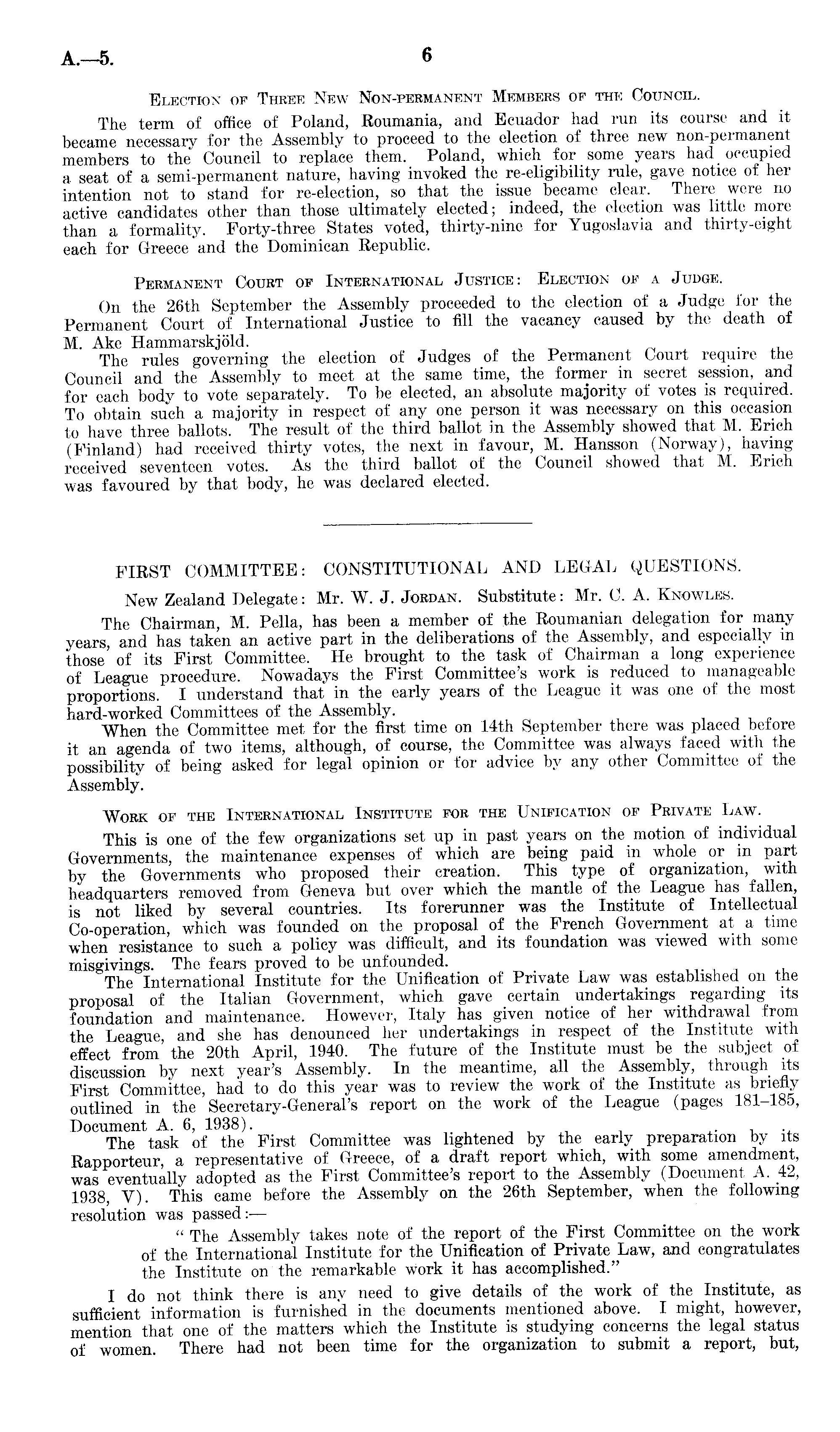 Election of Three New Non-permanent Members of the Council. The term of office of Poland, Roumania, and Ecuador had run its course and it became necessarv for the Assembly to proceed to the election of three new non-permanent members to the Council to replace them. Poland, which for some years had occupied a seat of a semi-permanent nature, having invoked the re-eligibility rule, gave notice of her intention not to stand for re-election, so that the issue became clear. There were no active candidates other than those ultimately elected; indeed, the election was little more than a formality. Forty-three States voted, thirty-nine for Yugoslavia and thirty-eight each for Greece and the Dominican Republic. PERMANENT COURT OF INTERNATIONAL JUSTICE: ELECTION OF A JUDGE. On the 26th September the Assembly proceeded to the election of a Judge for the Permanent Court of International Justice to fill the vacancy caused by the death of M. Ake Hammarskjold. , . The rules governing the election of Judges of the Permanent Court require the Council and the Assembly to meet at the same time, the former in secret session, and for each body to vote separately. To be elected, an absolute majority of votes is required. To obtain such a majority in respect of any one person it was necessary on this occasion to have three ballots.' The result of the third ballot in the Assembly showed that. M. Erich (Finland) had received thirty votes, the next in favour, M. Hansson (Norway), having received seventeen votes. As the third ballot of the Council showed that M. Erich was favoured by that body, he was declared elected. FIRST COMMITTEE: CONSTITUTIONAL AND LEGAL QUESTIONS. New Zealand Delegate: Mr. W. J. Jordan. Substitute: Mr. C. A. Knowles. The Chairman, M. Pella, has been a member of the Roumanian delegation for many years, and has taken an active part in the deliberations of the Assembly, and especially in those of its First Committee. He brought to the task of Chairman a long experience of League procedure. Nowadays the First Committee's work is reduced to manageable proportions. I understand that in the early years of the League it was one of the most hard-worked Committees of the Assembly. , , r , When the Committee met for the first time on 14th September there was placed betore it an agenda of two items, although, of course, the Committee was always faced with the possibility of being asked for legal opinion or for advice by any other Committee of the Assembly. Work of the International Institute for the Unification of Private Law. This is one of the few organizations set up in past years on the motion of individual Governments, the maintenance expenses of which are being paid in whole or m part by the Governments who proposed their creation. This type of organization, with headquarters removed from Geneva but over which the mantle of the League has fallen, is not liked by several countries. Its forerunner was the Institute of Intellectual Co-operation, which was founded on the proposal of the French Government at a time when resistance to such a policy was difficult, and its foundation was viewed with some misgivings. The fears proved to be unfounded. The International Institute for the Unification of Private Law was established on the proposal of the Italian Government, which gave certain undertakings regarding its foundation and maintenance. However, Italy has given notice of her withdrawal from the League, and she has denounced her undertakings in respect of the Institute with effect from the 20th April, 1940. The future of the Institute must be the subject of discussion by next year's Assembly. In the meantime, all the Assembly, through its First Committee, had to do this year was to review the work of the Institute as briefly outlined in the Secretary-General's report on the work of the League (pages 181-185, Document A. 6, 1938). The task of the First Committee was lightened by the early preparation by its Rapporteur, a representative of Greece, of a draft report which, with some amendment, was eventually adopted as the First Committee's report to the Assembly (Document A. 42, 1938, V). This came before the Assembly on the 26th September, when the following resolution was passed:— " The Assembly takes note of the report of the First Committee on the work of the International Institute for the Unification of Private Law, and congratulates the Institute on the remarkable work it has accomplished." I do not think there is any need to give details of the work of the Institute, as sufficient information is furnished in the documents mentioned above. I might, however, mention that one of the matters which the Institute is studying concerns the legal status of women. There had not been time for the organization to submit a report, but,