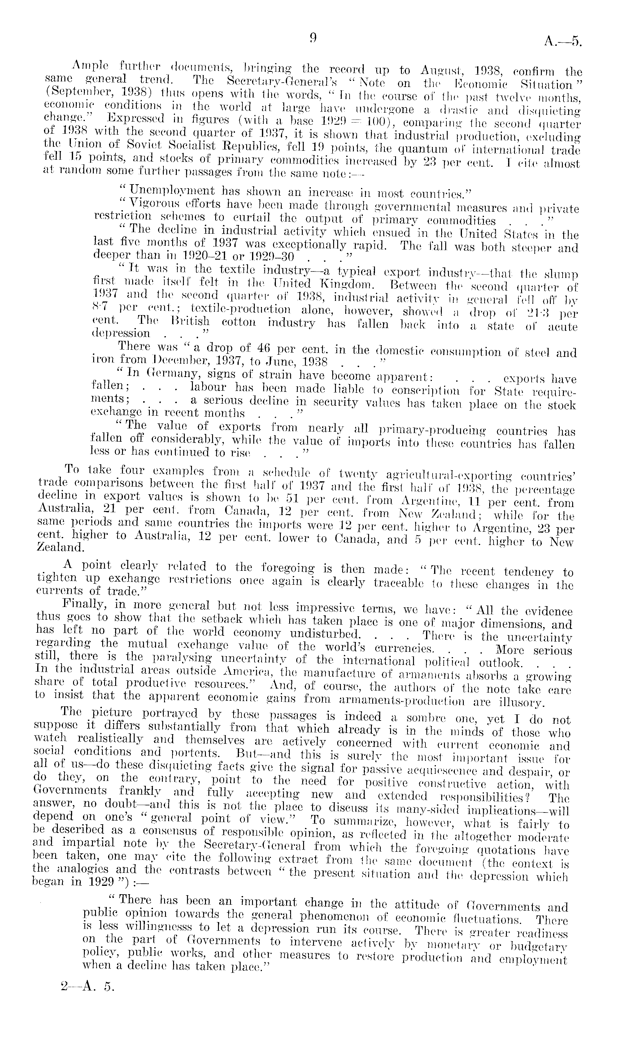 Ample further documents, bringing the record up to August, 1938, confirm the same general trend. The Secretary-General's "Note on the Economic Situation" (September, 1938) thus opens with the words, " In the course of the past twelve months economic conditions m the world at large have undergone a drastic and disquieting .® x Pf eSSed m , figUres (with a base 1929 = 10 °). comparing the second quarter o .938 with the second quarter of 1937, it is shown that industrial production, excluding the Union of Soviet Socialist Republics, fell 19 points, the quantum of international trade ten J.& points, and stocks of primary commodities increased by 23 per cent. I cite almost at random some further passages from the same note:— u Unemployment has shown an increase in most countries." _ Vigorous efforts have been made through governmental measures and private restriction schemes to curtail the output of primary commodities " ''The decline in industrial activity which ensued in the United States'in the last five months of 1937 was exceptionally rapid. The fall was both steeper and deeper than m 1920-21 or 1929-30 ..." "It was in the textile industry—a typical export industry—that the slump made ,? tse 111 the United Kingdom. Between the second quarter of .37 and the second quarter of 1938, industrial activity in general fell off by per cent.; textile-production alone, however, showed a drop of 21-3 per depression 0 IS £ C ° tton industr y has fallen back into a state of acute There was a drop of 46 per cent, in the domestic consumption of steel and iron from December, 1937, to June, 1938 ..." In Germany, signs of strain have become apparent: . . . exports have a en; • • • labour has been made liable to conscription for State requirements; . _ . . a serious decline in security values has taken place on the stock exchange m recent months ..." ■t n val ?e °| ! exports from nearly all primary-producing countries has fallen off considerably, while the value of imports into these countries has fallen less or has continued to rise ..." To take four examples from a schedule of twenty agricultural-exporting countries' trade comparisons between the first half of 1937 and the first half of 1938, the percentage decline m export values is shown to be 51 per cent, from Argentine, 11 per cent, from Australia, 21 per cent, from Canada, 12 per cent, from New Zealand; while for the same periods and same countries the imports were 12 per cent, higher to Argentine, 23 per Zealand 6r Allstralia > 12 P er cent, lower to Canada, and 5 per cent, higher to New 1-htt, C if arly relat< r dto the foregoing is then made: "The recent tendency to currents of ° nS ° nCe agam is clearly traceable to these changes in the Finally, m more general but not less impressive terms, we have: "All the evidence has 8 lefT-nn ! T J a l the se s ack which has taken place is one of major dimensions, and has left no part of the world economy undisturbed. . . . There is the uncertainty regarding the mutual exchange value of the world's currencies. . . . More serious still there is the paralysing uncertainty of the international political outlook. 3 1 a i' ea +- outside America, the manufacture of armaments absorbs a growing to S P™ ductlve resources. And, of course, the authors of the note take care insist that the apparent economic gams from armaments-production are illusory „ Th 6 P° r } ra y ed these passages is indeed a sombre one, yet Ido not suppose it differs substantially from that which already is in the minds of those who watch realistically and themselves are actively concerned with current economic and social conditions and portents. But-and this is surely the most important Sue for all of us—do these disquieting facts give the signal for passive acquiescence and despair or T the contrary, point to the need for positive constructive action with Governments frankly and fully accepting new and extended The answer, no doubt-and this is not the place to discuss its many-sided implications-will depend on one's "general point of view." To summarize, however, what is faMy to be described as a consensus of responsible opinion, as reflected in the altogether moderate and impartial note by the Secretary-General from which the foregoing quotatiZ have been taken, one may cite the following extract from the same document (the context is began n S° C ° ntraStS between " the P res ent situation and the depression which "There has been an important change in the attitude of Governments and pub ic opinion towards the general phenomenon of economic fluctuations There on tbe W i g nrp to a ? ep f ssion run its eo ™ There is greater readiness on the part of Governments to intervene actively by monetary or budgetary policy, public works, and other measures to restore production and employment when a decline has taken place." wmtsui