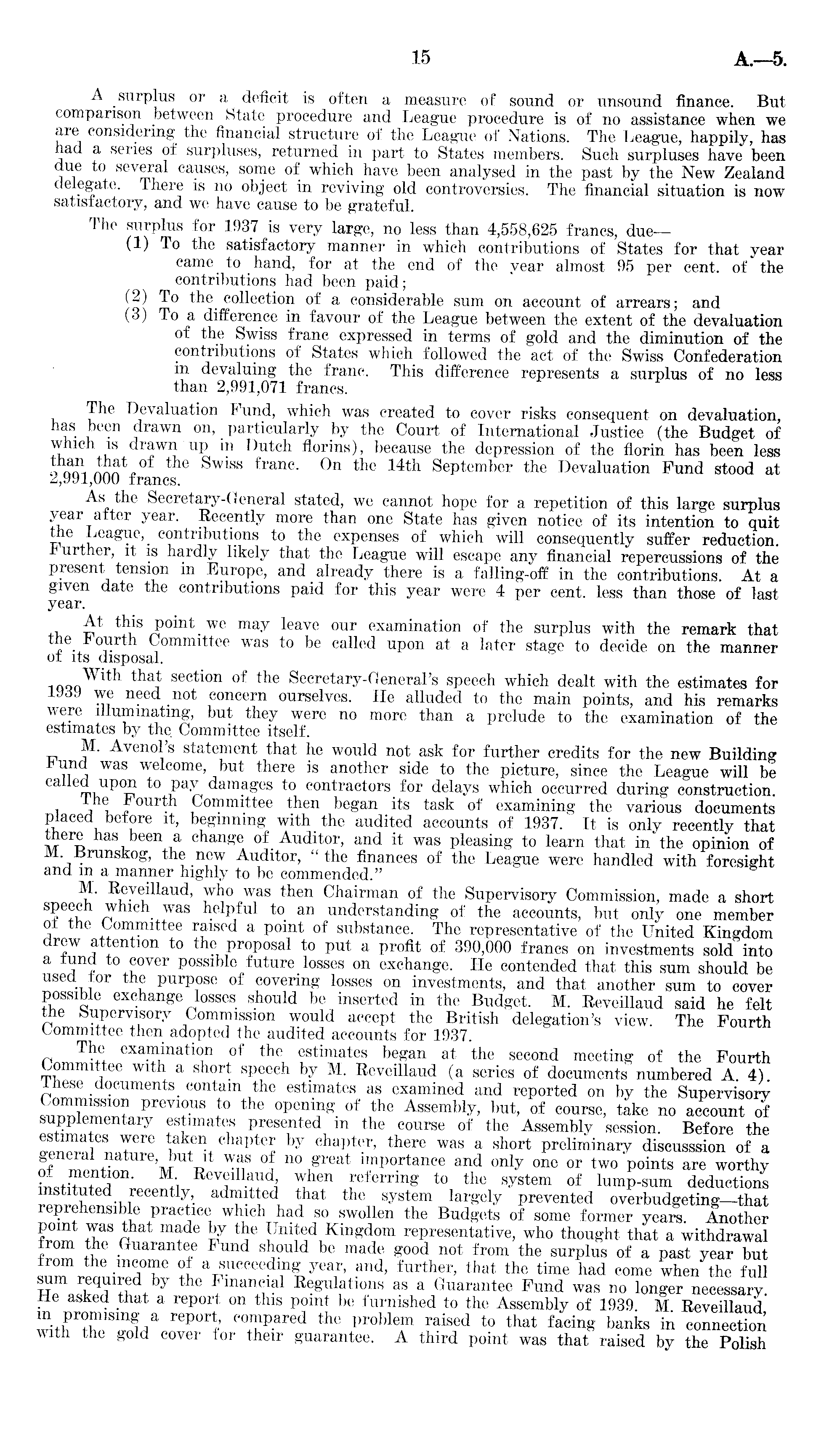 A surplus or a deficit is often a measure of sound or unsound finance. But comparison between State procedure and League procedure is of no assistance when we are considering the financial structure of the League of Nations. The League, happily, has had a series of surpluses, returned in part to States members. Such surpluses have been due to several causes, some of which have been analysed in the past by the New Zealand delegate. There is no object in reviving old controversies. The financial situation is now satisfactory, and we have cause to be grateful. The surplus for 1937 is very large, no less than 4,558,625 francs, due— (1) To the satisfactory manner in which contributions of States for that year came to hand, for at the end of the year almost 95 per cent, of the contributions had been paid; (2) To the collection of a considerable sum on account of arrears; and (•3) To a difference in favour of the League between the extent of the devaluation of the Swiss franc expressed in terms of gold and the diminution of the contributions of States which followed the act of the Swiss Confederation in devaluing the franc. This difference represents a surplus of no less than 2,991,071 francs. The Devaluation Fund, which was created to cover risks consequent on devaluation, I s ;; )een , awn on '. particularly by the Court of International Justice (the Budget of which is drawn up in Dutch florins), because the depression of the florin has been less ™ nnnV f the Swiss franc " 0n the 14th September the Devaluation Fund stood at <£,"91,000 francs. As the Secretary-General stated, we cannot hope for a repetition of this large surplus year after year. Recently more than one State has given notice of its intention to quit the contributions to the expenses of which will consequently suffer reduction, further, it is hardly likely that the League will escape any financial repercussions of the present tension m Europe, and already there is a falling-off in the contributions. At a given date the contributions paid for this year were 4 per cent, less than those of last year. ™ 1 th u is J ,oint . we may leave our examination of the surplus with the remark that ourth Committee was to be called upon at a later stage to decide on the manner o± its disposal. iQQO WIth tha ! section of the Secretary-General's speech which dealt with the estimates for u,u need , n °t concern ourselves. He alluded to the main points, and his remarks were illuminating, but they were no more than a prelude to the examination of the estimates by the. Committee itself. M. Avenol's statement that he would not ask for further credits for the new Building -bund was welcome, but there is another side to the picture, since the League will be called upon to pay damages to contractors for delays which occurred during construction. i j u * ou . Committee then began its task of examining the various documents placed before it, beginning with the audited accounts of 1937. It is only recently that there has been a change of _ Auditor, and it was pleasing to learn that in the opinion of . Brunskog, the new Auditor, "the finances of the League were handled with foresight and m a manner highly to be commended." ¥' Reveillaud, who was then Chairman of the Supervisory Commission, made a short n• WaS ¥ lp n ful tO . an understanding of the accounts, but only one member o the Committee raised a point of substance. The representative of the United Kingdom drew attention to the proposal to put a profit of 390,000 francs on investments sold into a una to cover possible future losses on exchange. He contended that this sum should be used tor the purpose of covering losses on investments, and that another sum to eover possible exchange losses should be inserted in the Budget. M. Reveillaud said he felt ttie Supervisory Commission would accept the British delegation's view. The Fourth Committee then adopted the audited accounts for 1937. The examination of the estimates began at the second meeting of the Fourth Committee with a short speech by M. Reveillaud (a series of documents numbered A. 4). these documents contain the estimates as examined and reported on by the Supervisory ? rev \ oust 0+ t0 the °P eni ?£. of the Assembly, but, of course, take no account of supplementary estimates presented m the course of the Assembly session. Before the estimates were taken chapter by chapter, there was a short preliminary diseusssion of a general naturebutit was of no great importance and only one or two points are worthy Reveillaud when referring to the system of lump-sum deductions instituted recently, admitted that the system largely prevented overbudgeting—that repre lensible practice which had so swollen the Budgets of some former years. Another point was that made by the United Kingdom representative, who thought that a withdrawal rom the Guarantee Pund should be made good not from the surplus of a past year but from the income of a succeeding year, and, further, that the time had come when the full sum required by the Financial Regulations as a Guarantee Fund was no longer necessary. Me asked that a report on this point be furnished to the Assembly of 1939. M Reveillaud m promising a report, compared the problem raised to that facing banks in connection with the gold cover for their guarantee. A third point was that raised by the Polish
