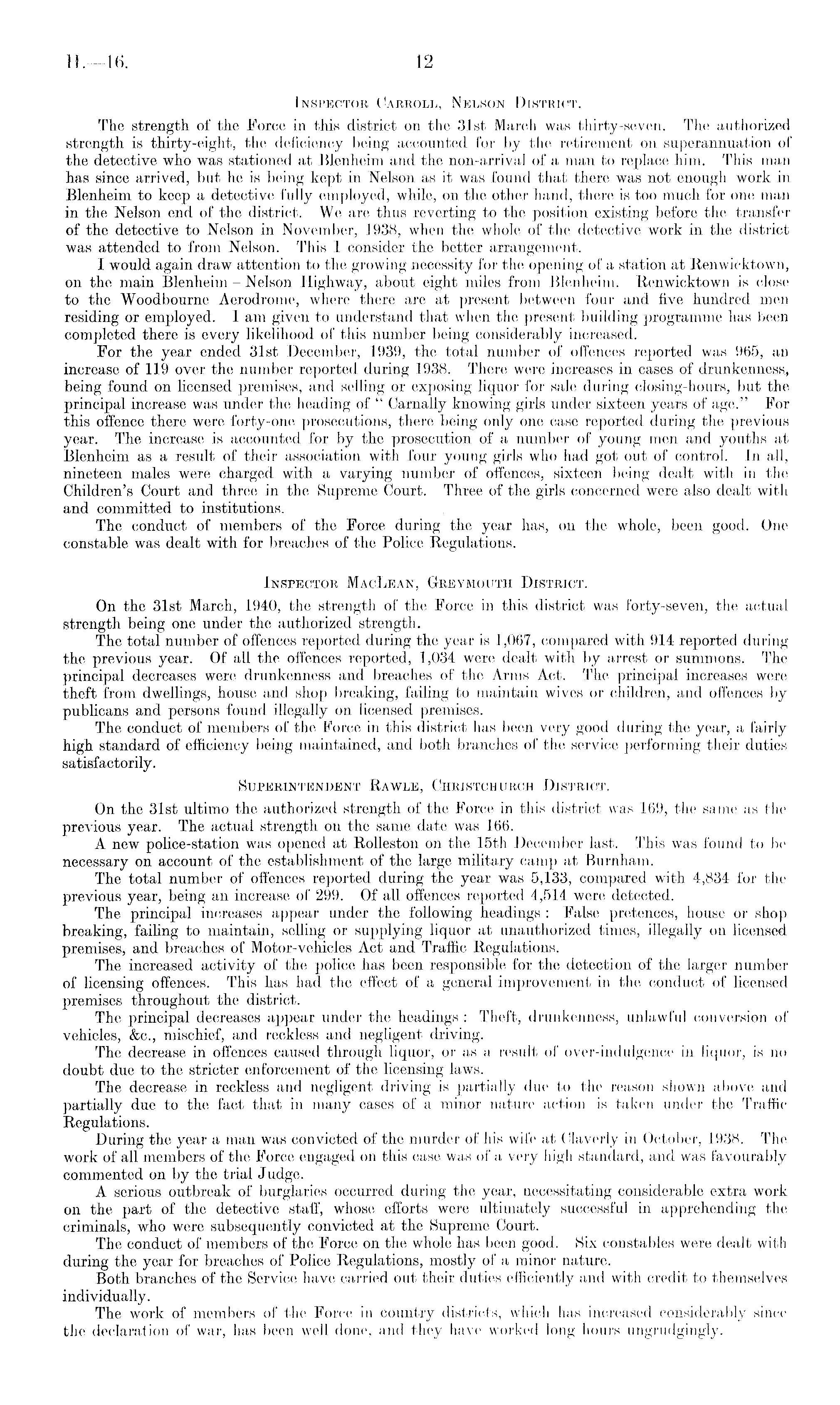 Inspector Carroll, Nelson District. The strength of the Force in this district on the 31st March was thirty-seven. The authorized strength is thirty-eight, the deficiency being accounted for by the retirement on superannuation of the detective who was stationed at Blenheim and the non-arrival of a man to replace him. This man has since arrived, but he is being kept in Nelson as it was found that there was not enough work in Blenheim to keep a detective fully employed, while, on the other hand, there is too much for one man in the Nelson end of the district. We are thus reverting to the position existing before the transfer of the detective to Nelson in November, 1938, when the whole of the detective work in the district was attended to from Nelson. This I consider the better arrangement. I would again draw attention to the growing necessity for the opening of a station at Renwicktown, on the main Blenheim - Nelson Highway, about eight miles from Blenheim. Renwicktown is close to the Woodbourne Aerodrome, where there are at present between four and five hundred men residing or employed. lam given to understand that when the present building programme has been completed there is every likelihood of this number being considerably increased. For the year ended 31st December, 1939, the total number of offences reported was 965, an increase of 119 over the number reported during 1938. There were increases in cases of drunkenness,, being found on licensed premises, and selling or exposing liquor for sale during closing-hours, but the principal increase was under the heading of " Carnally knowing girls under sixteen years of age." For this offence there were forty-one prosecutions, there being only one case reported during the previous year. The increase is accounted for by the prosecution of a number of young men and youths at Blenheim as a result of their association with four young girls who had got out of control. In all, nineteen males were charged with a varying number of offences, sixteen being dealt with in the Children's Court and three in the Supreme Court. Three of the girls concerned were also dealt with and committed to institutions. The conduct of members of the Force during the year has, on the whole, been good. One constable was dealt with for breaches of the Police Regulations. Inspector Mac Lean, Greymouth District. On the 31st March, 1940, the strength of the Force in this district was forty-seven, the actual strength being one under the authorized strength. The total number of offences reported during the year is 1,067, compared with 914 reported during the previous year. Of all the offences reported, 1,034 were dealt with by arrest or summons. The principal decreases were drunkenness and breaches of the Arms Act. The principal increases were theft from dwellings, house and shop breaking, failing to maintain wives or children, and offences by publicans and persons found illegally on licensed premises. The conduct of members of the Force in this district has been very good during the year, a fairly high standard of efficiency being maintained, and both branches of the service performing their duties satisfactorily. Superintendent Rawle, Christchukch District. On the 31st ultimo the authorized strength of the Force in this district was 169, the same as the previous year. The actual strength on the same date was 166. A new police-station was opened at Rolleston on the 15th December last. This was found to be necessary on account of the establishment of the large military camp at Burnham. The total number of offences reported during the year was 5,133, compared with 4,834 for the previous year, being an increase of 299. Of all offences reported 4,514 were detected. The principal increases appear under the following headings : False pretences, house or shop breaking, failing to maintain, selling or supplying liquor at unauthorized times, illegally on licensed premises, and breaches of Motor-vehicles Act and Traffic Regulations. The increased activity of the police has been responsible for the detection of the larger number of licensing offences. This has had the effect of a general improvement in tlie conduct of licensed premises throughout the district. The principal decreases appear under the headings : Theft, drunkenness, unlawful conversion of vehicles, &c., mischief, and reckless and negligent driving. The decrease in offences caused through liquor, or as a result of over-indulgence in liquor, is no doubt due to the stricter enforcement of the licensing laws. The decrease in reckless and negligent driving is partially due to the reason shown above and partially due to the fact that in many cases of a minor nature action is taken under the Traffic Regulations. During the year a man was convicted of the murder of his wife at Claverly in October, 1938. The work of all members of the Force engaged on this case was of a very high standard, and was favourably commented on by the trial Judge. A serious outbreak of burglaries occurred during the year, necessitating considerable extra work on the part of the detective staff, whose efforts were ultimately successful in apprehending the criminals, who were subsequently convicted at the Supreme Court. The conduct of members of the Force on the whole has been good. Six constables were dealt with during the year for breaches of Police Regulations, mostly of a minor nature. Both branches of the Service have carried out their duties efficiently and with credit to themselves individually. The work of members of the Force in country districts, which has increased considerably since the declaration of war, has been well done, and they have worked long hours ungrudgingly.