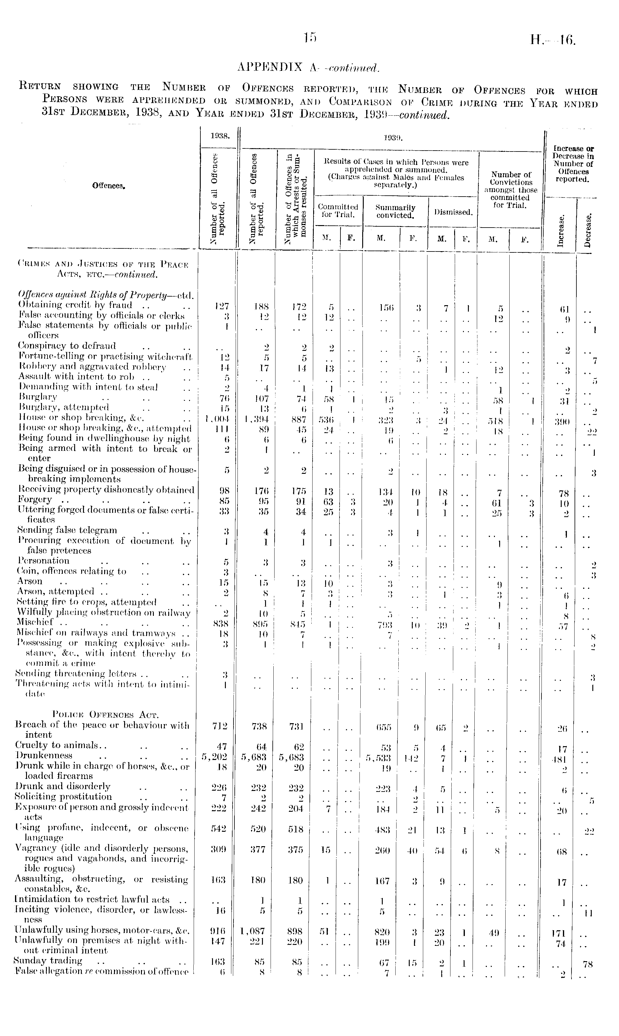 APPENDIX A—continued. Return showing the Number of Offences reported, the Number of Offences for which Persons were apprehended or summoned, and Comparison of Crime during the Year ended 31st December, 1938, and Year ended 31st December, 1939—continued.