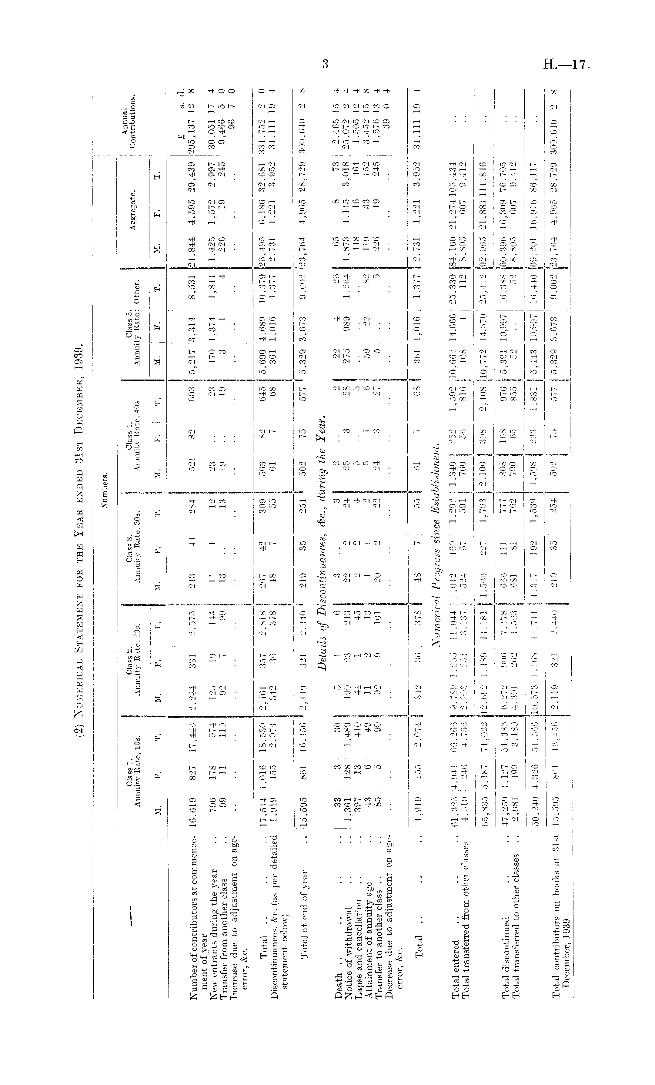 Numbers. Class 1. Class 2. Class 3. Class 4. Class 5. A«wn-P<m*« rnntribntinnB Annuity Rate, 10s. Annuity Rate. 20s. Annuity Rate, 30s. Annuity Rate, 40s, Annuity Rate: Other. ss s • M. j F. | T. M. F. T. M. j F. I T. M. F. | T. M. F. ( T. M. F. T. L j ' £ s. d. Number of contributors at commence- 16,619 827 17,446 2,244 331 2,575 243 41 284 521 82 603 5,217 3,314 8,531 24,844 4,595 29,439 295,137 12 8 ment of year New entrants during the year .. 796 178 974 125 19 144 11 1 12 23 .. 23 470 1,374 1,844 1,425 1,5/2 2,997 30,0ol 17 4 Transfer from another class .. 99 11 110 92 7 99 13 13 19 19 3 1 4 226 19 245 9,466 5 0 Increase due to adjustment on age- .. .. • • • • • • • • • • • • • • • • • • • • .... .. .. .. .. 96 7 0 error, &c. j Total .. .. .. 17,514 1,016 18,530 2,461 357 2,818 267 42 309 563 1 82 i 645 5,690 4,689 10,379 26,495 j 6,186 32,681 334,752 2 0 Discontinuances, &c. (as per detailed 1,919 155 2,074 342 36 378 48 7 55 61 7 68 361 1,016 1,377 2,731 1,221 3,952 34,111 19 4 statement below) I j | Total at end of year .. 15,595 861 16,456 2,119 321 2,440 ! 219 1 35 254 502 1 75 1 577 5,329 3,673 9,002 23,764 4,965 28,729 300,640 2 8 Details of Discontinuances, &c., during the Year. Death 33 3 36 5 1 6 3| .. 3 2 2 22 j 4 | 26 65 8 73 2,465 15 4 Notice of withdrawal .. .. 1,361 128 1,489 190 23 213 22 j 2 24 25 3 28 275 989 ; 1,264 1,873 1,145 3,018 25,072 2 4 Lapse and cancellation .. .. 397 13 410 44 1 45 2 2 4 5 5 .. .. .. 448 16 464 1,505 12 4 Attainment of annuity age .. 43 6 49 11 2 13 1 1 2 5 1 6 59 23 82 119 33 152 3,452 15 8 Transfer to another class .. .. 85 5 90 92 9 101 20 2 22 24 3 j 27 5 5 226 19 245 1,5/6 13 4 Decrease due to adjustment on age- .. .. •. . . .. .. . • • • • • • • • • • • • • • • • • • • • • • • ; 39 0 4 error, &c. Total .. .. .. 1,919 155 2,074 342 36 378 48 7 55 61 7 68 361 1,016 1 1,377 2,731 1,221 3,952 34,111 19 4 Numerical Progress since Establishment. Total entered .. .. .. 61,325 4,941 06,266 9,789 1,255 11,044 1,042 1 160] 1,202 j 1,340 252 1,592 10,664 14,666 25,330 84,160 j21,2741105, 434 I Total transferred from other classes 4,510 246 4,756 2,903 234 3,137 524 6* : o91 j 760 56 816 108 4 112 8,805 60/ 9,412 65,835 5,187 71,022 12,692 1,489 14,181 1,566 227 1,793 2,100 308 2,408 10,772 14,670 j 25,442 92,965 21,881114,846 Total discontinued .. .. 47,259 4,127 51,386 6,272 906 7,178 666 111! 777 808 168 976 5,391 10,997 16,388 60,396 16,309 76,705 Total transferred to other classes .. 2,981 199 3,180 4,301 262 4,563 681 81 762 '90 65 855 52 52 8,805 607 9,412 50,240 4,326 54,566 10,573 1,168 11,741 1,347 192 1,539 1,598 233 1,831 5,443 10,997 16,440 69,201 16,916 86,117 Total contributors on books at 31st 15,595 861 16,456 2,119 321 2,440 219 35 254 502 75 577 5,329 3,673 9,002 123,764 4,965 28,729 j300, 640 2 8 December, 1939 ; I