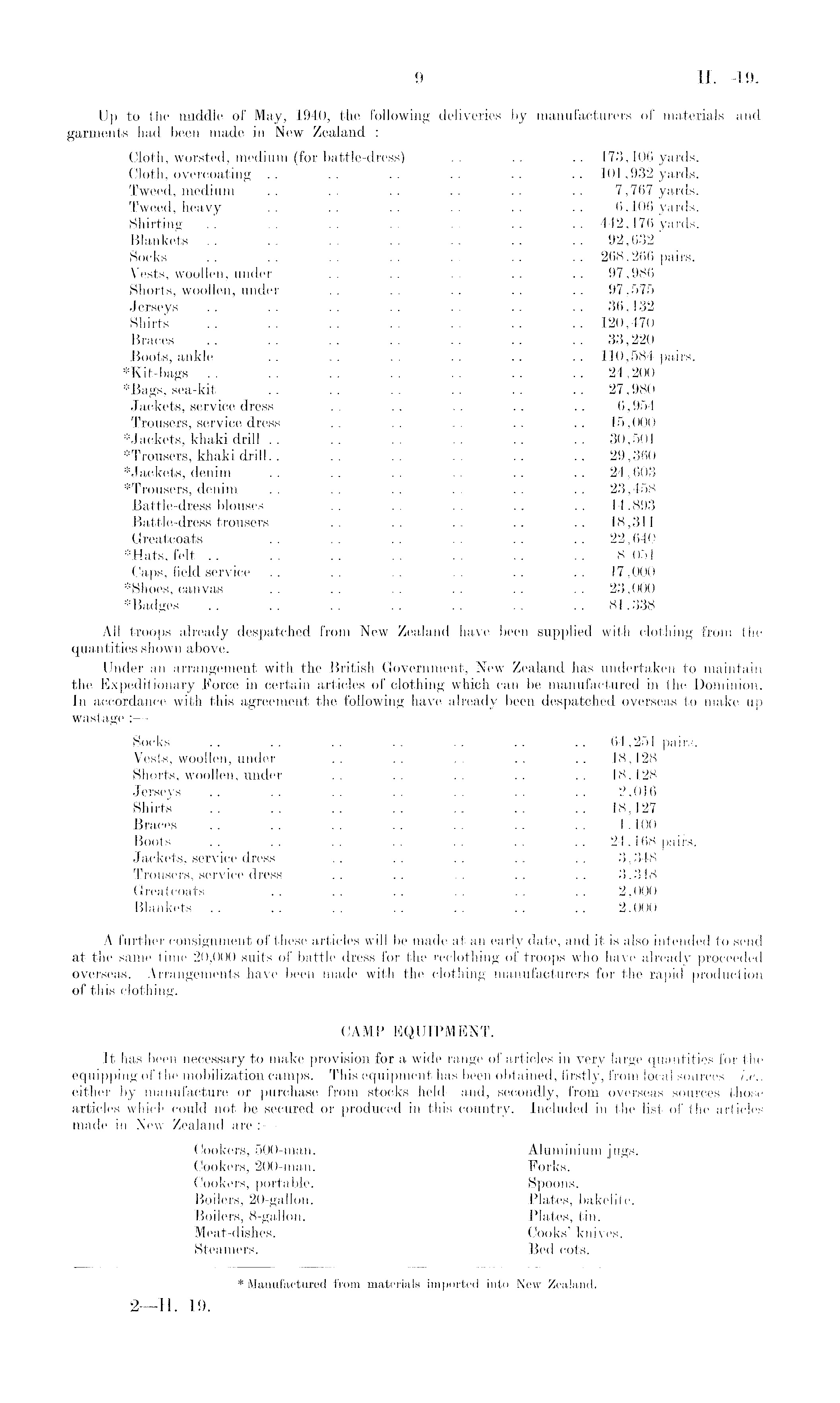 Up to the middle of May, 1940, the following deliveries by manufacturers of materials and garments had been made in New Zealand : Cloth, worsted, medium (for battle-dress) .. .. .. 173,106 yards. Cloth, overcoating .. .. .. .. .. .. 101,932 yards. Tweed, medium .. .. .. .. .. .. 7,767 yards. Tweed, heavy .. .. .. .. .. .. 6,106 yards. Shirting .. .. .. .. .. .. .. 442,176 yards. Blankets .. .. .. .. .. .. .. 92,632 Socks .. .. .. .. .. .. .. 268,266 pairs. Vests, woollen, under .. .. .. .. .. 97,986 Shorts, woollen, under .. .. .. .. .. 97,575 Jerseys .. .. .. .. .. .. .. 36,132 Shirts .. .. .. .. .. .. .. 120,470 Braces .. .. .. .. .. .. 33,220 Boots, ankle .. .. .. .. .. .. 110,584 pairs. *Kit-bags .. .. .. .. .. .. 24,200 *Bags, sea-kit .. .. .. .. .. 27,980 Jackets, service dress .. .. .. .. .. 6,954 Trousers, service dress .. .. .. .. .. 15,000 * Jackets, khaki drill .. .. .. .. .. .. 30,501 *Trousers, khaki drill.. .. .. .. .. .. 29,360 * Jackets, denim .. .. .. .. .. .. 24,603 *Trousers, denim .. .. .. .. .. 23,458 Battle-dress blouses .. .. .. .. .. 14,893 Battle-dress trousers .. .. .. .. .. 18,311 Greatcoats .. .. . . .. .. 22,640 *Hats, felt .. .. .. .. .. .. .. 8 051 Caps, field service .. .. .. .. .. 17,000 * Shoes, canvas .. .. .. .. .. .. 23,000 *Badges .. .. .. .. .. .. .. 81,338 All troops already despatched from New Zealand have been supplied with clothing from the quantities shown above. Under an arrangement with the British Government, New Zealand has undertaken to maintain the Expeditionary Force in certain articles of clothing which can be manufactured in the Dominion. In accordance with this agreement the following have already been despatched overseas to make up wastage : — Socks .. .. .. .. .. .. .. 64,251 pairs. Vests, woollen, under .. .. .. .. .. 18,128 Shorts, woollen, under .. .. .. .. .. 18,128 Jerseys .. .. .. .. .. .. .. 2,016 Shirts .. .. .. .. .. .. .. 18,127 Braces . . .. .. . . . . .. .. 1,100 Boots .. .. .. .. .. .. .. 24,168 pairs. Jackets, service dress .. .. .. .. .. 3,348 Trousers, service dress .. . . . . .. .. 3,348 Greatcoats .. .. .. .. .. .. 2,000 Blankets .. .. .. .. .. .. .. 2,000 A further consignment of these articles will be made at an early date, and it is also intended to send at the same time 20,000 suits of battle dress for the reclothing of troops who have already proceeded overseas. Arrangements have been made with the clothing manufacturers for the rapid production of this clothing. CAMP EQUIPMENT. It has been necessary to make provision for a wide range of articles in very large quantities for the equipping of the mobilization camps. This equipment has been obtained, firstly, from local sources —i.e., either by manufacture or purchase from stocks held—and, secondly, from overseas sources those articles which could not be secured or produced in this country. Included in the list of the articles made in New Zealand are Cookers, 500-man. • Aluminium jugs. Cookers, 200-man. Forks. Cookers, portable. Spoons. Boilers, 20-gallon. Plates, bakelite. Boilers, 8-gallon. Plates, tin. Meat-dishes. Cooks' knives. Steamers. Bed cots.