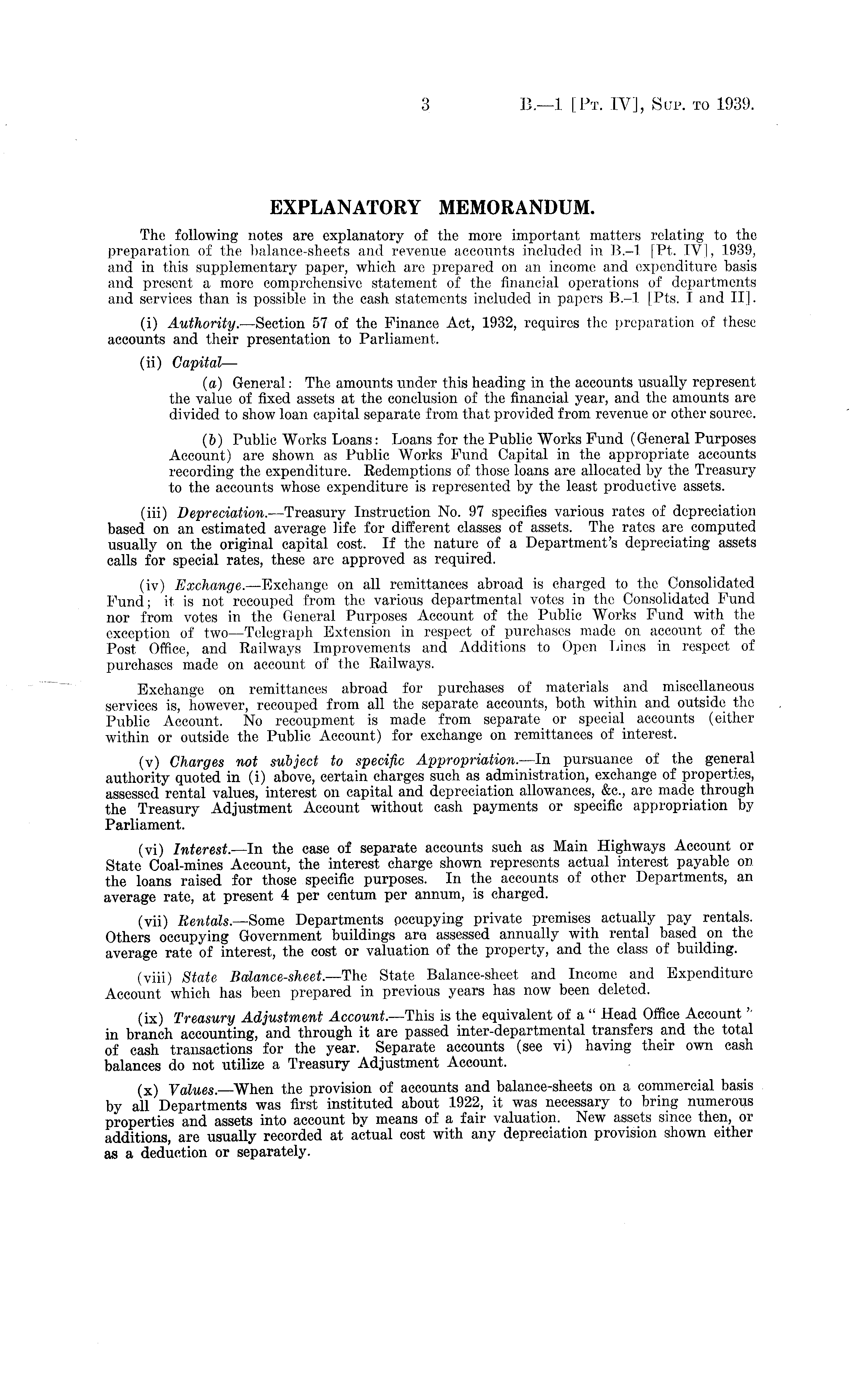 EXPLANATORY MEMORANDUM. The following notes are explanatory of the more important matters relating to the preparation of the balance-sheets and revenue accounts included in 8.-l [Pt. IV], 1939, and in this supplementary paper, which are prepared on an income and expenditure basis and present a more comprehensive statement of the financial operations of departments and services than is possible in the cash statements included in papers 8.-l [Pts. I and lIJ. (i) Authority.—Section 57 of the Finance Act, 1932, requires the preparation of these accounts and their presentation to Parliament. (ii) Capital— (a) General: The amounts under this heading in the accounts usually represent the value of fixed assets at the conclusion of the financial year, and the amounts are divided to show loan capital separate from that provided from revenue or other source. (b) Public Works Loans: Loans for the Public Works Fund (General Purposes Account) are shown as Public Works Fund Capital in the appropriate accounts recording the expenditure. Redemptions of those loans are allocated by the Treasury to the accounts whose expenditure is represented by the least productive assets. (iii) Depreciation.—Treasury Instruction No. 97 specifies various rates of depreciation based on an estimated average life for different classes of assets. The rates are computed usually on the original capital cost. If the nature of a Department's depreciating assets calls for special rates, these are approved as required. (iv) Exchange.—Exchange on all remittances abroad is charged to the Consolidated Fund; it is not recouped from the various departmental votes in the Consolidated Fund nor from votes in the General Purposes Account of the Public Works Fund with the exception of two —Telegraph Extension in respect of purchases made on account of the Post Office, and Railways Improvements and Additions to Open Lines in respect of purchases made on account of the Railways. Exchange on remittances abroad for purchases of materials and miscellaneous services is, however, recouped from all the separate accounts, both within and outside the Public Account. No recoupment is made from separate or special accounts (either within or outside the Public Account) for exchange on remittances of interest. (v) Charges not subject to specific Appropriation.—ln pursuance of the general authority quoted in (i) above, certain charges such as administration, exchange of properties, assessed rental values, interest on capital and depreciation allowances, &c., arc made through the Treasury Adjustment Account without cash payments or specific appropriation by Parliament. (vi) Interest. —In the case of separate accounts such as Main Highways Account or State Coal-mines Account, the interest charge shown represents actual interest payable on the loans raised for those specific purposes. In the accounts of other Departments, an average rate, at present 4 per centum per annum, is charged. (vii) Rentals. —Some Departments pccupying private premises actually pay rentals. Others occupying Government buildings are assessed annually with rental based on the average rate of interest, the cost or valuation of the property, and the class of building. (viii) State Balance-sheet. —The State Balance-sheet and Income and Expenditure Account which has been prepared in previous years has now been deleted. (ix) Treasury Adjustment Account.—This is the equivalent of a " Head Office Account '' in branch accounting, and through it are passed inter-departmental transfers and the total of cash transactions for the year. Separate accounts (see vi) having their own cash balances do not utilize a Treasury Adjustment Account. (x) Values. —When the provision of accounts and balance-sheets on a commercial basis by all Departments was first instituted about 1922, it was necessary to bring numerous properties and assets into account by means of a fair valuation. New assets since then, or additions, are usually recorded at actual cost with any depreciation provision shown either as a deduction or separately.