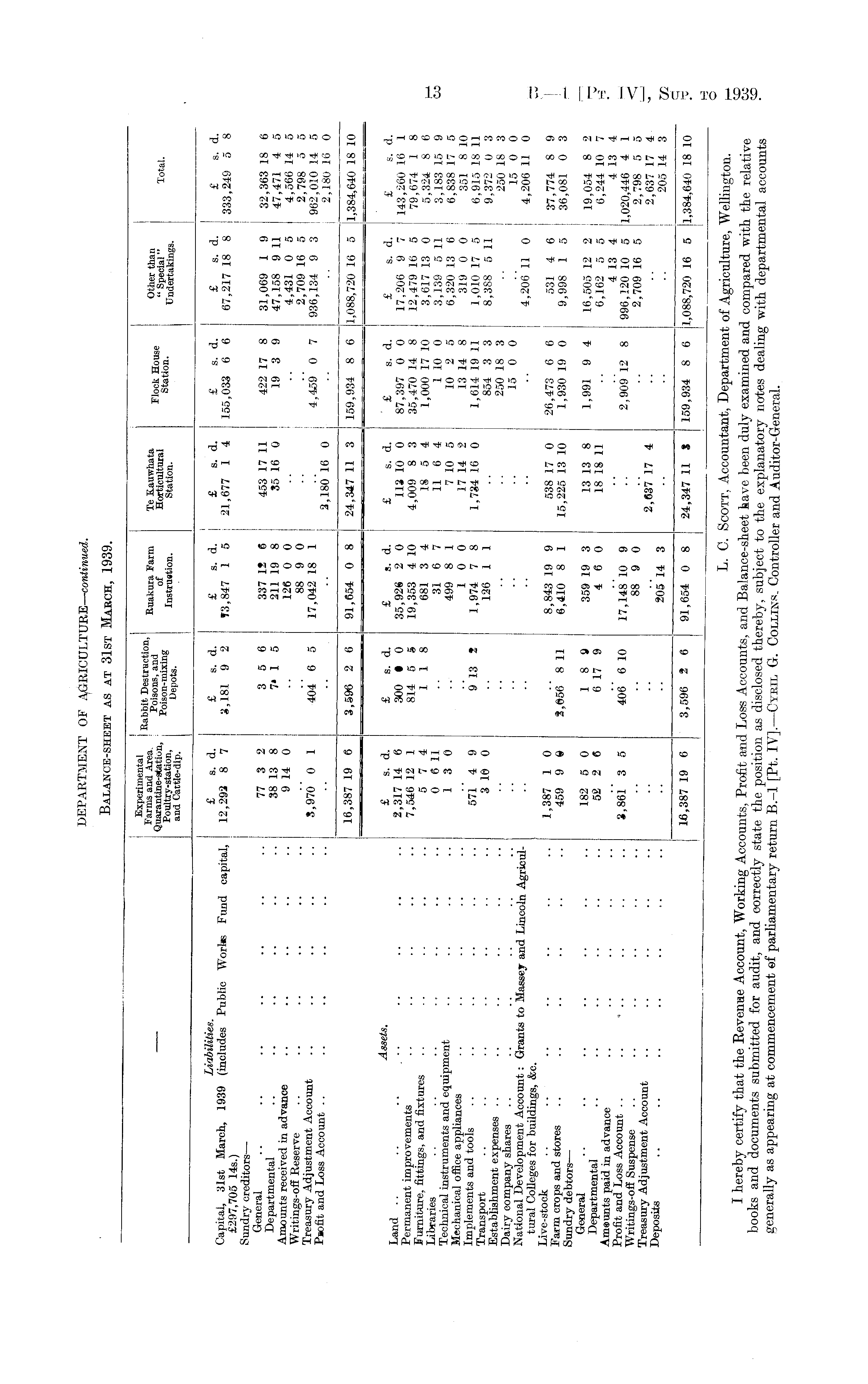 L. C. Scott, Accountant, Department of Agriculture, Wellington. I hereby certify that the Revenue Account, Working Accounts, Profit and Loss Accounts, and Balance-sheet have been duly examined and compared with the relative books and documents submitted for audit, and correctly state the position as disclosed thereby, subject to the explanatory notes dealing with departmental accounts generally as appearing at commencement ©f parliamentary return 8.-l [Pt. IV].— Cybil G. Collins. Controller and Auditor-General