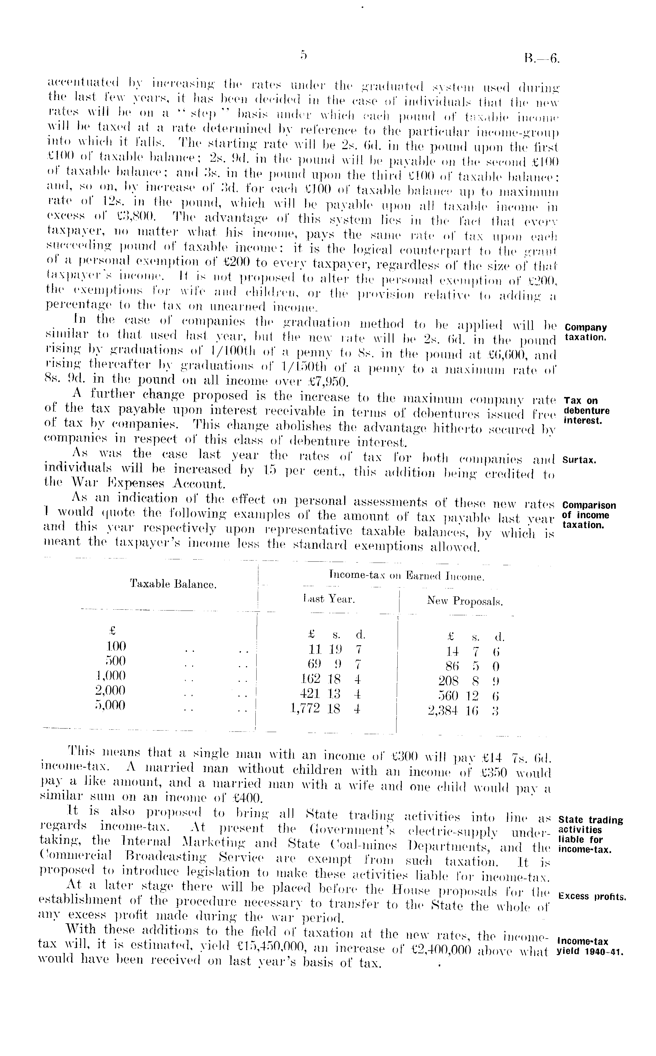 Phis means that a single man with an income of £300 will pay £14 7s. 6d. income-tax. A married man without children with an income of £350 would pay a like amount, and a married man with a wife and one child would pay a similar sum on an income of £400. It is_ also proposed to bring all State trading activities into line as regards income-tax. At present the Government's electric-supply undertaking, the Internal Marketing and State Coal-mines Departments, and the Commercial Broadcasting Service are exempt from such taxation. It is proposed to introduce legislation to make these activities liable for income-tax. , jT. a Inter stage there will be placed before the House proposals for the establishment of the procedure necessary to transfer to the State the whole of any excess profit made during the Avar period. With these additions to the field of taxation at the new rates, the incometax will, it is estimated, yield £15,450,000, an increase of £2,400,000 above what would have been received on last year's basis of tax. »
