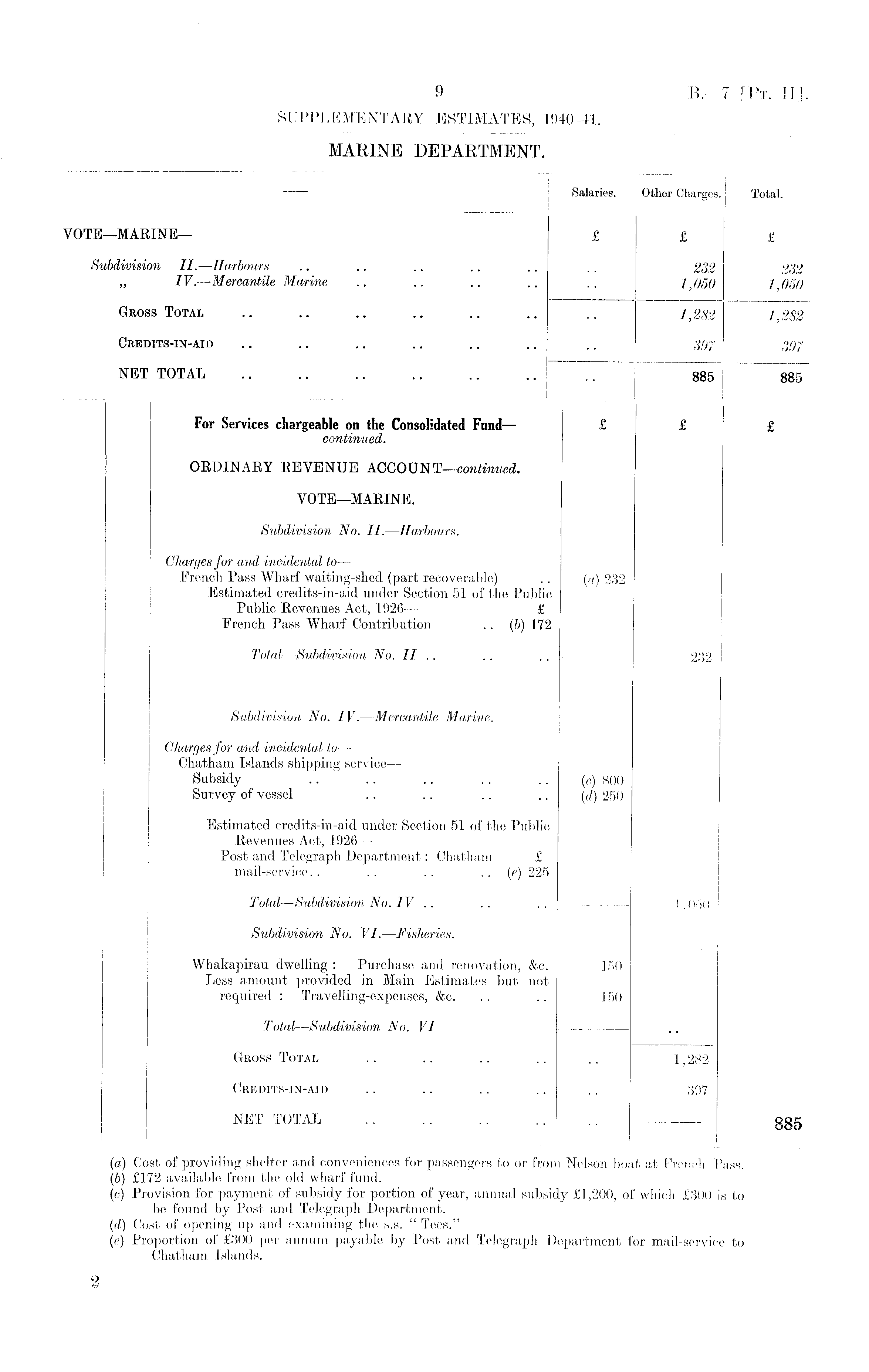 Salaries. Other Charges. Total. I I VOTE—MARINE— £ £ £ Subdivision II.—Harbours .. .. .. .. .. .. 232 232 „ IV. — Mercantile Marine .. .. .. .. 1,050 1 050 Gross Total .. 2,282 1,282 Credits-IN-AID .. .. .. .. .. .. .. ,3,97 ;>(y/ NET TOTAL .. .. .. .. .. .. .. 885 885 For Services chargeable on the Consolidated Fund— £ £ £ continued. ORDINARY REVENUE ACGOUNT—continued. VOTE—MARINE. Subdivision No. II. —Harbours. Charges for and incidental to- — French Pass Wharf waiting-shed (part recoverable) .. (a) 232 Estimated credits-in-aid under Section 51 of the Public Public Revenues Act, 1926 — £ French Pass Wharf Contribution .. (6) 172 Total—Subdivision No. II .. .. .. 232 Subdivision No. IV. —Mercantile Marine. Charges for and incidental to — Chatham Islands shipping service— Subsidy .. .. .. .. .. ( c ) .800 Survey of vessel .. .. .. .. (rf) 250 Estimated credits-in-aid under Section 51 of the Public Revenues Act, 1926 — Post and Telegraph Department: Chatham £ .mail-service.. .. .. (e) 225 Total—SubdivisionNo.IV .. .. .. 1,050 Subdivision No. VI. —Fisheries. Whakapirau dwelling : Purchase and renovation, &c. 150 Less amount provided in Main Estimates but not required : Travelling-expenses, &c. .. .. 150 Total—Subdivision No. VI Gross Total .. .. .. .. .. 1 ) 282 Credits-in-aid .. .. .. .. .. 397 NET TOTAL .. .. .. .. .. 335 (а) Cost of providing shelter and conveniences for passengers to or from Nelson boat at French Pass. (б) £172 available from the old wharf fund. (c) Provision for payment of subsidy for portion of year, annual subsidy £1,200, of which £300 is to be found by Post and Telegraph Department. (d) Cost of opening up and examining the s.s. " Tees." (e) Proportion of £300 per annum payable by Post and Telegraph Department for mail-service to Chatham Islands.