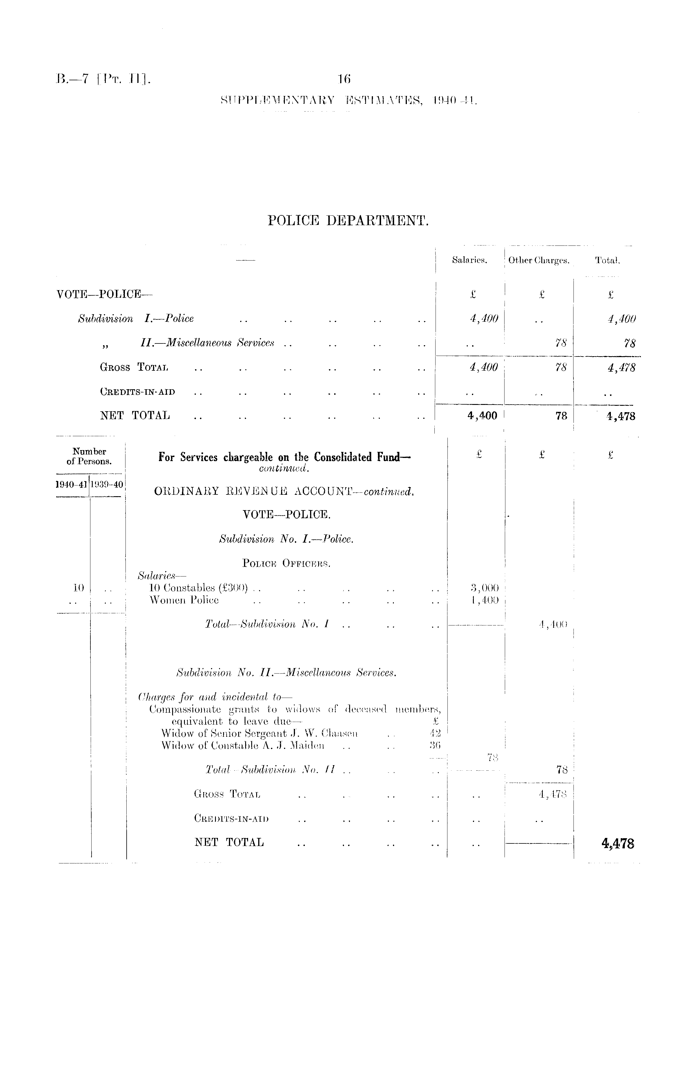 Salaries. Other Charges. I Total. VOTE—POLICE— £ £ £ Subdivision I.—Police .. .. .. .. .. 4,400 .. 4,400 „ II.—Miscellaneous Services .. .. .. .. .. 78 78 Gross Total .. .. .. .. .. .. 4,400 78 4,478 Credits-in-aid NET TOTAL .. .. .. .. .. .. 4,400 78 4,478 ofPersoM. For Services chargeable on the Consolidated Fund — £ £ £ ° continued. 1940-41 |i 939-40 ORDINARY REVENUE ACCOUNT-continued. VOTE—POLICE. Subdivision No. I.—Police. Police Officers. Salaries — 10 10 Constables (£300) .. .. .. .. .. 3,000 Women Police .. .. .. .. .. 1,400 Total—Subdivision No. I .. .. .. 4,400 Subdivision No. II. —Miscellaneous Services. Charges for and incidental to — Compassionate grants to widows of deceased members, equivalent to leave due —- £ Widow of Senior Sergeant J. W. Claasen .. 42 Widow of Constable A. J. Maiden .. . . 36 — 78 | Total—Subdivision No. II .. .. .. —j 78 Gross Total .. .. .. .. .. 4,478 Credits-in-aid NET TOTAL .. .. .. .. .. 4,478