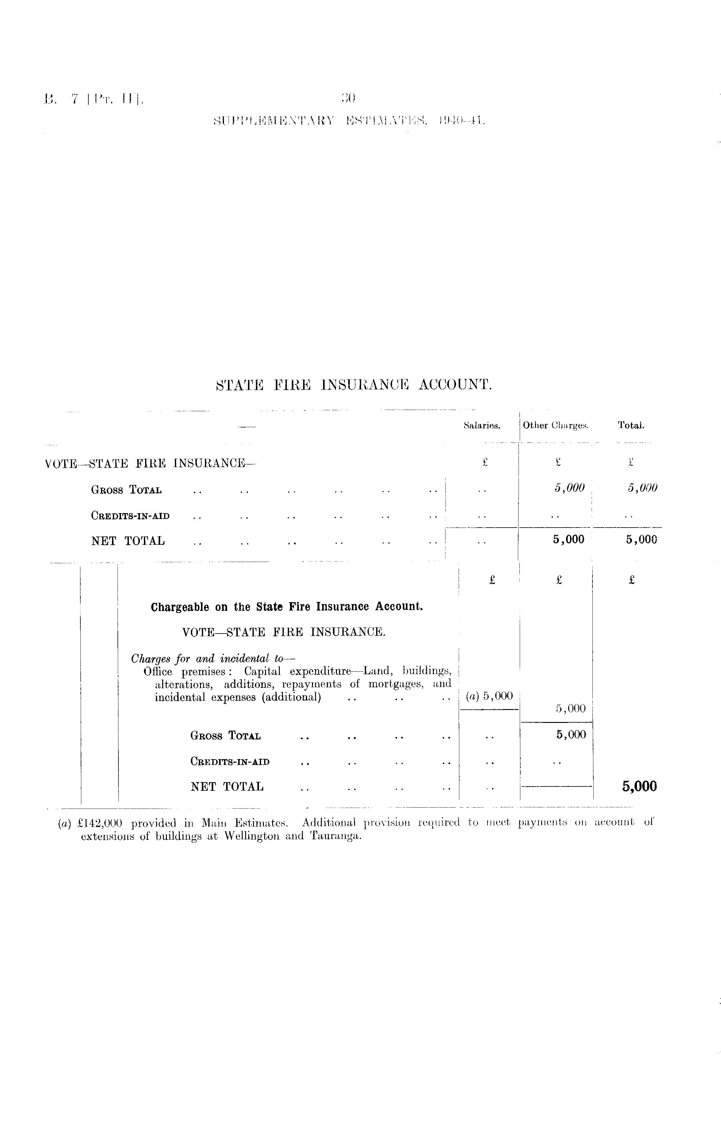 —— | Salaries. Other Charges. | Total. VOTE—STATE FIRE INSURANCE— £ £ £ Gross Total .. .. .. •• •• 5,000 5,000 Credits-in-aid NET TOTAL .. .. .. .. .. • • 5,000 5,000 £ £ £ Chargeable on the State Fire Insurance Account. VOTE—STATE FIRE INSURANCE. Charges for and incidental to —- Office premises : Capital expenditure —Land, buildings, alterations, additions, repayments of mortgages, and incidental expenses (additional) .. .. .. (a) 5,000 5,000 Gross Total .. .. .. .. .. 5,000 Credits-in-aid NET TOTAL .. .. 5,000 («) £142,000 provided in Main Estimates. Additional provision required to meet payments on account of extensions of buildings at Wellington and Tauranga.