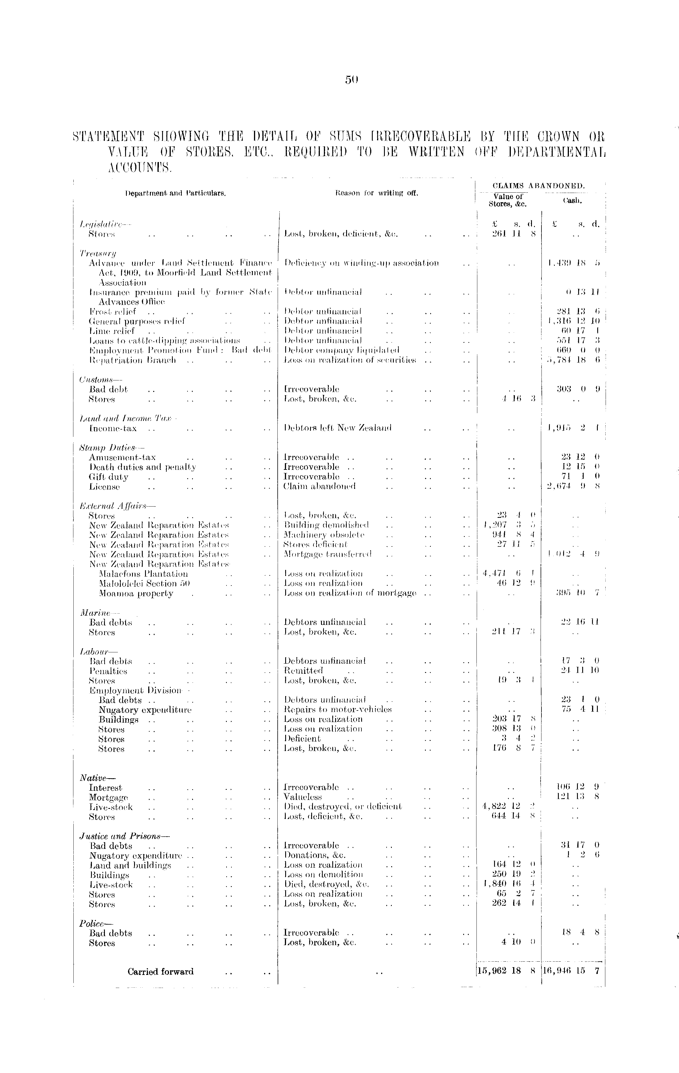 CLAIMS ABANDONED. Department and Particulars. Reason lor writing off. Value of Stores, Ac. I Cash. Legislative—■ £ s. d. £ s. d. Stores .. . ■ ■. • • Lost, broken, deficient, &e. .. .. 261 II 8 Treasury— Advance under Land Settlement Finance Deficiency on winding-up association .. .. 1,439 18 5 Act, 1909, to Moorfield Land Settlement Association Insurance premium paid by former State Debtor unfinancial .. .. .. .. 0 13 11 Advances Office Frost relief .. .. • • • ■ Debtor unfinancial .. .. .. •. 281 13 6 General purposes relief .. .. Debtor unfinancial .. .. .. .. 1,316 12 10 Lime relief .. . . • • ■ • Debtor unfinancial .. .. . . 60 17 I Loans to cattle-dipping associations . ■ Debtor unfinancial . . .. .. . . 551 17 3 Employment Promotion Fund: Bad debt Debtor company liquidated . . .. . . 660 0 0 Repatriation Branch .. .. .. Loss on realization of securities .. .. .. 5,784 18 6 Customs — Bad debt . .. .. .. Irrecoverable .. .. .. .. 303 0 9 Stores .. • • . • • • Lost, broken, &c. .. .. .. 4 16 3 Land and Income Tax — Income-tax .. .. .. .. Debtors left New Zealand .. .. .. 1,915 2 I Stamp Duties— Amusement-tax .. . . . . Irrecoverable . . . . .. . . .. 23 12 0 Death duties and penalty . . . . Irrecoverable . . .. .. • • .. 12 15 0 Gift duty .. .. . . • • Irrecoverable .. . . .. . . . . 71 J 0 License . . .. . • • • Claim abandoned .. .. .. .. 2,674 9 8 Uxternal Affairs — Stores .. .. ■ • • • Lost, broken, &c. .. .. .. 23 4 0 New Zealand Reparation Estates .. Building demolished .. .. .. 1,207 3 5 New Zealand Reparation Estates . . Machinery obsolete . . . . . ■ 941 8 4 New Zealand Reparation Estates .. Stores deficient .. . . .. 27 11 5 New Zealand Reparation Estates .. Mortgage transferred .. .. .. .. 1,012 4 9 New Zealand Reparation Estates — Malaefons Plantation .. .. Loss on realization .. .. 4,471 6 1 Malololelei Section 50 . . . . Loss on realization .. .. . . 46 12 9 Moamoa property .. .. ■ . Loss on realization of mortgage .. .. .. 395 10 7 Marine — Bad debts .. . . . • ■ ■ Debtors unfinancial .. .. . . . . 22 16 11 Stores . . .. • • • ■ Lost, broken, &c. . . .. .. 211 17 3 Labour— Bad debts . . . . .. . ■ Debtors unfinancial .. .. .. .. 1730 Penalties .. • ■ . • • • Remitted .. . . .. .. . . 24 11 10 Stores . . .. .. • ■ Lost, broken, &c. .. .. .. 19 3 1 Employment Division — Bad debts . . . . .. Debtors unfinancial . . .. .. . . 23 1 0 Nugatory expenditure .. . . Repairs to motor-vehicles .. .. .. 75 4 11 Buildings . . . . .. .. Loss on realization .. . . .. 203 17 8 Stores .. .. . • ■ • Loss on realization . . .. .. 308 13 0 Stores .. .. . . •. Deficient .. .. .. .. 342 Stores .. •. .. • • Lost, broken, &c. .. . . .. 176 8 7 Native— Interest .. .. .. . . Irrecoverable .. .. .. .. .. 106 12 9 Mortgage . . . . . . • • Valueless .. .. . . .. • • 121 13 8 Live-stock .. .. .. .. Died, destroyed, or deficient .. .. 4,822 12 2 Stores .. .. .. •. Lost, deficient, &c. .. . . .. 644 14 8 Justice and Prisons— Bad debts . . • . . . . . Irrecoverable . . .. •. • • • • 31 17 0 Nugatory expenditure . . .. .. Donations, &c. . . . . • . ■ . 12 6 Land and buildings .. .. .. Loss on realization .. .. .. 164 12 0 Buildings .. . . . . • . Loss on demolition . . . . . . 250 19 2 Live-stock .. .. .. .. Died, destroyed, &c. .. .. .. 1,840 16 4 Stores .. . . .. .. Loss on realization .. . . .. 65 2 7 Stores .. .. .. • • Lost, broken, &c. .. .. .. 262 14 1 Police— Bad debts .. .. .. .. Irrecoverable . . .. .. .. .. 18 4 8 Stores .. .. • • Lost, broken, &c. .. .. .. 4 10 0 Carried forward .. .. .. 15,962 18 8 16,946 15 7