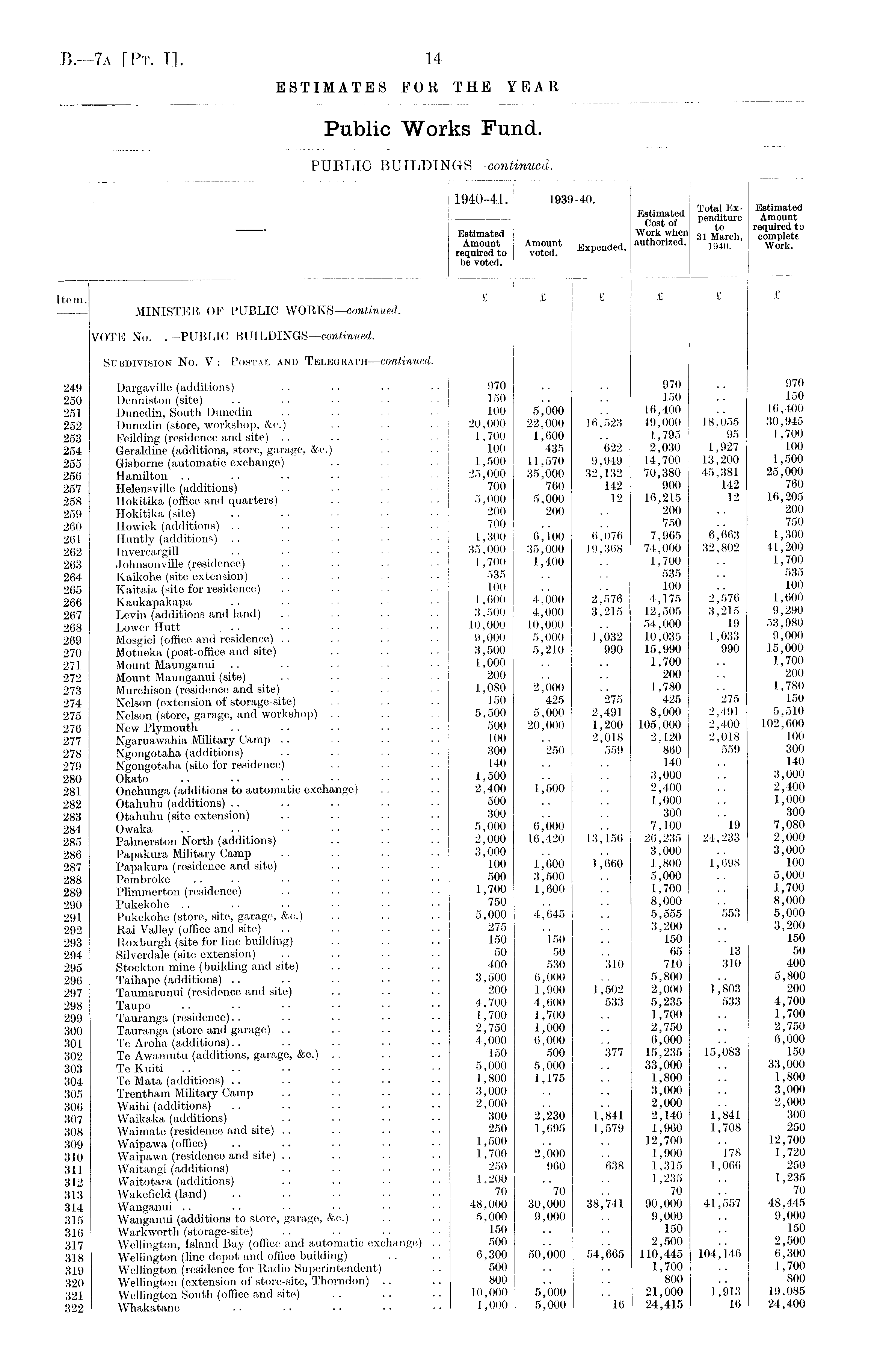 ESTIMATES FOR THE YEAR Public Works Fund. PUBLIC BUILDINGS— continued. 1940-41. 1939-40. u *i™ »„.< Total Kx- Estimated Estimated dlture Amount tost ol r j 0 required to Estimated Work when 31 Maren complete Amount Amount Expended . authorized. m0 Work . required to voted. v be voted. Item. ££££££ MINISTER OF PUBLIC WORKS— continued. VOTE No. .—PUBLIC BUILDINGS— continued. Subdivision No. V : Postal and Telegraph— continued. 249 Dargaville (additions) .. .. .. .. 970 .. .. 970 .. 970 250 Denniston (site) .. . . .. .. • ■ 150 .. .. 150 .. 150 251 Dunedin, South Bunedin 100 5,000 .. 16,400 .. 16,400 252 Dunedin (store, workshop, &c.) 20,000 22,000 16,523 49,000 18,055 30,945 253 Feilding (residence and site) .. .. .. . . 1,700 1,600 .. 1,795 95 1,700 254 Geraldine (additions, store, garage, &c.) .. .. 100 435 622 2,030 1,927 100 255 Gisborne (automatic exchange) 1,500 11,570 9,949 14,700 13,200 1,500 256 Hamilton .. .. ■■ •■ 25,000 35,000 32,132 70,380 45,381 25,000 257 Helensville (additions) 700 760 142 900 142 760 258 Hokitika (office and quarters) 5,000 5,000 12 16,215 12 16,205 259 Hokitika (site) 200 200 .. 200 .. 200 260 Howick (additions) .. .. .. .. ■• 700 .. .. 750 .. 750 261 Huntly (additions) 1,300 6,100 6,076 7,965 6,663 1,300 262 Invercargill 35,000 35,000 19,368 74,000 32,802 41,200 263 Johnsonville (residence) .. .. .. .. 1,700 1,400 .. 1,700 .. 1,700 264 Kaikohe (site extension) .. .. . ■ . • 535 .. .. 535 .. 535 265 Kaitaia (site for residence) . . .. . ■ ■ • 100 .. .. 100 .. 100 266 Kaukapakapa 1,600 4,000 2,576 4,175 2,576 1,600 267 Levin (additions and land) 3,500 4,000 3,215 12,505 3,215 9,290 268 Lower Hutt 10,000 10,000 .. 54,000 19 53,980 269 Mosgiel (office and residence) 9,000 5,000 1,032 10,035 1,033 9,000 270 Motueka (post-office and site) 3,500 5,210 990 15,990 990 15,000 271 Mount Maunganui .. .. ■• •• •■ 1,000 .. .. 1,700 .. 1,700 272 Mount Maunganui (site) .. .. . ■ ■ ■ 200 . . .. 200 .. 200 273 Murchison (residence and site) .. .. .. 1,080 2,000 .. 1,780 .. 1,780 274 Nelson (extension of storage-site) . . .. . . 150 425 275 425 275 150 275 Nelson (store, garage, and workshop) .. .. .. 5,500 5,000 2,491 8,000 2,491 5,510 276 New Plymouth .. .... .. 500 20,000 1,200 105,000 2,400 102,600 277 Ngaruawahia Military Camp .. .. .. .. 100 .. 2,018 2,120 2,018 100 278 Ngongotaha (additions) .. .. .... . • 300 250 559 860 559 300 279 Ngongotaha (site for residence) .. . . . . 140 .. .. 140 .. 140 280 Okato .. 1,500 .. .. 3,000 .. 3,000 281 Onehunga (additions to automatic exchange) .. .. 2,400 1,500 .. 2,400 .. 2,400 282 Otahuhu (additions) .. .. .. •• •• 500 .. .. 1,000 .. 1,000 283 Otahuhu site extension) .. .. .. • ■ 300 .. .. 300 .. 300 284 Owaka .. ■• •• •• ■• 5,000 6,000 .. 7,100 19 7,080 285 Palmerston North (additions) 2,000 16,420 13,156 26,235 24,233 2,000 286 Papakura Military Camp .. .. .. .. 3,000 .. .. 3,000 .. 3,000 287 Papakura (residence and site) 100 1,600 1,660 1,800 1,698 100 288 Pembroke 500 3,500 .. 5,000 .. 5,000 289 Plimmerton (residence) .. .. •• •• 1,700 1,600 .. 1,700 .. 1,700 290 Pnkekohe 750 .. .. 8,000 .. 8,000 291 Pukekohe (store, site, garage, &e.) .. .. .. 5,000 4,645 .. 5,555 553 5,000 292 Rai Valley (office and site) .. 275 .. .. 3,200 .. 3,200 293 Roxburgh (site for line building) .. . . .. 150 150 .. 150 .. 150 294 Silverdale (site extension) .. .. .. .. 50 50 65 50 295 Stockton mine (building and site) .. .. .. 400 530 310 710 310 400 296 Taihape (additions) 3,500 6,000 .. 5,800 .. 5,800 297 Taumarunui (residence and site) 200 1,900 1,502 2,000 1,803 200 298 Taupo .. •• •• •• •• 4.700 4,600 533 5,235 533 4,700 299 Tauranga (residence) 1,700 1,700 .. 1,700 .. 1,700 300 Tauranga (store and garage) 2,750 1,000 .. 2,750 .. 2,750 301 Te Aroha (additions) 4,000 6,000 .. 6,000 .. b,000 302 Te Awamutu (additions, garage, &c.) .. .. .. 150 500 377 15,235 15,083 150 303 TeKuiti .. .. .. •• 5,000 5,000 .. 33,000 .. 33,000 304 Te Mata (additions) 1,800 1,175 .. 1,800 .. 1,800 305 Trentham Military Camp .. .. .. •■ 3,000 .. .. 3,000 .. 3,000 306 Waihi (additions) 2,000 .. .. 2,000 .. 2,000 307 Waikaka (additions) 300 2,230 1,841 2,140 1,841 300 308 Waimate (residence and site) 250 1,695 1,579 1,960 1,708 250 309 Waipawa (office) 1,500 .. .. 12,700 .. 12,700 310 Waipawa (residence and site) 1,700 2,000 .. 1,900 178 1,720 311 Waitangi (additions) 250 960 638 1,315 1,060 250 312 Waitotara (additions) .. .. .. ■• 1,200 .. .. 1,235 .. 1,235 313 Wakefield (land) 70 70 .. 70 .. 70 314 Wanganui.. .. •• •■ •• •• 48,000 30,000 38,741 90,000 41,557 48,445 315 Wanganui (additions to store, garage, &c.) .. .. 5,000 9,000 .. 9,000 .. 9,000 316 Warkworth (storage-site) .. .. .. .. 150 .. .. 150 .. 150 317 Wellington, Island Bay (office and automatic exchange) .. 500 .. .. 2,500 .. 2,500 318 Wellington (line depot and office building) .. .. 6,300 50,000 54,665 110,445 104,146 6,300 319 Wellington (residence for Radio Superintendent) .. 500 .. .. 1,700 .. 1,700 320 Wellington extension of store-site, Thorndon) .. .. 800 .. .. 800 .. 800 321 Wellington South (office and site) 10,000 5,000 .. 21,000 1,913 19,085 322 Whakatane 1,000 5,000 16 24,415 16 24,400