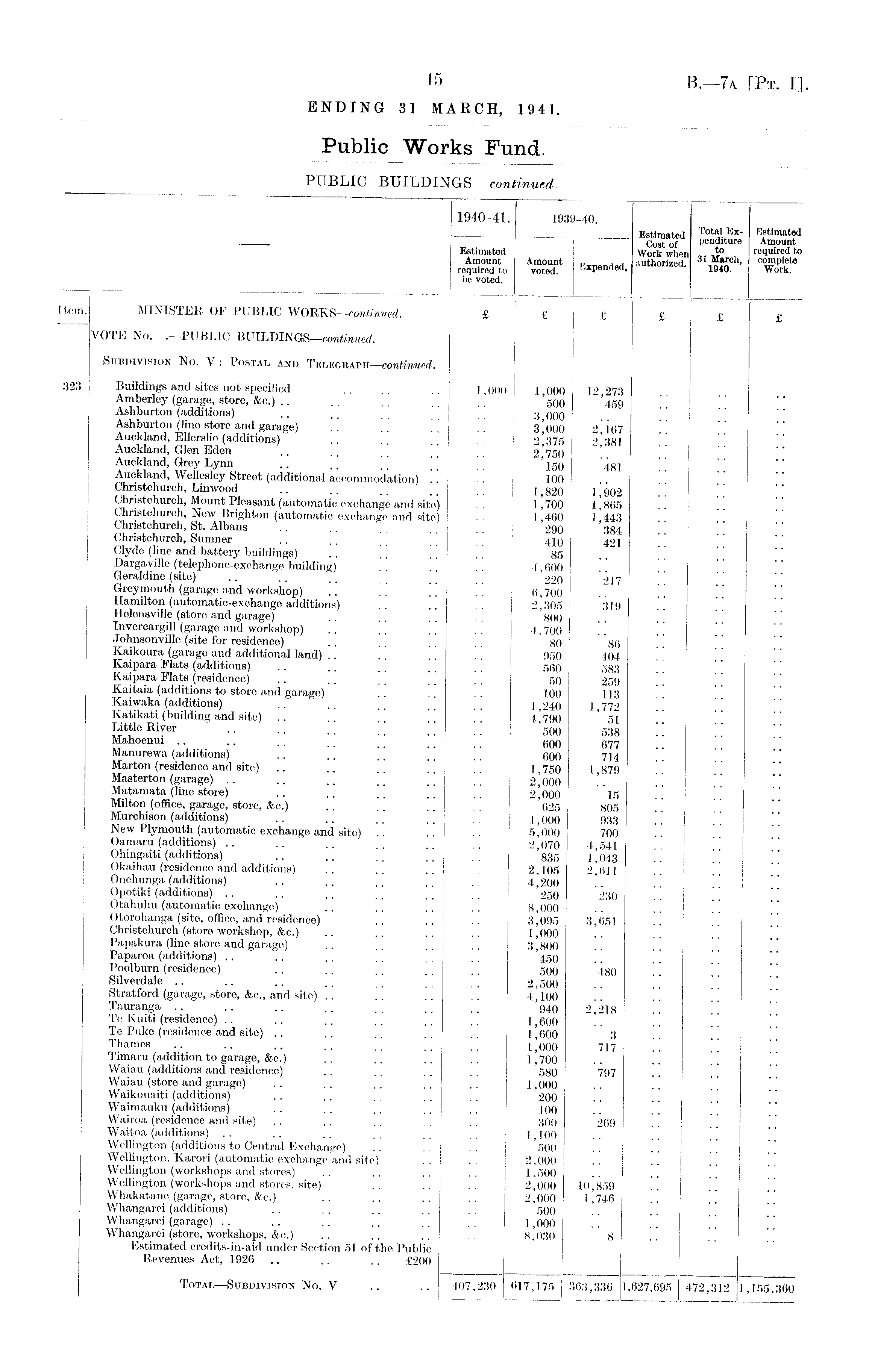 ENDING 31 MAECH, 1941. Public Works Fund. PUBLIC BUILDINGS continued. 1940-41. 1939-40. Estimated T E ? tlmat « d Cost of penditure Amount Estimated Work when „, J£? , required to Amount. Amount F _ Mnd . rt authorized. 3 \¥?j[ oh > complete required to voted. ''"ponded. 1940. Work, be voted. Item. MINISTER OP PUBLIC WORKS— continued, ££££££ VOTE No. .—PUBLIC BUILDINGS-co«.«m«erf. Subdivision No. V : Postal and Telegraph— continued. 323 Buildings and sites not specified .... 1 000 1 000 12 273 Amberley (garage, store, &c.) .. ., " " \\ ' 500 ' 469 Ashburton (additions) .... 3 000 Ashburton (line store and garage) .. 3 '000 2 167 Auckland, Ellerslie (additions) .. " " .. 2'375 2'.381 Auckland, Glen Eden .. ,, \\ ' 2750 Auckland, Grey Lynn .. \\ \\ " \\ 'igO '481 Auckland, Wellesley Street (additional accommodation) ','. '.'. 100 Christchurch, Linwood .... ] 820 1 902 Christchurch, Mount Pleasant (automatic exchange and site) . . 1 i 700 1 i 865 Christchurch, New Brighton (automatic exchange and site) .. 1,460 1443 Christchurch, St. Albans .. . . 290 384 Christchurch, Sumner .. .. 41Q 42] Clyde (line and battery buildings) .. '' ][ '' 85 Dargaville (telephone-exchange building) .. .. .. 4,600 Geraldine (site) .. .. __ '220 217 Greymouth (garage and workshop) .. . ' '' . . 6,700 Hamilton (automatic-exchange additions) .. .. 2,305 319 Helensville (store and garage) .. 800 Invercargill (garage and workshop) .. " "' "' 4,700 .. Johnsonville (site for residence) .. .. '' . . '80 "86 Kaikoura (garage and additional land) .. ... .[ .. 950 404 .. Kaipara Plats (additions) .. .. 560 583 Kaipara Plats (residence) .. .. '' ]] ][ ' 50 259 Kaitaia (additions to store and garage) .. .. .. 100 113 Kaiwaka (additions) .... ] 240 1 772 Katikati (building and site) .. .. 4 790 ' 51 Little River .. .. ,, [[ \\ [[ ' 500 5 g 8 " Mahoenui 600 677 Manurewa (additions) .. .. .. ,". 600 714 Marton (residence and site) .. .. . . .. 1 750 1 879 Masterton (garage) ...... 2' 000 Matamata (line store) .... 2 000 ' 15 Milton (office, garage, store, &o.) .. ., .. ,. 'fi25 805 '. '. Murchison (additions) .. .. , , .. 1 000 933 New Plymouth (automatic exchange and site) .. !! .. 5*000 700 Oamaru (additions) .. .. ,, _ t ., 2 070 4 541 Ohingaiti (additions) .. ,. ,_ _] .. '835 1043 Okaihau (residence and additions) .. .. .. .. 2,105 '.'. Onehunga (additions) .. .. ., ,. . . 4 200 Opotiki (additions) .. .. .. _ 250 230 Otahuhu (automatic exchange) .. .. ., .. 8,000 Otorohanga (site, office, and residence) .. .. 3,095 3,651 Christchurch (store workshop, &c.) .. .. .. .. I'oOO '.. .. Papakura (line store and garage) .. .. .. .. 3,800 Paparoa (additions) .. .. .. .. 450 Poolburn (residence) .. . . _ _ _ ,, 500 480 Silverdale ........ 2 500 Stratford (garage, store, &c, and site) .. .. .. .. 4,100 Tauranga .. .. .. .. .. 940 .. Te Kuiti (residence) ...... J 600 Te Puke (residence and site) .. .. . . .. .. 1,600 3 Thames .. .. .. .. ]. " .. 717 '.'. '.'. Timaru (addition to garage, &c.) .. .. .. .. 1,700 Waiau (additions and residence) .. . . .. .. 580 797 Waiau (store and garage) .... 1 000 Waikouaiti (additions) .. . . .. .. .. 200 Waimauku (additions) .. , . . . , . . . 100 Wairoa (residence and site) .. .. .. . , .. 300 269 Waitoa (additions) .. .. .. . .. 1,100 Wellington (additions to Central Exchange) .. ., .. 500 .. .. '.' Wellington, Karori (automatic exchange and site) . . .. 2,000 .. .. .. Wellington (workshops and stores) . . .. . . . . 1,500 Wellington (workshops and stores, site) .. .. .. 2,000 10,859 Whakatane (garage, store, &c.) .. .. .. .. 2,000 1^746 Whangarei (additions) . . .. .. . . . , 500 Whangarei (garage) .. .. .. .. .. .. 1 Whangarei (store, workshops, &c.) .. .. .. .. 8,030 8 Estimated credits-in-aid under Section 51 of the Public Revenues Act, 1926 .. .. .. £200 Total—Subdivision No. V .. .. 407,230 617,175 363,336 1,627,695 472,312 1,155 360 . '
