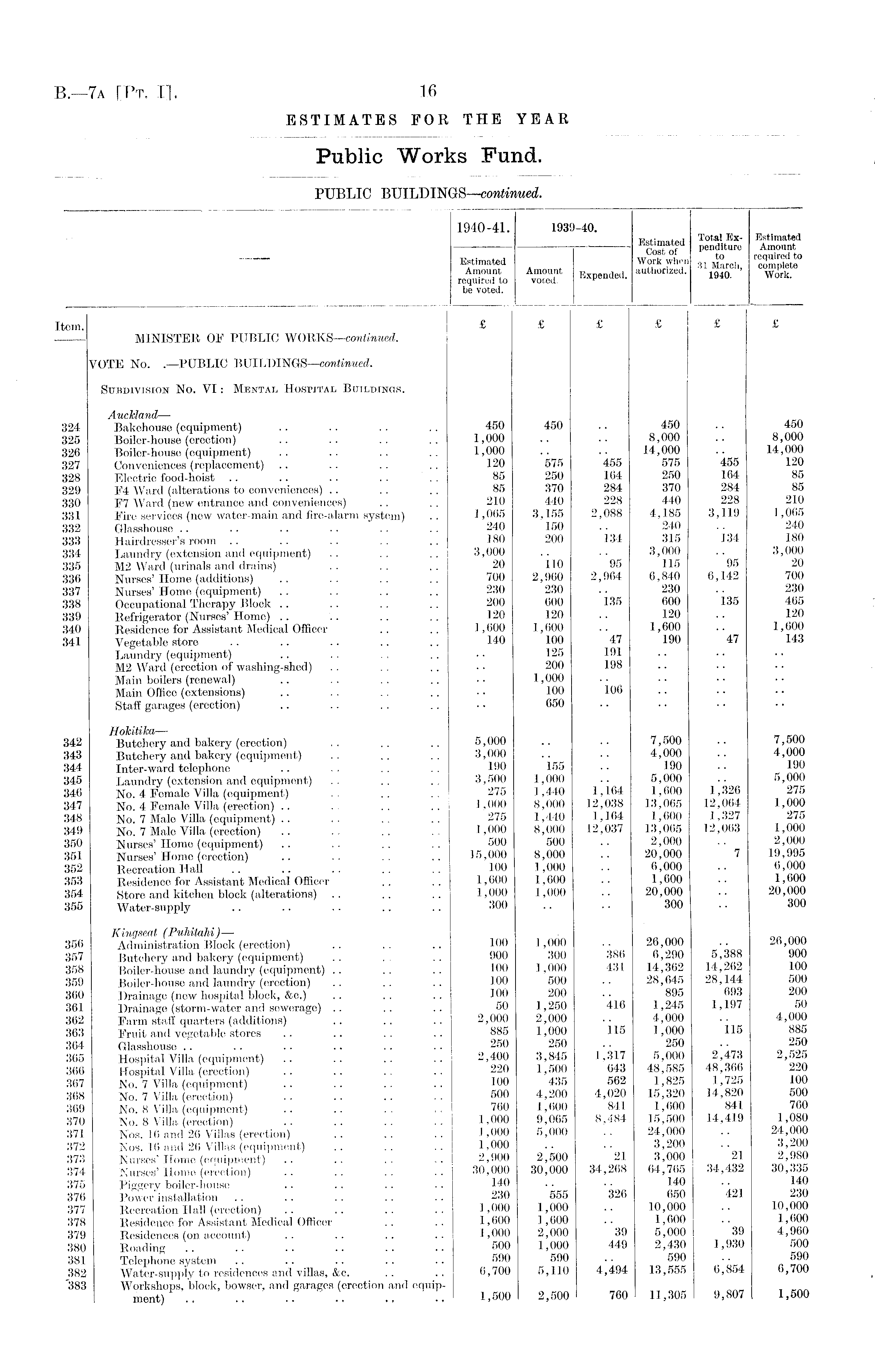 ESTIMATES FOR THE YEAR Public Works Fund. PUBLIC BUILDINGS— continued. 1940-41. 1939-40. • Hatimntnd Total Ex- Estimated Sor P endlture Amount . Estimated 81 March, 'complete 0 reqSfto !J5SS* Ex P end ° d - '° 194 °- W ° rk ' be voted. Item. £ £ £ x £ MINISTER OF PUBLIC WORKS— continued. VOTE No. .—PUBLIC BUILDINGS— continued. Subdivision No. VI: Mental Hospital Buildings. 324 Bakehouse (equipment) .. .. .. . . 450 450 .. 450 .. 450 325 Boiler-house (erection) .. .. .. .. 1,000 .. .. 8,000 .. 8,000 326 Boiler-house (equipment) .. .. .. .. 1,000 .. .. 14,000 .. 14,000 327 Conveniences (replacement) .. .. .. . . 120 575 455 575 455 120 328 Electric food-hoist .. 85 250 164 250 164 85 329 E4 Ward (alterations to conveniences) .. .. .. 85 370 284 370 284 85 330 F7 Ward (new entrance and conveniences) .. .. 210 440 228 440 _ 228 210 331 Fire services (new water-main and fire-alarm system) .. 1,065 3,155 2,088 4,185 3,119 1,065 332 Glasshouse . . 240 150 .. 240 .. 240 333 Hairdresser's room 180 200 134 315 134 _ 180 334 Laundry (extension and equipment) .. .. .. 3,000 .. .. 3,000 .. 3,000 335 M2 Ward (urinals and drains) .. .. .. 20 110 95 115 95 20 336 Nurses'Home (additions) 700 2,960 2,964 6,840 6,142 700 337 Nurses' Home (equipment) .. .. .. .. 230 230 .. 230 .. 230 338 Occupational Therapy Block .. .. .. .. 200 600 135 600 135 465 339 Refrigerator (Nurses' Home) .. .. .. .. 120 120 . . 120 .. 120 340 Residence for Assistant Medical Officer .. .. 1,600 1,600 .. 1,600 .. 1,600 341 Vegetable store 140 100 47 190 47 143 Laundry (equipment) .. .. . . .. .. 125 M2 Ward (erection of washing-shed) . . .. . . . • 200 198 Main boilers (renewal) .. .. . . .. • • 1,000 Main Office (extensions) .. .. .. .. • • 100 106 Staff garages (erection) .. .. .. . . ■ • 650 J~ffilc'ift IrfL " ' 342 Butchery and bakery (erection) .. .. .. 5,000 .. .. 7,500 .. 7,500 343 Butchery and bakery (equipment) .. .. .. 3,000 .. .. 4,000 .. 4,000 344 Inter-ward telephone .. .. . . . . 190 155 .. 190 .. 190 345 Laundry (extension and equipment) .. .. .. 3,500 1,000 .. 5,000 .. 5,000 346 No. 4 Female Villa (equipment) 275 1,440 1,164 1,600 1,326 275 347 No. 4 Female Villa (erection) 1,000 8,000 12,038 13,065 12,064 1,000 348 No. 7 Male Villa (equipment) 275 1,440 1,164 1,600 1,327 275 349 No. 7 Male Villa (erection) 1,000 8,000 12,037 13,065 12,063 1,000 350 Nurses'Home (equipment) .. .. .. .. 500 500 .. 2,000 .. 2,000 351 Nurses'Home (erection) 15,000 8,000 .. 20,000 7 19,995 352 Recreation Hall 100 1,000 .. 6,000 .. 6,000 353 Residence for Assistant Medical Officer .. .. 1,600 1,600 .. 1,600 .. 1,600 354 Store and kitchen block (alterations) .. .. .. 1,000 1,000 .. 20,000 .. 20,000 355 Water-supply 300 .. .. 300 .. 300 Kingseat (PuhitaM) — . 356 Administration Block (erection) .. .. .. 100 1,000 .. 26,000 .. 26,000 357 Butchery and bakery (equipment) .. .. .. 900 300 386 6,290 5,388 900 358 Boiler-house and laundry (equipment) .. .. .. 100 1,000 431 14,362 14,262 100 359 Boiler-house and laundry (erection) .. .. .. 100 500 .. 28,645 28,144 500 360 Drainage (new hospital block, &c.) . . .. .. 100 200 . . 895 693 200 361 Drainage (storm-water and sewerage) .. .. .. 50 1,250 416 1,245 1,197 362 Farm staff quarters (additions) .. .. .. 2,000 2,000 .. 4,000 .. 4,000 363 Fruit and vegetable stores .. .. .. .. 885 1,000 115 1,000 115 885 364 Glasshouse .: 250 250 .. 250 .. 250 365 Hospital Villa (equipment) 2,400 3,845 1,317 5,000 2,473 2,525 366 Hospital Villa erection) 220 1,500 043 48,585 48,366 220 367 No. 7 Villa (equipment) 100 435 562 1,825 1,725 100 368 No. 7 Villa erection) 500 4,200 4,020 15,320 14,820 500 369 No. 8 Villa equipment) 760 1,600 841 1,600 841 760 370 No. 8 Villa erection) 1,000 9,065 8,484 15,500 14,419 1,080 371 Nos. 16 and 26 Villas (erection) 1,000 5,000 .. 24,000 .. 24,000 372 Nos. 16 and 26 Villas (equipment) .. .. .. 1,000 .. .. 3,200 .. 3,200 373 Nurses'Home (equipment) 2,900 2,500 21 3,000 21 2,980 374 Nurses'Home (erection) 30,000 30,000 34,208 64,765 34,432 30,335 375 Piggery boiler-house .. .. .. . . 140 .. . • 140 .. 140 376 Power installation 230 555 326 650 421 230 377 Recreation Hall (erection) 1,000 1,000 .. 10,000 .. 10,000 378 Residence for Assistant Medical Officer .. .. 1,600 1,600 .. 1,600 .. 1,600 379 Residences (on account) 1,000 2,000 39 5,000 39 4,960 380 Roading . .. .. .. .. .. 500 1,000 449 2,430 1,930 500 381 Telephone system 590 590 .. 590 .. 590 382 Water-supply to residences and villas, &c. .. .. 6,700 5,110 4,494 13,555 6,854 6,700 '383 Workshops, block, bowser, and garages (erection and equipment) .. .. ... ., .. 1,500 2,500 760 11,305 9,807 1,500