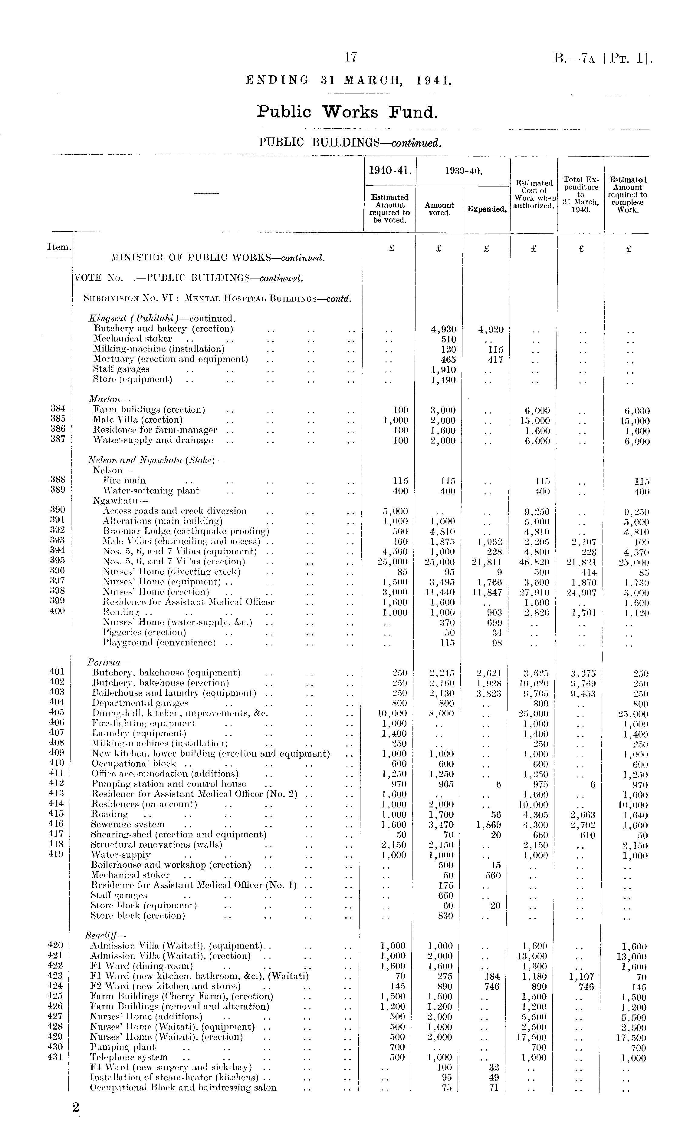 1940-41. 1939-40. TTatitnofori Total Ex- Estimated Elated penditure An , ount Estimated Work when . required to Amount Amount p w authorized. ,??I° h > "w'lt required to voted. iJ *P«ndcd. 1940. Work, be voted. Item. ££££££ MINISTER OF PUBLIC WORKS—continued. VOTE No. .—PUBLIC BUILDINGS—continued. Subdivision No. VI: Mental Hospital Buildings—contd. Kingseat (Puhitahi) —continued. Butchery and bakery (erection) .. .. .. .. 4,930 4,920 Mechanical stoker .. .. .. . . .. .. 510 Milking-machine (installation) .. .. .. .. 120 115 Mortuary (erection and equipment) .. .. .. .. 465 417 Staff garages .. .. .. .. .. .. 1,910 Store (equipment) .. .. .. .. .. .. 1,490 Marton— 384 Farm buildings (erection) .. .. .. .. 100 3,000 .. 6,000 .. 6,000 385 Male Villa (erection) .. .. .. .. 1,000 2,000 .. 15,000 .. 15,000 386 Residence for farm-manager .. .. .. .. 100 1,600 .. 1,600 .. 1,600 387 Water-supply and drainage .. .. .. .. 100 2,000 .. 6,000 .. 6,000 Nelson and Ngawhatu (Stoke) — Nelson— 388 Fire main .. .. .. .. .. 115 115 .. 115 .. 115 389 Water-softening plant .. .. .. .. 400 400 .. 400 .. 400 Ngawhatu— 390 Access roads and creek diversion .. .. .. 5,000 .. .. 9,250 .. 9,250 391 Alterations (main building) .. .. .. 1,000 1,000 .. 5,000 .. 5,000 392 Braemar Lodge (earthquake proofing) .. .. 500 4,810 .. 4,810 .. 4,810 393 Male Villas (channelling and access) .. .. .. 100 1,875 1,962 2,205 2,107 100 394 Nos. 5, 6, and 7 Villas (equipment) .. .. .. 4,500 1,000 228 4,800 228 4,570 395 Nos. 5, 6, and 7 Villas (erection) .. .. .. 25,000 25,000 21,811 46,820 21,821 25,000 396 Nurses' Home (diverting creek) . < .. .. 85 95 9 500 414 85 397 Nurses'Home (equipment) .. .. .. .. 1,500 3,495 1,766 3,600 1,870 1,730 398 Nurses'Home (erection) .. .. .. .. 3,000 11,440 11,847 27,910 24,907 3,000 399 Residence for Assistant Medical Officer .. .. 1,600 1,600 .. 1,600 .. 1,600 400 Roading .. .. .. .. .. .. 1,000 1,000 903 2,820 1,701 1,120 Nurses'Home (water-supply, &c.) .. .. .. .. 370 699 Piggeries (erection) .. .. .. .. .. 50 34 Playground (convenience) .. .. .. .. .. 115 98 Porirua — 401 Butchery, bakehouse (equipment) .. .. .. 250 2,245 2,621 3,625 3,375 250 402 Butchery, bakehouse (erection) .. .. .. 250 2,160 1,928 10,020 9,769 250 403 Boilerhouse and laundry (equipment) .. .. .. 250 2,130 3,823 9,705 9,453 250 404 Departmental garages .. .. .. .. 800 800 .. 800 . . 800 405 Dining-hall, kitchen, improvements, &c. .. .. 10,000 8,000 .. 25,000 .. 25,000 406 Fire-fighting equipment .. .. .. .. 1,000 .. .. 1,000 .. 1,000 407 Laundry (equipment) .. .. .. .. 1,400 .. .. 1,400 .. 1,400 408 Milking-machines (installation) .. .. .. 250 .. .. 250 .. 250 409 New kitchen, lower building (erection and equipment) .. 1,000 1,000 .. 1,000 .. 1,000 410 Occupational block .. .. .. .. .. 600 600 .. 600 .. 600 411 Office accommodation (additions) .. .. .. 1,250 1,250 .. 1,250 .. 1,250 412 Pumping station and control house .. .. .. 970 965 6 975 6 970 413 Residence for Assistant Medical Officer (No. 2) .. .. 1,600 .. .. 1,600 .. 1,600 414 Residences (on account) .. .. .. .. 1,000 2,000 .. 10,000 .. 10,000 415 Roading .. .. .. .. .. .. 1,000 1,700 56 4,305 2,663 1,640 416 Sewerage system .. .. .. .. .. 1,600 3,470 1,869 4,300 2,702 1,600 417 Shearing-shed (erection and equipment) .. .. 50 70 20 660 610 50 418 Structural renovations (walls) .. .. .. 2,150 2,150 .. 2,150 .. 2,150 419 Water-supply .. .. .. .. .. 1,000 1,000 .. 1,000 .. 1,000 Boilerhouse and workshop (erection) .. .. .. .. 500 15 Mechanical stoker .. .. .. .. .. .. 50 560 Residence for Assistant Medical Officer (No. 1) .. .. .. 175 Staff garages .. .. .. .. .. .. 650 Store block (equipment) .. .. .. .. .. 60 20 Store block (erection) .. .. .. .. .. 830 Seacli.ff — 420 Admission Villa (Waitati), (equipment).. .. .. 1,000 1,000 .. 1,600 .. 1,600 421 Admission Villa (Waitati), (erection) .. .. .. 1,000 2,000 .. 13,000 .. 13,000 422 F1 Ward (dining-room) .. .. .. .. 1,600 1,600 .. 1,600 .. 1,600 423 F1 Ward (new kitchen, bathroom, &e.), (Waitati) .. 70 275 184 1,180 1,107 70 424 F2 Ward (new kitchen and stores) .. .. .. 145 890 746 890 746 145 425 Farm Buildings (Cherry Farm), (erection) .. .. 1,500 1,500 .. 1,500 .. 1,500 426 Farm Buildings (removal and alteration) .. .. 1,200 1,200 .. 1,200 .. 1,200 427 Nurses'Home (additions) .. .. .. .. 500 2,000 .. 5,500 .. 5,500 428 Nurses'Home (Waitati), (equipment) .. .. .. 500 1,000 .. 2,500 .. 2,500 429 Nurses'Home (Waitati), (erection) .. .. .. 500 2,000 .. 17,500 .. 17,500 430 Pumping plant .. .. .. .. .. 700 .. .. 700 .. 700 431 Telephone system .. .. .. .. .. 500 1,000 .. 1,000 .. 1,000 F4 Ward (new surgery and sick-bay) .. .. .. .. 100 32 Installation of steam-heater (kitchens) .. .. .. .. 95 49 Occupational Block and hairdressing salon .. .. .. 75 71