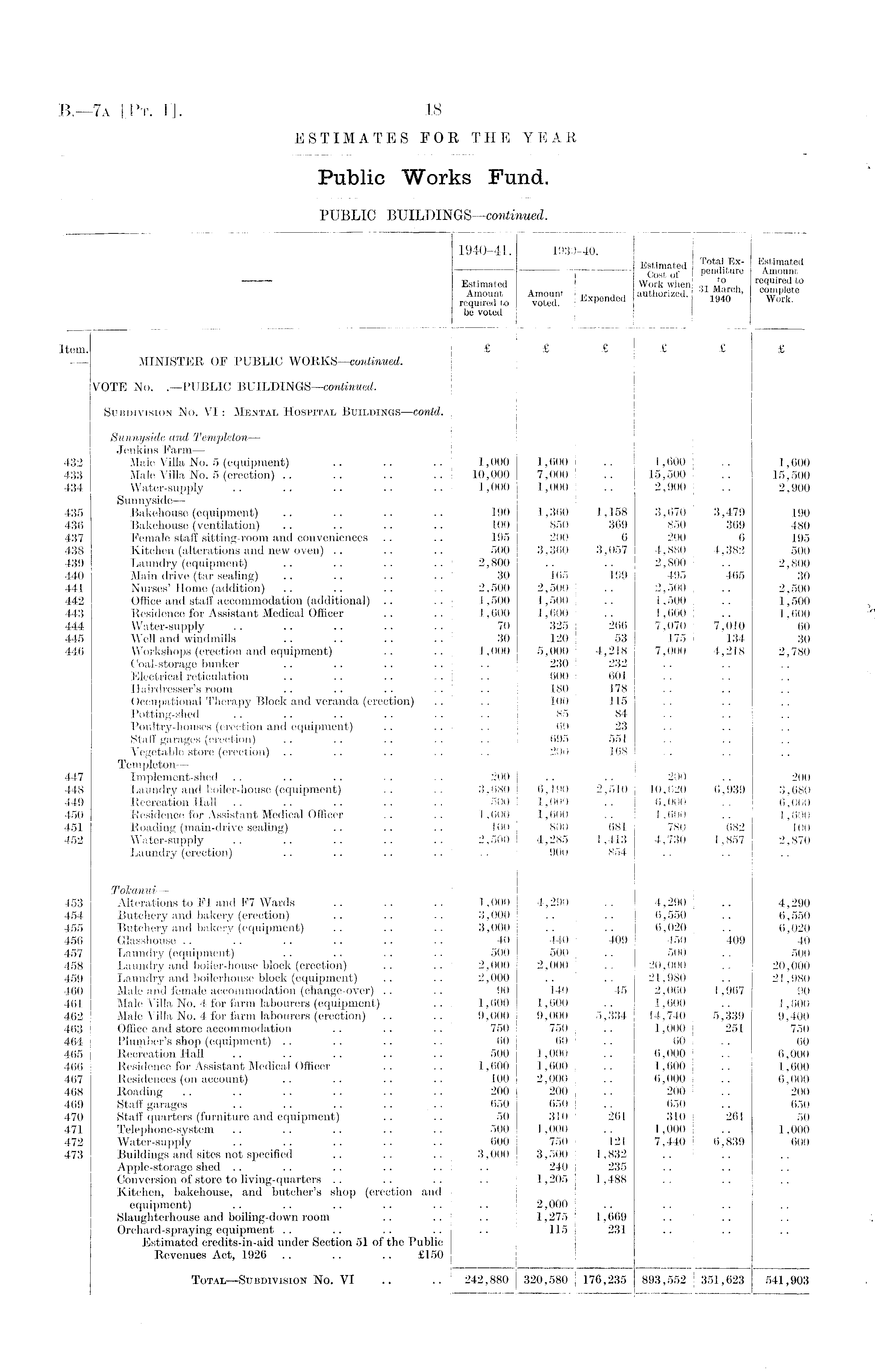 ESTIMATES FOR THE YEAR Public Works Fund. PUBLIC BUILDINGS— continued. 1940-41. 1939-40. Estimated Tota > Ex - Estimated Cos " 0 f pemliture Amoum Estimated Work when „ *° required to Amount Amount VmiriAa , authorized. • il " a ' ch ' °w' P ete required to voted. Bx P™ded 1940 Work. be voted Item. ££££££ MINISTER OF PUBLIC WORKS—continued. VOTE No. —PUBLIC BUILDINGS— continued. Subdivision No. VI: Mental Hospital Buildings— contd. Sunnyside and Templeton — Jenkins Farm— 432 Male Villa No. 5 (equipment) .. •• ■• 1,000 1,600 .. 1,600 .. 1,600 433 Male Villa No. 5 (erection) .. .. .. .. 10,000 7,000 .. 15,500 .. 15,500 434 Water-supply .. .. .. .. ... 1,000 1,000 .. 2,900 .. 2,900 Sunnyside— 435 Bakehouse (equipment) .. .. .. .. 190 1,360 1,158 3,670 3,479 190 436 Bakehouse (ventilation) .. .. .. .. 100 850 369 850 369 480 437 Female staff sitting-room and conveniences .. .. 195 200 6 200 6 195 438 Kitchen (alterations and new oven) .. .. .. 500 3,360 3,057 4,880 4,382 500 439 Laundry (equipment) .. .. .. .. 2,800 .. .. 2,800 .. 2,800 440 Main drive (tar sealing) .. .. .. .. 30 165 199 495 465 30 441 Nurses'Home (addition) .. .. .. .. 2,500 2,500 .. 2,500 .. 2,500 442 Office and staff accommodation (additional) .. .. 1,500 1,500 .. 1,500 .. 1,500 443 Residence for Assistant Medical Officer .. .. 1,600 1,600 .. 1,600 .. 1,600 444 Water-supply .. .. .. .. .. 70 325 266 7,070 7,010 60 445 Well and windmills .. .. .. .. 30 120 53 175 134 30 446 Workshops (erection and equipment) .. .. 1,000 5,000 4,218 7,000 4,218 2,780 Coal-storage bunker .. .. .. .. . . 230 232 Electrical reticulation .. .. .. .. .. 600 601 Hairdresser's room .. .. .. .. .. 180 178 Occupational Therapy Block and veranda (erection) .. .. 100 115 Potting-shed .. .. .. .. .. .. 85 84 Poultry-houses (erection and equipment) .. .. .. 60 23 Staff garages (erection) .. .. .. .. .. 695 551 Vegetable store (erection) .. .. .. .. .. 200 168 Templeton— 447 Implement-shed .. .. .. .. .. 200 .. .. 200 .. 200 448 Laundry and boiler-house (equipment) .. .. 3,680 6,190 2,510 10,620 6,939 3,680 449 Recreation Hall .. .. .. .. .. 500 1,000 .. 6,000 .. 6,000 450 Residence for Assistant Medical Officer .. .. 1,600 1,600 .. 1,600 .. 1,600 451 Roading (mam-drive sealing) .. .. . . 100 800 681 780 682 100 452 Water-supply .. .. .. .. .. 2,500 4,285 1,413 4,730 1,857 2,870 Laundry (erection) .. .. .. .. .. 900 i 854 T O IcO/TVHi i 453 Alterations to Fl and F7 Wards .. .. .. 1,000 4,290 .. 4,290 .. 4,290 454 Butchery and bakery (erection) .. .. .. 3,000 .. .. 6,550 .. 6,550 455 Butchery and bakery (equipment) .. .. .. 3,000 .. .. 6,020 .. 6,020 456 Glasshouse .. .... .. .. .. 40 440 409 450 409 40 457 Laundry (equipment) .. .. .. .. 500 500 .. 500 .. 500 458 Laundry and boiler-house block (erection) .. .. 2,000 2,000 .. 20,000 .. 20,000 459 Laundry and boilerhouse block (equipment) .. .. 2,000 .. .. 21,980 .. 21,980 460 Male and female accommodation (change-over) .. .. 90 140 45 2,060 1,967 90 461 Male Villa No. 4 for farm labourers (equipment) .. 1,600 1,600 .. 1,600 .. 1,600 462 Male Villa No. 4 for farm labourers (erection) .. .. 9,000 9,000 5,334 14,740 5,339 9,400 463 Office and store accommodation .. .. ..I 750 750 .. 1,000 251 750 464 Plumber's shop (equipment) .. .. .. .. 60 60 .. 60 .. 60 465 Recreation Hall .. .. .. .. .. 500 1,000 .. 6,000 .. 6,000 466 Residence for Assistant Medical Officer .. .. 1,600 1,600 .. 1,600 .. 1,600 467 Residences (on account) .. .. .. .. 100 2,000 .. 6,000 .. 6,000 468 Roading . . .. .. .. .. .. 200 . 200 .. 200 .. 200 469 Staff garages .. .. .. .. ... 650 650 .. 650 .. 650 470 Staff quarters (furniture and equipment) .. .. 50 310 261 310 261 50 471 Telephone-system .. .. .. .. ".. 500 1,000 .. 1,000 .. 1,000 472 Water-supply .. .. .. .. .. 600 750 121 7,440 6,839 600 473 Buildings and sites not specified .. .. .. 3,000 3,500 1,832 Apple-storage shed .. .. .. .. .. .. 240 235 Conversion of store to living-quarters .. .. .. .. 1,205 1,488 Kitchen, bakehouse, and butcher's shop (erection and equipment) .. .. .. .. .. .. 2,000 Slaughterhouse and boiling-down room .. .. .. 1,275 1,669 Orchard-spraying equipment .. .. .. .. .. 115 231 Estimated credits-in-aid under Section 51 of the Public Revenues Act, 1926 .. .. .. £150 Total—Subdivision No. VI .. .. 242,880 320,580 176,235 893,552)351,623 541,903
