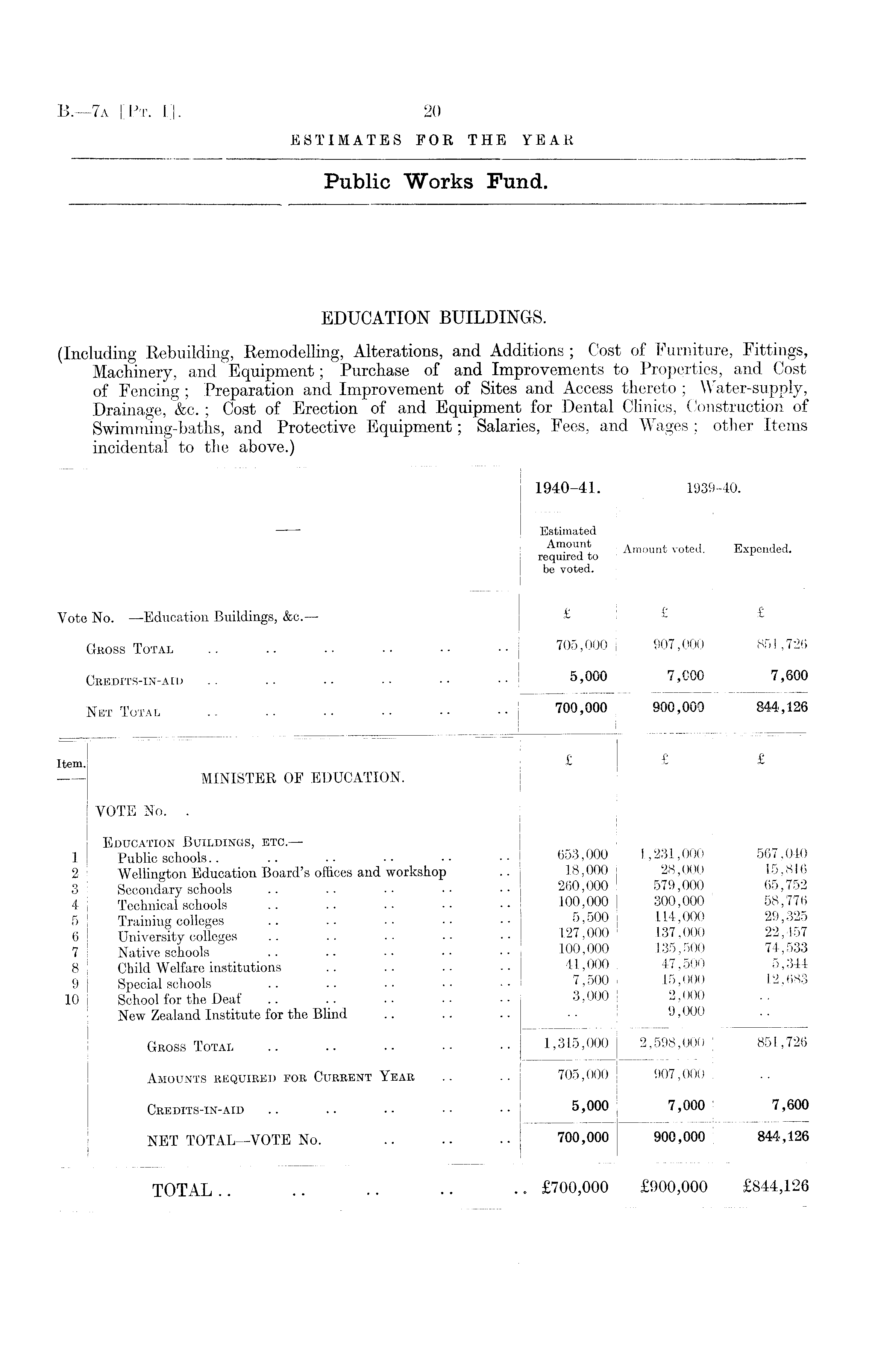 (Including Rebuilding, Remodelling, Alterations, and Additions ; Cost of Furniture, Fittings, Machinery, and Equipment; Purchase of and Improvements to Properties, and Cost of Fencing ; Preparation and Improvement of Sites and Access thereto ; Water-supply, Drainage, &c. ; Cost of Erection of and Equipment for Dental Clinics, Construction of Swimming-baths, and Protective Equipment; Salaries, Fees, and Wages ; other Items incidental to the above.) 1940-41. 1939-40. Estimated Amount Amount voted, j Expended, required to be voted. Vote No. —Education Buildings, &c. — £ £ £ GROSS TOTAL .. .. .. .. •• •• 705,000 907,000 851,726 Credits-IN-AID .. .. .. •• •• •• 5,000 7,000 7,600 NET TOTAL .. .. •• •• •• •• 700,000 900,000 844,126 Item. £ £ £ MINISTER OF EDUCATION. VOTE No. . Education Buildings, etc. — 1 Public schools.. .. .. •• •• 653,000 1,231,000 56 (,040 2 Wellington Education Board's offices and workshop .. 18,000 28,000 15,816 3 Secondary schools .. .. •• •• 260,000 579,000 65,752 4 Technical schools .. .. •• •• •• 100,000 300,000 58,776 5 Training colleges .. .. •• •• 5,500 114,000 29,325 6 University colleges .. .. •• •• •• 127,000 137,000 22,457 7 Native schools .. .. •• •• •• 100,000 135,500 (4,533 8 Child Welfare institutions .. .. .. •• 41,000 47,500 5,344 9 Special schools .. .. ■■ •• 7,500 15,000 12,683 10 School for the Deaf .. .. .. •• •• 3,000 2,000 New Zealand Institute for the Blind .. .. .. •• 9,000 Gross Total .. .. .. •• •• 1,315,000 2,598,000 851,726 Amounts required for Current Year .. .. 705,000 907,000 Credits-in-aid .. .. .. •• •• 5,000 7,000 7,600 NET TOTAL—VOTE No. .. .. •• 700,000 900,000 844,126 TOTAL .. .. .. • • • • £700,000 £900,000 £844,126