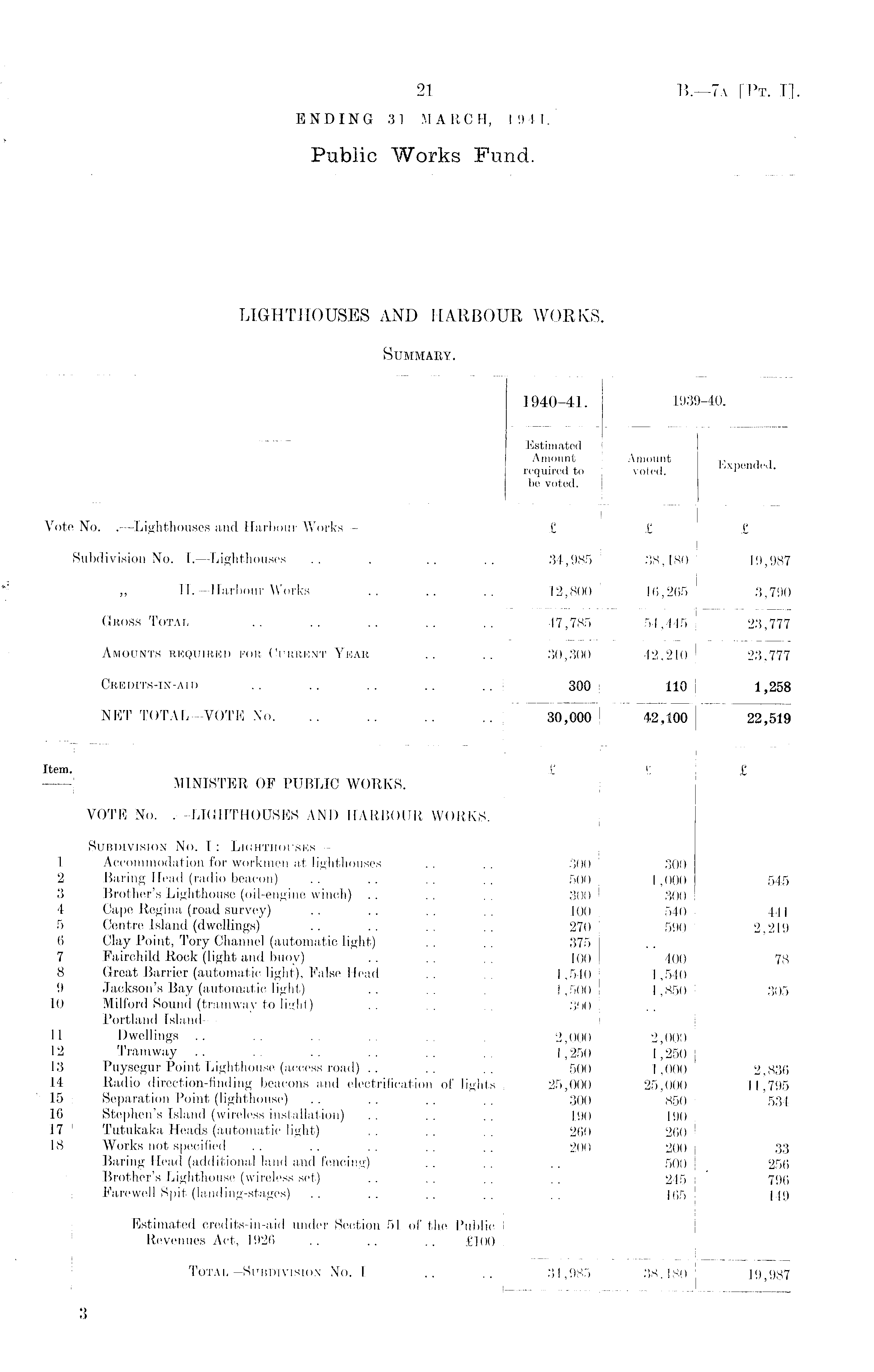 1940-41. 1939-40. Estimated Amount Amount w , , required to voted. Expended, be voted. — Vote No. . —Lighthouses and Harbour Works— £ £ £ Subdivision No. I. —Lighthouses .. .. .. .. 34,985 38,180 19,987 „ II. —Harbour Works .. .. .. 12,800 16,265 3,790 Gross Total .. .. .. .. .. 47,785 54,445 23,777 | I Amounts required fob Current Year .. .. 30,300 42,210 23,777 Credits-IN-AID .. .. .. .. 300 110 1,258 NET TOTAL—VOTE No. .. .. .. .. 30,000 42,100 22,519 Item. £ £ £ MINISTER OF PUBLIC WORKS. VOTE No. .—LIGHTHOUSES AND HARBOUR WORKS. Subdivision No. I: Lighthouses— 1 Accommodation for workmen at lighthouses . . . . 300 300 2 Baring Head (radio beacon) .. .. .. .. 500 1,000 54-5 3 Brother's Lighthouse (oil-engine winch) .. .. .. 300 300 4 Cape Regina (road survey) .. .. .. ,. 100 540 441 5 Centre Island (dwellings) .. .. .. .. ! 270 590 2,219 6 Clay Point, Tory Channel (automatic light) .. .. 375 7 Fairchild Rock (light and buoy) .. . . . . 100 400 78 8 Great Barrier (automatic light), False Head .. .. 1,540 1,540 9 Jackson's Bay (automatic light) .. .. 1,500 1,850 305 10 Milford Sound (tramway to light) .. .. .. 300 Portland Island— 11 Dwellings .. .. .. .. .. 2,000 2,000 12 Tramway .. .. .. .. .. .. 1,250 1,250 13 Puysegur Point Lighthouse (access road) .. .. .. 500 1,000 2,836 14 Radio direction-finding beacons and electrification of lights 25,000 25,000 11,795 15 Separation Point (lighthouse) .. .. .. .. 300 850 534 16 Stephen's Island (wireless installation) .. . . . . 190 190 17 Tutukaka Heads (automatic light) .. .. .. 260 260 18 Works not specified .. .. .. .. .. 200 200 . 33 Baring Head (additional land and fencing) . . .. .. 500 256 Brother's Lighthouse (wireless set) .... .. .. .. 245 ' 796 Farewell Spit (landing-stages) .. .. .. .. .. 165 149 Estimated credits-in-aid under Section 51 of the Public Revenues Act, 1926 .. .. .. £100 Total—Subdivision No. I .. .. 34,985 38,180 19,987