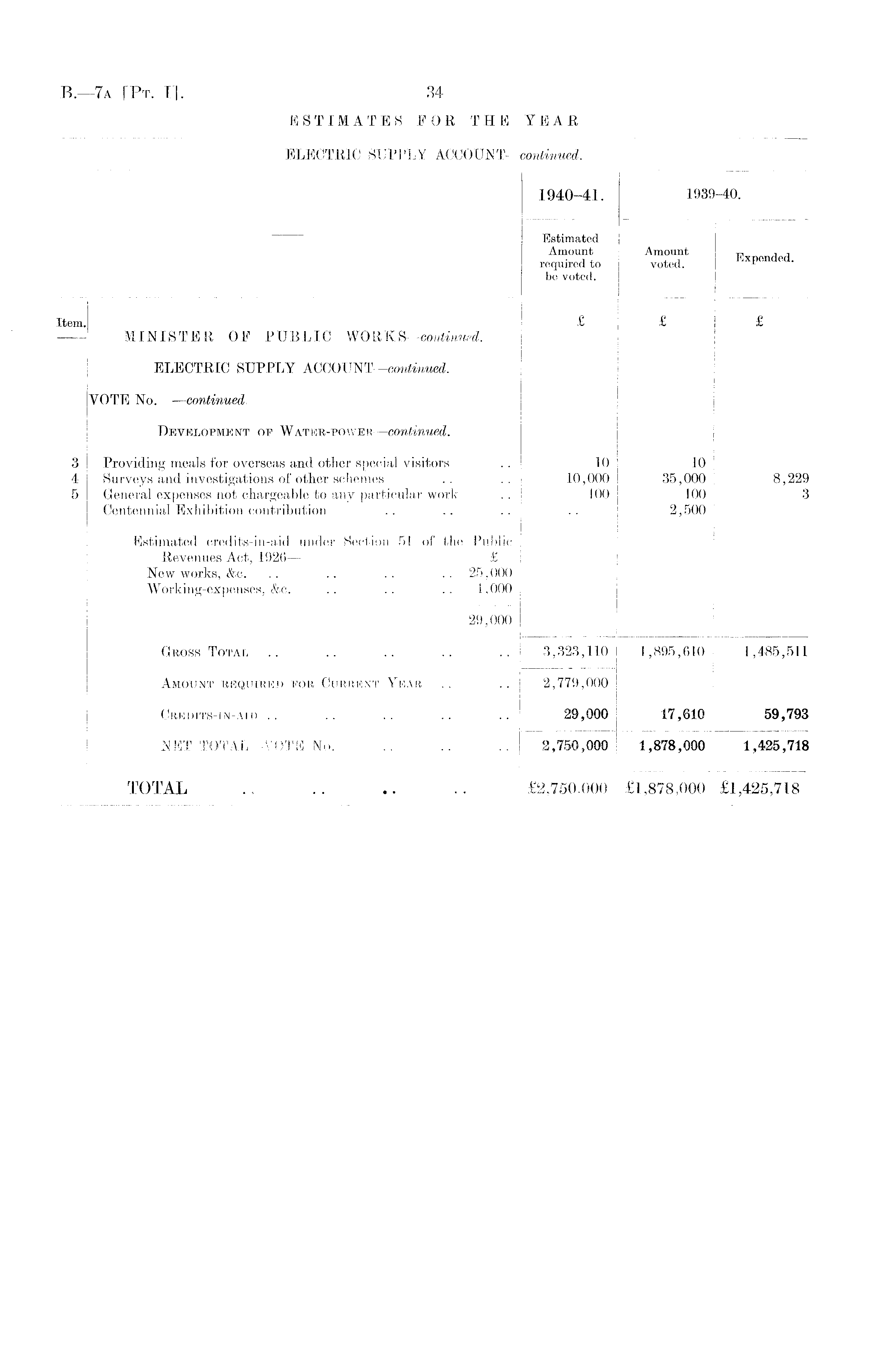 1940-41. 1939-40. Estimated Amount Amount ,, , , required to voted. Expended, be voted. Item. £ £ £ MINISTER OF PUBLIC WOR K S—continued. ELECTRIC SUPPLY ACCOUNT —continued. VOTE No. —continued. Development of Water-power—continued. 3 Providing meals for overseas and other special visitors .. 10 10 4 Surveys and investigations of other schemes .. .. 10,000 35,000 8,229 5 General expenses not chargeable to any particular work .. 100 100 3 Centennial Exhibition contribution .. .. .. .. 2,500 Estimated credits-in-aid under Section 51 of the Public Revenues Act, 1926 — £ New works, &c. .. .. .. .. 25,000 Working-expenses, &c. .. .. .. 4,000 29,000 GROSS Total .. .. .. .. .. 3,323,110 1,895,610 1,485,511 Amount required for Current Year .. .. 2,779,000 Credits-IN-aid .. .. .. .. .. 29,000 17,610 59,793 I NET TOTAL—VOTE No. .. .. .. 2,750,000 1,878,000 1,425,718 TOTAL .. .. .. .. £2,750,000 £1,878,000 £1,425,718