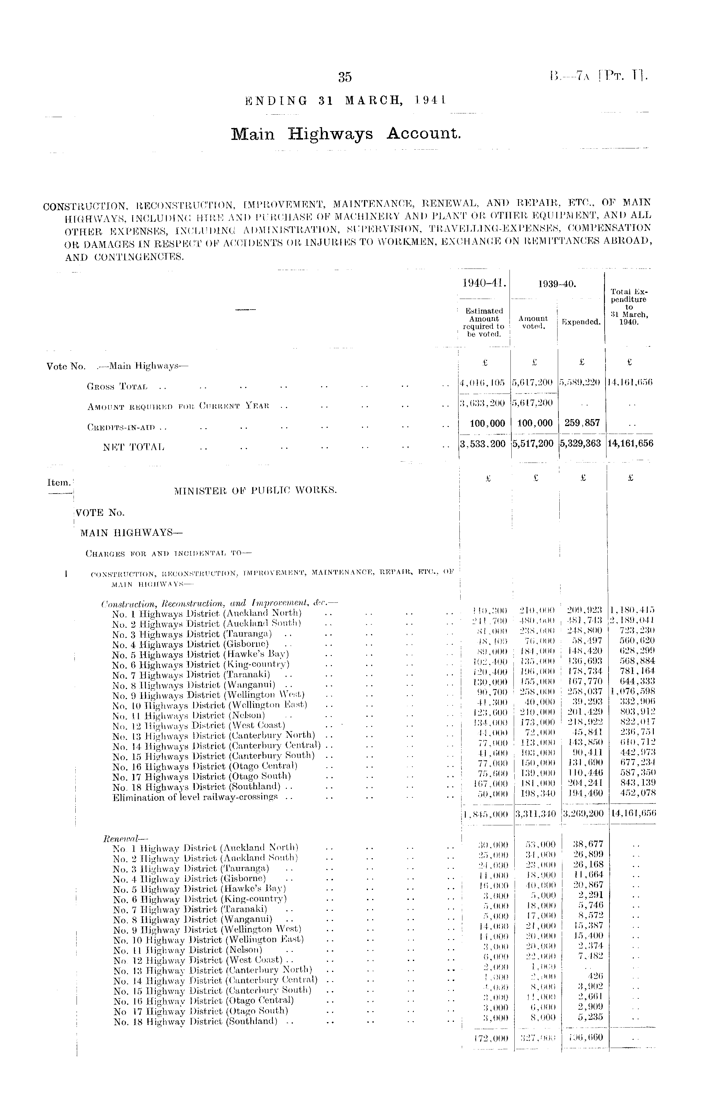 1940-41. 1939^0. Total Expenditure Estimated 31 March required* to Ex P ended - i' 940 ' ' be voted. Vote No. . —Main Highways — £ £ £ £ Gross Total .. .. •• •• •• 4,016,105 5,617,200 5,589,220 14,161,656 Amount beqoibed fob Curbent Year .. .. .. •• 3,633,200 5,617,200 Credits-IN-AID J.00,000 100,000 259,857 NET TOTAL . • • • • • • • • • • 3,533,200 5,517,200 5,329,363 14,161,656 Item. £ £ ; £ £ MINISTER OF PUBLIC WORKS. VOTE No. MAIN HIGHWAYS— Charges for and incidental to — 1 CONSTRUCTION, RECONSTRUCTION, IMPROVEMENT, MAINTENANCE, REPAIR, ETC., OF MATN HIGHWAYS — 110,300 j 210,000 209,923 1,180,415 No. 2 Highways District South)' 241 700 ! 480,000 48 , 43 2, 9,041 SiSASSSSf :: :: :: :: :: KoilK IK III:™ No 5 Highways District (Hawke's Bay) .. .. 89,000 184,000 148,420 628,299 No' 6 Highways District King-country) 102,400 135,000 136,693 568,884 No! 7 Highways District (Tarfnaki) 120,400 196,000 178,734 781,164 No 8 Highways District (Wanganui) .. .. •• •• 130,000 155,000 167,770 644,333 No! 9 Highways District (Wellington West) HO,700 258,000 258,037 1,0 6,59 No. 10 Highways District (Wellington East) ■■ oin'ooo 2m'429 sol'qi? \r 0 ii T-lio'liwavi Distxiot • • • • • • • • 123,600 -il0,u()0 oUo,yi»j No! 12 Highways District (West Coast) ■ 134,000 173,000 218,922 822,017 No. 13 Highways District (Canterbury North) .. .. .. •• 44,000 72,000 45,841 236,751 No. 14 Highways District (Canterbury Central) .. .. . • ■■ ins'nnn qo'at? !u.9' No. 15 Highways District (Canterbury South) .. .. . . •• Jsn'ooo ri'lWO 677'234 No. 16 Highways District (Otago Central) .. .. •• No. 17 Highways District (Otago South) .. .. •• •• JM00 IHa '9a? No. 18 Highways District (Southland) rn'nnn iqs'340 m'460 452'o78 Elimination of level railway-crossings .. .. .. •• o0,000 198,340 194,460 4,>2,078 1,845,000 3,311,340 3,269,200 14,161,656 ftp'H pf \)ft 7— No 1 Highway District (Auckland North) .. .. •• 9fi'sqq No. 2 Highway District (Auckland South) .. .. •• 899 No. 3 Highway District (Tauranga) •• -4,000 23,000 26,168 No. 4 Highway District (Gisborne) .. .. 1.000 18>000 11,664 No. 5 Highway District (Hawke's Bay) .. •• r'nnn 9 9Q1 No. 6 Highway District (King-country) .. •• •• •• £>000 o,000 2, JI No. 7 Highway District (Taranaki) .. .. •• •• 5,000 18,000 o,74 No. 8 Highway District (Wanganui) .. .. •• 17,000 8,57No. 9 Highway District (Wellington West) .. .. • • • • 14,000 21,000 15,387 No. 10 Highway District (Wellington East) .. .. ■■ •• q'™ No. 11 Highway District (Nelson) .. .. •• •• 3,000 -0,000 -,,374 No. 12 Highway District (West Coast) .. .. •• •• No. 13 Highway District (Canterbury North) .. .. .. •• ~,000 J'™ ' No. 14 Highway District (Canterbury Central) .. .. •• 1.000 No. 15 Highway District (Canterbury South) .. .. .. 4,000 8,000 3,J0No. 16 Highway District (Otago Central) 3,000 11,000 2,661 No 17 Highway District (Otago South) .. •• 3,000 6,000 , No. 18 Highway District (Southland) .. .. . ■ •• •• 3,000 8,000 o,2,i5 172,000 327,000 l'J6,660