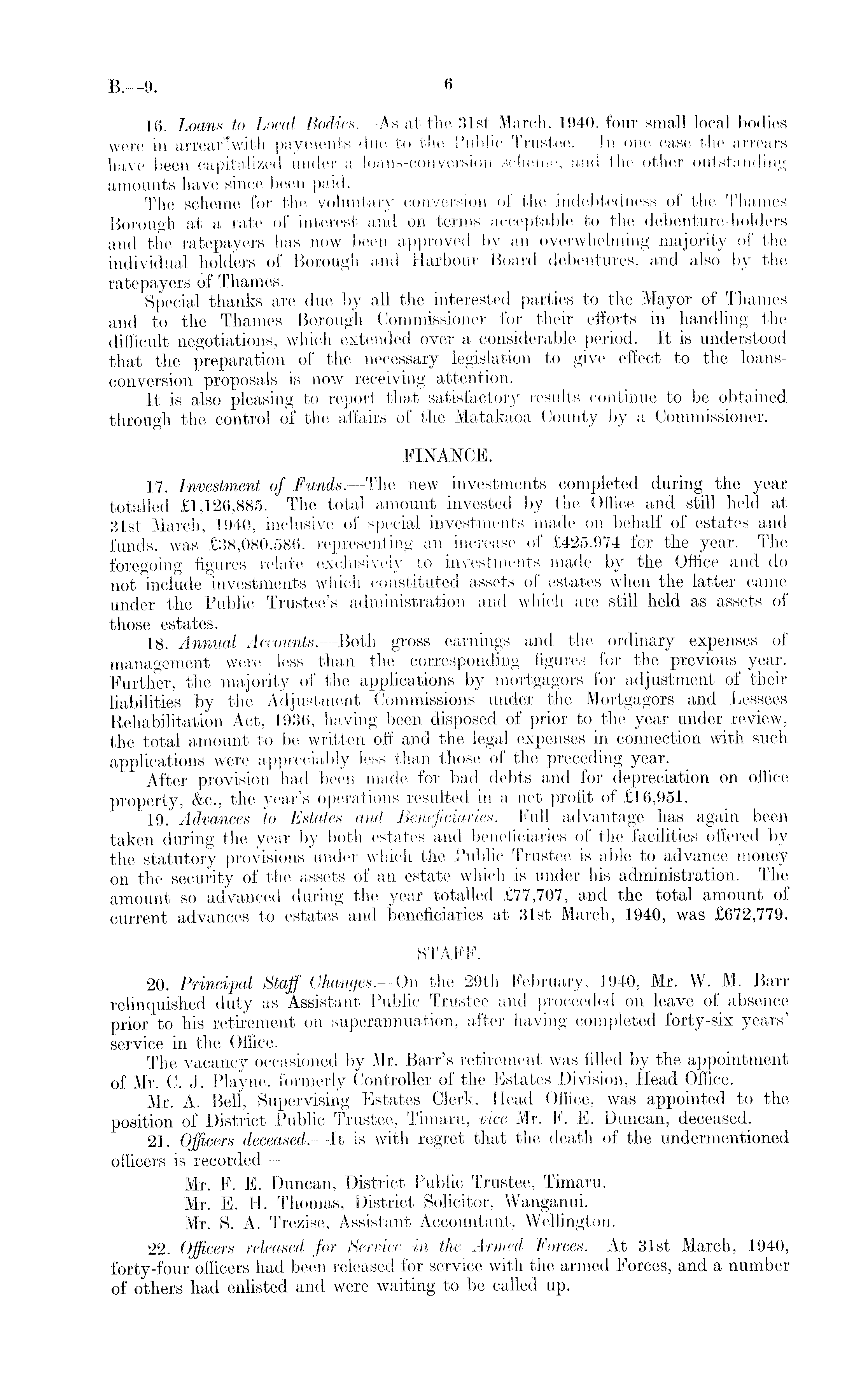 16. Loans to Local Bodies. —As at the 31st March, 1940, four small local bodies were in arrearTwith payments due to the Public Trustee. In one case the arrears have been capitalized under a loans-conversion scheme, and the other outstanding amounts have since been paid. The scheme for the voluntary conversion of the indebtedness of the Thames Borough at a rate of interest and on terms acceptable to the debenture-holders and the ratepayers has now been approved by an overwhelming majority of the individual holders of Borough and Harbour Board debentures, and also by the ratepayers of Thames. Special thanks are due by all the interested parties to the Mayor of Thames and to the Thames Borough Commissioner for their efforts in handling the difficult negotiations, which extended over a considerable period. It is understood that the preparation of the necessary legislation to give effect to the loansconversion proposals is now receiving attention. It is also pleasing to report that satisfactory results continue to be obtained through the control of the affairs of the Matakaoa County by a Commissioner. FINANCE. 17. Investment of Funds. —The new investments completed during the year totalled £1,126,885. The total amount invested by the Office and still held at 31st March, 1940, inclusive of special investments made on behalf of estates and funds, was £38,080,586, representing an increase of £425,974 for the year. The foregoing figures relate exclusively to investments made by the Office and do not include investments which constituted assets of estates when the latter came under the Public Trustee's administration and which are still held as assets of those estates. 18. Annual Accounts. —Both gross earnings and the ordinary expenses of management were less than the corresponding figures for the previous year. Further, the majority of the applications by mortgagors for adjustment of their liabilities by the Adjustment Commissions under the Mortgagors and Lessees Rehabilitation Act, 1936, having been disposed of prior to the year under review, the total amount to be written off and the legal expenses in connection with such applications were appreciably less than those of the preceding year. After provision had been made for bad debts and for depreciation on office property, &c., the year's operations resulted in a net profit of £16,951. 19. Advances to Estates and Beneficiaries. —Full advantage has again been taken during the year by both estates and beneficiaries of the facilities offered by the statutory provisions under which the Public Trustee is able to advance money on the security of the assets of an estate which is under his administration. The amount so advanced during the year totalled £77,707, and the total amount of current advances to estates and beneficiaries at 31st March, 1940, was £672,779. STAFF. 20. Principal Staff Changes.—On the 29th February, 1940, Mr. W. M. Barr relinquished duty as Assistant Public Trustee and proceeded on leave of absence prior to his retirement on superannuation, after having completed forty-six years' service in the Office. The vacancy occasioned by Mr. Barr's retirement was filled by the appointment of Mr. C. J. Playne, formerly Controller of the Estates Division, Head Office. Mr. A. Bell, Supervising Estates Clerk, Head Office, was appointed to the position of District Public Trustee, Timaru, vice Mr. F. E. Duncan, deceased. 21. Officers deceased. —It is with regret that the death of the undermentioned officers is recorded — Mr. F. E. Duncan, District Public Trustee, Timaru. Mr. E. H. Thomas, District Solicitor, Wanganui. Mr. S. A. Trezise, Assistant Accountant, Wellington. 22. Officers released for Service in the Armed Forces. —At 31st March, 1940, forty-four officers had been released for service with the armed Forces, and a number of others had enlisted and were waiting to be called up.
