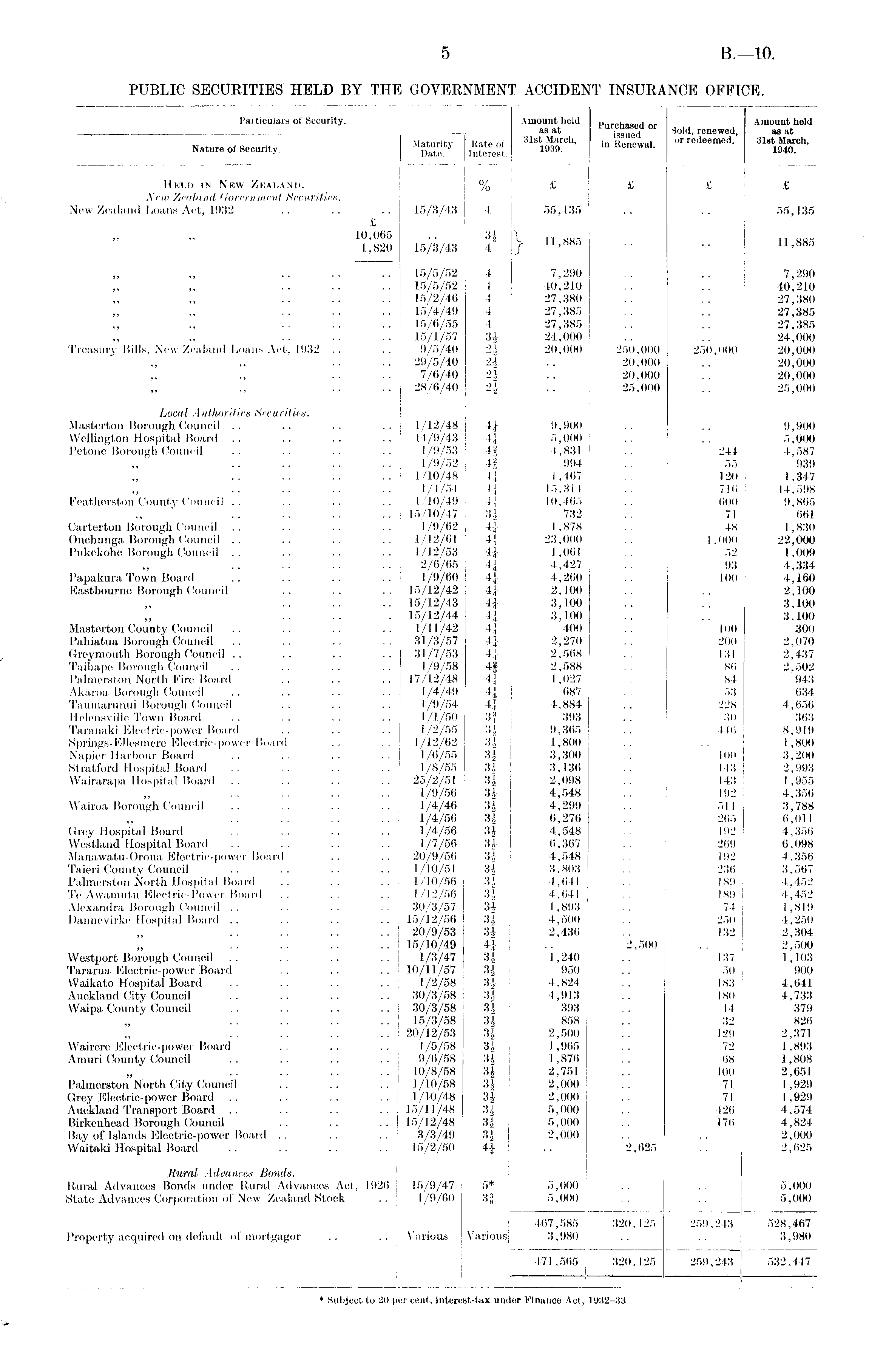 Particulars of Security. Amount held p„ rnh .««rt Amount held as at ilsnM So l d . renewed, as at Nature o! Security. | >n Itenewal. or redeemed. 31st March, Held in New Zealand. % £ £ £ £ New Zealand Government Securities. New Zealand Loans Act, 1932 .. .. .. 15/3/43 4 55,135 .. .. 55,135 £ » „ 10,065 .. 3 i \ 11 hsk .. oo1,820 15/3/43 4 / i 1 ' 880 •• ll,88o 15/5/52 4 7,290 .. .. 7,290 15/5/52 4 40,210 .. .. 40,210 15/2/46 4 27,380 .. .. 27,380 15/4/49 4 27,385 .. .. 27,385 15/6/55 4 27,385 .. .. 27,385 15/1/57 Si 24,000 .. .. 24,000 Treasury Bills, New Zealand Loans Act, 1932 .. .. 9/5/40 21 20,000 250,000 250,000 20,000 .... 29/5/40 2J . .. 20,000 .. 20,000 .... 7/6/40 2J .. 20,000 .. 20,000 .... 28/6/40 2i .. 25,000 .. 25,000 Local Authorities Securities. Masterton Borough Council .. .. .. .. 1/12/48 4J 9,900 .. .. 9,900 Wellington Hospital Board .. .. .. .. 14/9/43 1 { 5,000 .. .. 5,000 Petone Borough Council .. .. .. .. 1/9/53 4§ 4,831 .. 244 4,587 1/9/52 4£ 994 .. 55 939 1/10/48 4J 1,467 .. 120 1,347 1/4/54 4i 15,314 .. 716 14,598 Featherston County Council .. .. .. .. 1/10/49 4J 10,465 .. 600 9,865 .. 15/10/47 31 732 . . 71 661 Carterton Borough Council .. .. .. .. 1/9/62 4J 1,878 .. 48 1,830 Onehunga Borough Council .. .. .. .. 1/12/61 4| 23,000 .. 1,000 22,000 Pukekohe Borough Council .. .. .. .. 1/12/53 4} 1,061 .. 52 1,009 2/6/65 4J 4,427 .. 93 4,334 Papakura Town Board .. .. .. .. 1/9/60 4,260 .. 100 4,160 Eastbourne Borough Council .. .. .. 15/12/42 4J 2,100 .. .. 2,100 .. 15/12/43 4J 3,100 .. .. 3,100 .... . 15/12/44 4} 3,100 .. .. 3,100 Masterton County Council .. .. .. .. 1/11 /42 1] 400 .. 100 300 Pahiatua Borough Council .. .. .. .. 31/3/57 4} 2,270 .. 200 2,070 Greymouth Borough Council .. .. .. .. 31/7/53 4, J f 2,568 .. 131 2,437 Taihape Borough Council ... .. .. .. 1/9/58 4f 2,588 .. 86 2,502 Palmerston North Fire Board .. .. .. 17/12/48 4| 1,027 .. 84 943 Akaroa Borough Council .. .. .. .. 1/4/49 l,j 687 .. 53 634 Taumarunui Borough Council .. .. .. 1/9/54 4J 4,884 .. 228 4,6.56 Helensville Town Board .. .. .. .. 1/1 /SO 3J 393 .. 30 363 Taranaki Electric-power Board .. .. .. 1/2/55 3j 9,365 .. 446 8,919 Springs-Ellesmere Electric-power Board .. .. 1/12/62 31 1,800 .. 1,800 Napier Harbour Board ... .. .. .. 1/6/55 31 3,300 .. 100 3,200 Stratford Hospital Board .. .. .. .. 1/8/55 31 3,136 .. 143 2,993 Wairarapa Hospital Board .. .. .. .. 25/2/51 31 2,098 .. 143 1,955 1/9/56 31 4,548 192 4,356 Wairoa Borough Council .. .. .. .. 1/4/46 31 4,299 .. 511 3,788 ... .. .. .. 1/4/56 31 6,276 .. 265 6,011 Grey Hospital Board .. .. .. .. 1/4/56 3| 4,548 .. 192 4,356 Westland Hospital Board .. .. .. .. 1/7/56 3J 6,367 .. 269 6,098 Manawatu-Oroua Electric-power Board .. .. 20/9/56 31 4,548 .. 192 4,356 Taieri County Council .. .. .. .. 1/10/51 3f 3,803 .. 236 3,567 Palmerston North Hospital Board .. .. .. 1/10/56 31 4,641 .. 189 4,452 Te Awamutu Electric-Power Board .. .. .. 1/12/56 3| 4,641 .. 189 4,452 Alexandra Borough Council .. .. .. .. 30/3/57 31 1,893 .. 74 1,819 Dannevirke Hospital Board .. .. .. .. 15/12/56 31 4,500 .. 250 4,250 20/9/53 31 2,436 .. 132 2,304 .. 15/10/49 4J .. 2,500 .. 2,500 Westport Borough Counoil .. .. .. .. 1/3/47 31 1,240 .. 137 1,103 Tararua Electric-power Board . . .. .. 10/11/57 3J 950 .. 50 900 Waikato Hospital Board .. .. .. .. 1/2/58 3J 4,824 .. 183 4,641 Auckland City Counoil .. .. .. .. 30/3/58 31 4,913 .. 180 4,733 Waipa County Council . . .. . . .. 30/3/58 31 393 .. 14 379 15/3/58 31 858 .. 32 826 .. 20/12/53 3J 2,500 .. 129 2,371 Wakere Electric-power Board .. ... .. 1/5/58 31 1,965 .. 72 1,893 Amuri County Council ... .. .. .. 9/6/58 31 1,876 .. 68 1,808 10/8/58 31 2,751 .. 100 2,651 Palmerston North City Council .. .. .. 1/10/58 31 2,000 .. 71 1,929 Grey Eleotric-power Board ... .. .. .. 1/1(0/48 31 2,000 .. 71 1,929 Auckland Transport Board .. .. .. .. 15/11/48 31 5,000 .. 426 4,574 Birkenhead Borough Council .. .. .. 15/12/48 31 5,000 .. 176 4,824 Bay of Islands Electric-power Board .. .. .. 3/3/49 31 2,000 .. .. 2,000 Waitaki Hospital Board .. .. ... .. 15/2/50 4] .. 2,625 .. 2,625 Rural Advances Bonds. Rural Advances Bonds under Rural Advances Act, 1926 15/9/47 5* 5,000 .. .. 5,000 State Advances Corporation of New Zealand Stock .. 1/9/60 3$ 5,000 .. .. 5,000 467,585 320,125 259,243 528,467 Property acquired on default of mortgagor .. .. Various Various 3,980 .. .. 3,980 471,565 320,125 259,243 532,447 * Subject to 20 per cent, interest-tax under Finance Act, 1932-33