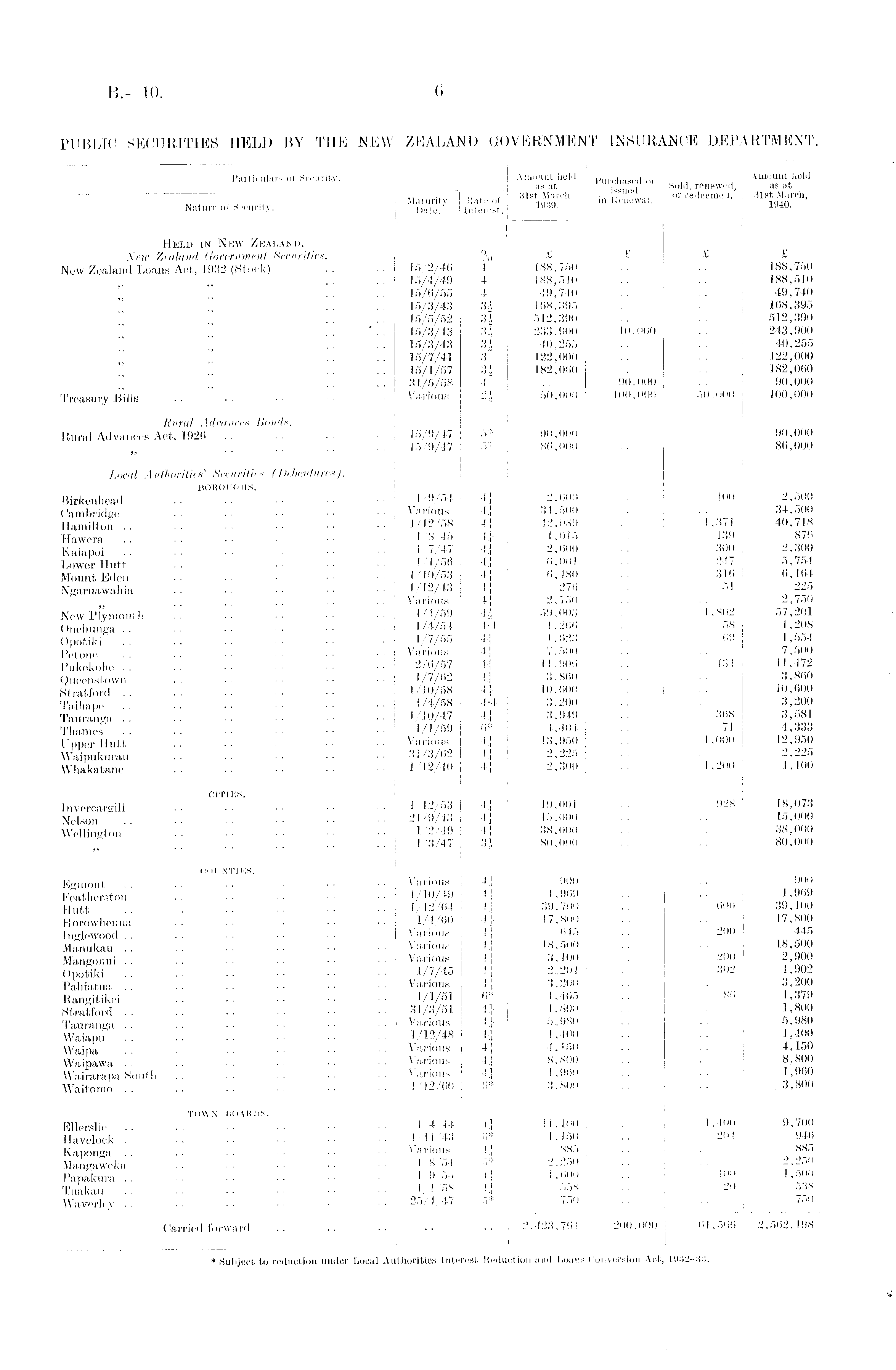 Particulars of Security. Amount held p„ rC hased or , , Amount held as at j, „ z. Sold, renewed, as at tvtofnpitw ,, Qf . , f 31st March, . ,» . or redeemed. 31st March, Maturity Rate of 1ft oQ ' in Renewal. lft40 Nature of Security. Date . interest. 19J9 ' Held in New Zealand. New Zealand Government Securities. % £ £ £ New Zealand Loans Act, 1932 (Stock) .. .. 15/2/46 4 188,750 .. .. 188,750 15/4/49 4 188,510 .. .. 188,510 15/6/55 4 49,740 .. .. 49,740 " " .... 15/3/43 3i 168,395 .. . . 168,395 .... 15/5/52 3i 512,390 .. 512,390 15/3/43 3| 233,900 10,000 .. 243,900 15/3/43 3J 40,255 .. . . 40,255 15/7/41 3 122,000 .. . . 122,000 15/1/57 3£ 182,060 .. .. 182,060 31/5/58 4 .. 90,000 .. 90,000 Treasury Bills .. .. • • ■■ •• Various 2J 50,000 100,000 50,000 100,000 Rural Advances Bonds. Rural Advances Act, 1926 .. .. .. 15/9/47 5* 90,000 .. 90,000 15/9/47 5* 86,000 .. . . 86,000 Local Authorities' Securities (Debentures). BOROUGHS. Birkenhead 1/9/54 H 2,600 .. 100 2,500 Cambridge .. • • • • • ■ • • Various 4j 34,500 .. . . 34,500 Hamilton 1/12/58 4* 42,089 1,371 40,718 Hawera 1/8/45 4* 1,015 .. 139 876 Kaiapoi 1/7/47 4J 2,600 .. 300 2,300 Lower Hutt 1/1/56 4J 6,001 .. 247 5,754 Mount Eden .. •• 1/10/53 4J 6,480 .. 316 Ngaruawahia .. • • ■ • • • • ■ 1/12/43 4J 276 ■. 51 225 S .. .. .. .. .. Various 4£ 2,750 .. . . 2,750 New Plymouth .. .. •• •• 1/4/59 4| 59,003 1,802 57,201 Onehunga 1/4/54 4-4 1,260 .. 58 1,208 Opotiki 1/7/55 4i 1,623 .. 69 1,554 Petone .. .. .. .. Various 4£ 7,500 .. .. 7,500 Pukekohe 2/6/57 4J 11,906 .. 434 11,472 Queenstown .. •• ■■ •• 1/7/62 4.J 3,860 .. •• Stratford .. . . 1/10/58 4\ 10,600 .. .. 10,600 Taihape 1/4/58 4-4 3,200 .. .. 3,200 Tauranga .. .. •• •• 1/10/47 4|- 3,949 .. 368 ,i,o81 Thames .. .. •• 1/1/59 6* 4,404 .. 71 4,333 Upper Hutt .. .. ■■ Various 4J 13,950 .. 1,000 12,950 Waipukurau . . • . • • • ■ • • 31/3/62 4j 2,225 . • ■. Whakatane .. •• ■■ •• 1/12/40 4£ 2,300 .. 1,200 1,100 CITIES. Invercargill 1/12/53 4| 19,001 .. 928 18,073 Kelson •• 21/9/43 41 15,000 .. .. 15,000 Wellington 1/2/49 4* 38,000 .. .. 38,000 1/3/47 3| 80,000 .. .. 80,000 COUNTIES. Egmont .. . . ■ • ■ • • • ■ • Various 900 . . .. 900 Featherston 1/10/49 4* 1,969 .. .. 1,969 Hutt .. .. •• •• 1/12/64 4] 39,700 .. 600 39,100 Horowhenua .. •• •• •• •• 1/4/60 4£ 17,800 .. .. 17,800 Inglewood .. .. ■ • • • ■ • • • Various 4J 645 .. 200 445 Manukau .. .. .. •• Various 4£ .18,500 .. .. 18,500 Mangonui .. .. •• •• Various 4£ 3,100 .. 200 2,900 Opotiki 1/7/45 4i 2,204 .. 302 1,902 Pahiatua .. . . .. ■■ •• •• Various 4£ 3,200 .. .. 3,200 Rangitikei .. •• •• •• 1/1/51 6* 1,465 .. 1,3'79 Stratford 31/3/51 4J 1,800 .. .. 1,800 Tauranga .. .. .. ■■ Various 4J 5,980 .. •• 5,980 Waiapu 1/12/48 4J 1,400 .. .. ,400 Waipa .. •• Various 4| 4,150 .. .. 4,150 Waipawa .. .. .. •• •• •• Various 4| 8,800 .. .. 8,800 Wairarapa South .. .. •• •• ■■ Various 4£ 1,960 .. .. 1,960 Waitomo 1/12/60 6* 3,800 .. .. 3,800 TOWN BOAKDS. Ellerslie •• •• •• 1/4/44 4£ 11,100 .. 1,400 9,700 Havelock " .. • 1/11/43 6* 1,150 .. 204 946 Kaponga .. .. • • • • • • • • Various 4\ 885 .. ... 885 Mangaweka .. •• •• •• 1/8/54 5* 2,250 .. .. 2,250 Papakura 1/9/55 4J 1,600 .. 100 1,500 Tuakau 1/1/58 4} 558 .. 20 538 Waverley 25/4/47 5* 750 750 Carried forward .. .. .. .. 2,423,764 200,000 61,566 2,562,198 * Subject to reduction under Local Authorities Interest Reduction and Loans Conversion Act, 1932-33.