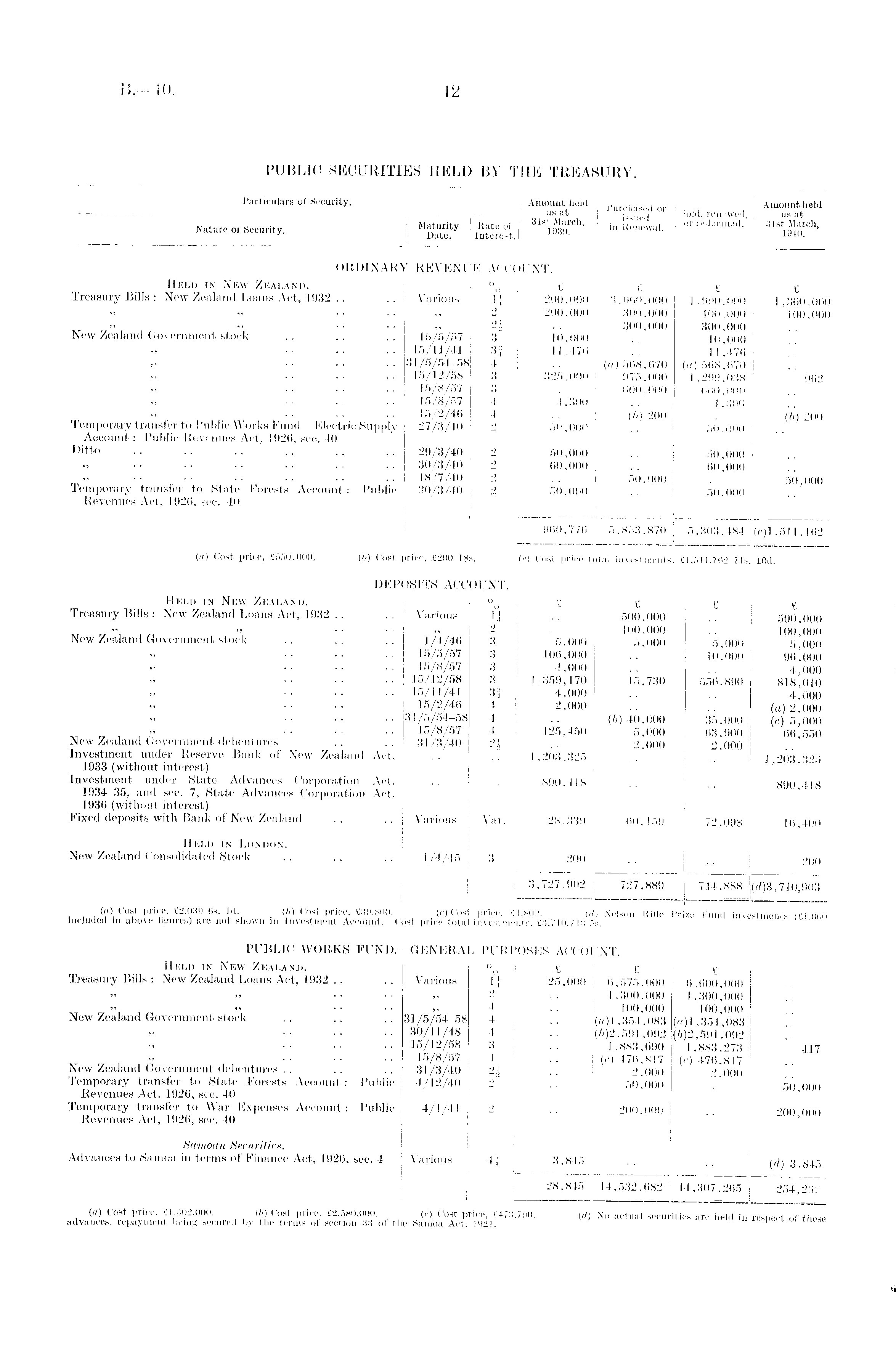 Particulars of Security. Amount hold Purchased or Amount held ——— as at issued Sold ' renew ecl, as at v , t a .. Maturity Rate of 8t March, i n ltpnpwni or redeemed. 31st March, Nature oi Security. Date Interest. 1939 " renewal. 104a • ORDINARY REVENUE ACCOUNT. Held in New Zealand. % £ £ £ £ Treasury Bills: New Zealand Loans Act, 1932 .. .. Various 1] 200,000 3,060,000 1,900,000 1,360,000 » 2 200,000 300,000 400,000 'l00^000 AT », » •• •• ». 21- .. 300,000 300,000 New Zealand Government stock .. .. .. 15/5/57 3 10,000 .. 10,000 » ■■ ■■ • ■ 15/11/41 3| 11,476 .. 11'476 !' » ■■ ■■ •• 31/5/54-58 4 .. (a)568,670 (a)568,670 15/12/58 3 325,000 975,000 1,299,038 962 15/8/57 3 .. 600,000 600,000 >> •• 15/8/57 4 4,300 .. 4,300 » •• •• • • 15/2/46 4 .. (6) 200 . . (6) 200 Temporary transfer to Public Works Fund—Electric Supply 27/3/40 2 50,000 .. 50,000 Account: Public Revenues Act, 1926, sec. 40 Ditto •• •• •• •• •• •• 29/3/40 2 50,000 .. 50,000 30/3/40 2 60,000 .. 60,000 •• •' •• 18/7/40 2 .. 50,000 .. 50,000 lemporary transfer to State Forests Account: Public 30/3/40 2 50,000 .. 50,000 Revenues Act, 1926, see. 40 960,776 5,853,870 5,303,484 (0)1,511,162 (a) Cost price, £550,000. (6) Cost price, £200 18s. (c) Cost price total Investments, £1,511,162 lis. lod. DEPOSITS ACCOUNT. Held in New Zealand. % £ £ £ £ Treasury Bills: New Zealand Loans Act, 1932 .. .. Various 1|- .. 500,000 .. 500,000 AT _„ . » •• •• » 2 •• 100,000 .. 100,'000 New Zealand Government stock .. .. .. 1/4/46 3 5,000 5,000 5,000 5,000 15/5/57 3 106,000 .. 10,000 96^000 » ■■ •• •• 15/8/57 3 4,000 .. .. 4 000 •• •• •• 15/12/58 3 1,359,170 15,730 556,890 818'010 • ■ 15/11/41 3f 4,000 . . .. 4 000 •• 15/2/46 4 2,000 .. .. ( 0 )2'000 •• 31/5/54-58 4 .. (6) 40,000 35,000 c) 5,000 .. . , , » , , , 15/8/57 4 125,450 5,000 63,900 66,550 New Zealand Government debentures .. .. 31/3/40 2J .. 2 000 2 000 Investment under Reserve Bank of New Zealand Act, .. . . 1 203 325 . . ' ' 1 0A0 •>or. 1933 (without interest) Investment under State Advances Corporation Act, .. .. 890,418 .. .. 890 418 1934-35, and sec. 7, State Advances Corporation Act, 1936 (without interest) Fixed deposits with Bank of New Zealand .. .. Various Var. 28,339 60,159 72,098 16 400 Held in London. New Zealand Consolidated Stock .. .. .. 1/4/45 3 200 .. 900 3,727,902 727,889 744,888 (d)3,710,903 (a) Cost price, £2,039 6s. Id (6) Cost price, £30,800. (c) Cost price, £4,800. (d) Nelson ltifle Prize Fund Investments (£1 000 Included in above figures) are not shown in Investment Account. Cost price total investments, £3,710,743 5s. ( ' PUBLIC WORKS FUND.—GENERAL PURPOSES ACCOUNT. Held in New Zealand. % £ £ £ Treasury Bills: New Zealand Loans Act, 1932 .. .. Various 1J 25,000 6,575,000 6,600,000 2 .. 1 1' 300000 ! .. „», .. » •• •• .. 4 .. 100,000 100,000 New Zealand Government stock .. .. .. 31/5/54-58 4 .. (a)l,354,083 (a) 1,354,083 •• 30/11/48 4 .. (4)2,591,092 (6)2,'591,'092 " 15/12/58 3 .. 1,883,690 1,883,273 417 , T „ , , » 15/8/57 4 .. (c) 476,817 (c) 476,817 New Zealand Government debentures .. .. .. 31/3/40 2£ .. 2,000 2 000 Temporary transfer to State Forests Account: Public 4/12/40 2 .. 50 000 ' k() nnn Revenues Act, 1926, sec. 40 Temporary transfer to War Expenses Account: Public 4/1/41 2 .. 200 000 9nn nnn Revenues Act, 1926, sec. 40 Samoan Securities. Advances to Samoa in terms of Finance Act, 1926, sec. 4 Various 4J 3,845 .. (d) 3 845 28,845 14,532,682 14,307,265 254,262 (a) Cost price, £1 3(32,000. <J> c " st I""' 06 - £2,580,000. (c) Cost price, £473,790. (d) No actual securities are held in respect of these advances, repayment being secured by the terms of section 33 of the Samoa Act, 1921. le&peci, 0 i uiese