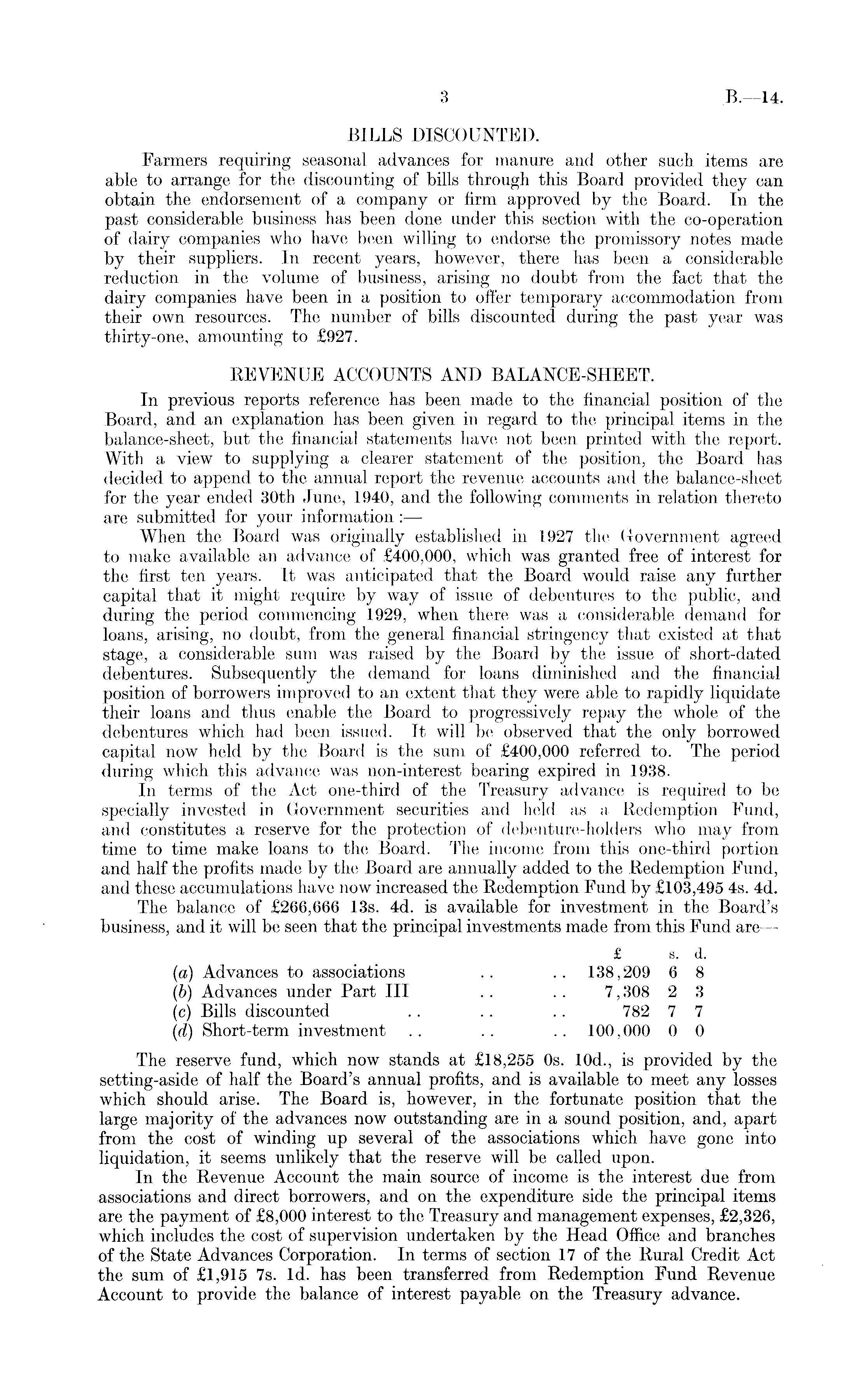 BILLS DISCOUNTED. Farmers requiring seasonal advances for manure and other such items are able to arrange for the discounting of bills through this Board provided they can obtain the endorsement of a company or firm approved by the Board. In the past considerable business has been done under this section with the co-operation of dairy companies who have been willing to endorse the promissory notes made by their suppliers. In recent years, however, there has been a considerable reduction in the volume of business, arising no doubt from the fact that the dairy companies have been in a position to offer temporary accommodation from their own resources. The number of bills discounted during the past year was thirty-one, amounting to £927. REVENUE ACCOUNTS AND BALANCE-SHEET. In previous reports reference has been made to the financial position of the Board, and an explanation has been given in regard to the principal items in the balance-sheet, but the financial statements have not been printed with the report. With a view to supplying a clearer statement of the position, the Board has decided to append to the annual report the revenue accounts and the balance-sheet for the year ended 30th June, 1940, and the following comments in relation thereto are submitted for your information : — When the Board was originally established in 1927 the Government agreed to make available an advance of £400,000, which was granted free of interest for the first ten years. It was anticipated that the Board would raise any further capital that it might require by way of issue of debentures to the public, and during the period commencing 1929, when there was a considerable demand for loans, arising, no doubt, from the general financial stringency that existed at that stage, a considerable sum was raised by the Board by the issue of short-dated debentures. Subsequently the demand for loans diminished and the financial position of borrowers improved to an extent that they were able to rapidly liquidate their loans and thus enable the Board to progressively repay the whole of the debentures which had been issued. It will be observed that the only borrowed capital now held by the Board is the sum of £400,000 referred to. The period during which this advance was non-interest bearing expired in 1938. In terms of the Act one-third of the Treasury advance is required to be specially invested in Government securities and held as a Redemption Fund, and constitutes a reserve for the protection of debenture-holders who may from time to time make loans to the Board. The income from this one-third portion and half the profits made by the Board are annually added to the Redemption Fund, and these accumulations have now increased the Redemption Fund by £103,495 4s. 4d. The balance of £266,666 13s. 4d. is available for investment in the Board's business, and it will be seen that the principal investments made from this Fund are — £ s. d. (a) Advances to associations .. .. 138,209 6 8 (b) Advances under Part 111 .. .. 7,308 2 3 (c) Bills discounted . . .. .. 782 7 7 (<d) Short-term investment .. .. .. 100,000 0 0 The reserve fund, which now stands at £18,255 os. 10d., is provided by the setting-aside of half the Board's annual profits, and is available to meet any losses which should arise. The Board is, however, in the fortunate position that the large majority of the advances now outstanding are in a sound position, and, apart from the cost of winding up several of the associations which have gone into liquidation, it seems unlikely that the reserve will be called upon. In the Revenue Account the main source of income is the interest due from associations and direct borrowers, and on the expenditure side the principal items are the payment of £8,000 interest to the Treasury and management expenses, £2,326, which includes the cost of supervision undertaken by the Head Office and branches of the State Advances Corporation. In terms of section 17 of the Rural Credit Act the sum of £1,915 7s. Id. has been transferred from Redemption Fund Revenue Account to provide the balance of interest payable on the Treasury advance.