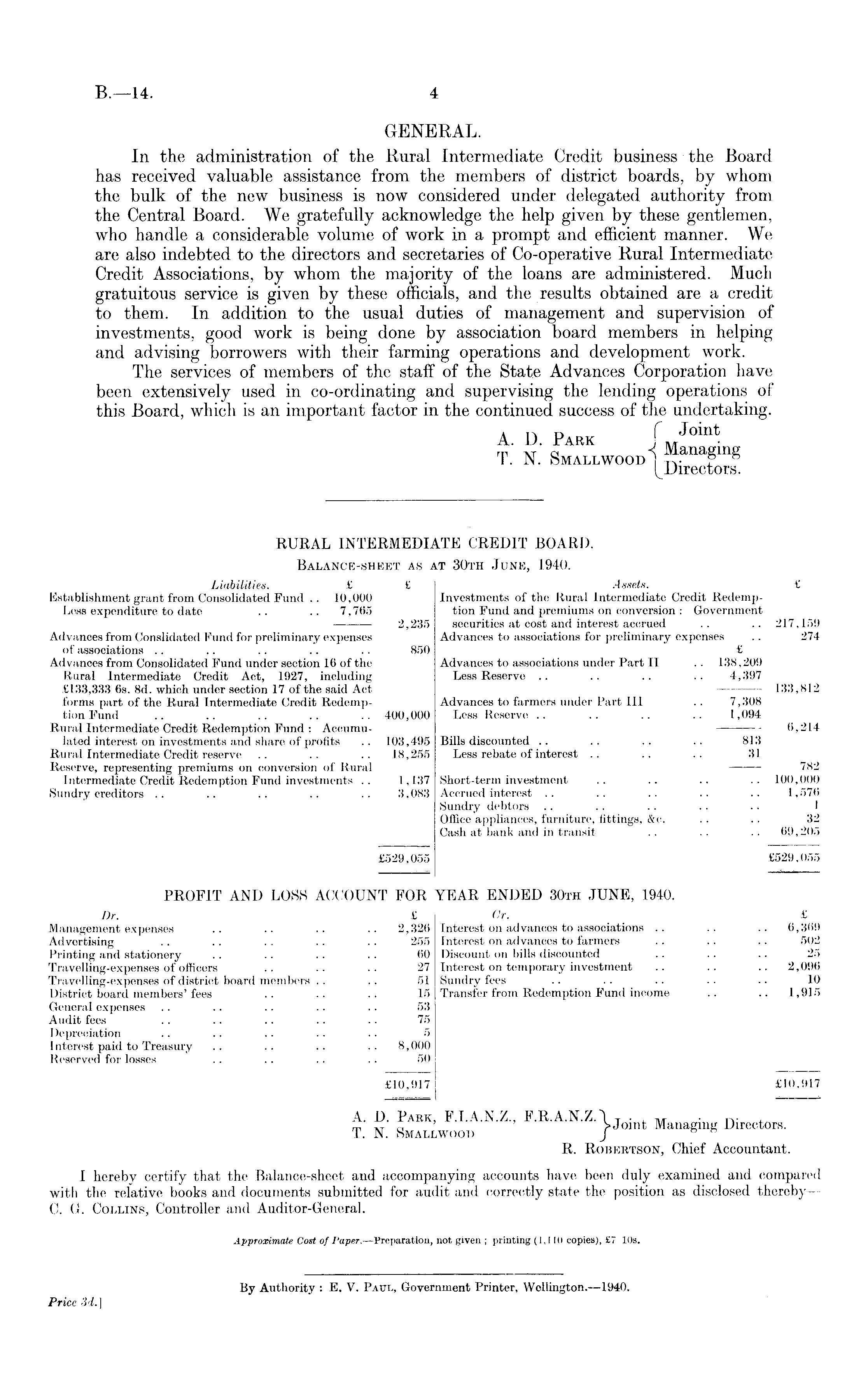 GENERAL. In the administration of the Rural Intermediate Credit business the Board has received valuable assistance from the members of district boards, by whom the bulk of the new business is now considered under delegated authority from the Central Board. We gratefully acknowledge the help given by these gentlemen, who handle a considerable volume of work in a prompt and efficient manner. We are also indebted to the directors and secretaries of Co-operative Rural Intermediate Credit Associations, by whom the majority of the loans are administered. Much gratuitous service is given by these officials, and the results obtained are a credit to them. In addition to the usual duties of management and supervision of investments, good work is being done by association board members in helping and advising borrowers with their farming operations and development work. The services of members of the staff of the State Advances Corporation have been extensively used in co-ordinating and supervising the lending operations of this Board, which is an important factor in the continued success of the undertaking. A. D. Pabk | M Joint T. N. Smallwood 1