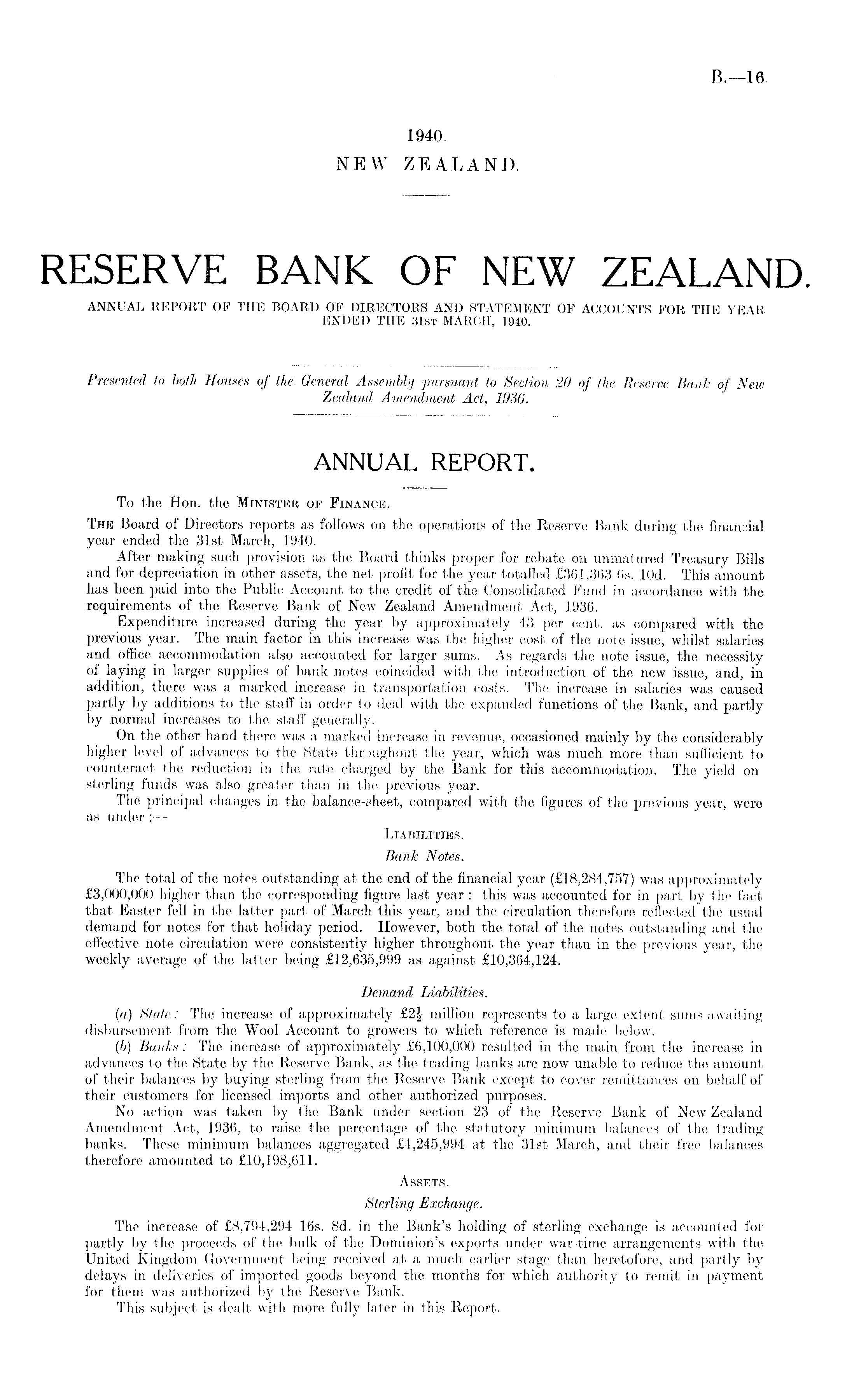 To the Hon. the Minister op Finance. The Board of Directors reports as follows on the operations of the Reserve Bank during the finansial year ended the 31st March, 1940. After making such provision as the Board thinks proper for rebate on unmatured Treasury Bills and for depreciation in other assets, the net profit for the year totalled £361,363 6s. 10d. This amount has been paid into the Public Account to the credit of the Consolidated Fund in accordance with the requirements of the Reserve Bank of New Zealand Amendment Act, 1936. Expenditure increased during the year by approximately 43 per cent, as compared with the previous year. The main factor in this increase was the higher cost of the note issue, whilst salaries and office accommodation also accounted for larger sums. As regards the note issue, the necessity of laying in larger supplies of bank notes coincided with the introduction of the new issue, and, in addition, there was a marked increase in transportation costs. The increase in salaries was caused partly by additions to the staff in order to deal with the expanded functions of the Bank, and partly by normal increases to the staff generally. On the other hand there was a marked increase in revenue, occasioned mainly by the considerably higher level of advances to the State throughout the year, which was much more than sufficient to counteract the reduction in the rate charged by the Bank for this accommodation. The yield on sterling funds was also greater than in the previous year. The principal changes in the balance-sheet, compared with the figures of the previous year, were as under; — Liabilities. Bank Notes. The total of the notes outstanding at the end of the financial year (£18,284,757) was approximately £3,000,000 higher than the corresponding figure last year : this was accounted for in part by the fact that Easter fell in the latter part of March this year, and the circulation therefore reflected the usual demand for notes for that holiday period. However, both the total of the notes outstanding and the effective note circulation were consistently higher throughout the year than in the previous year, the weekly average of the latter being £12,635,999 as against £10,364,124. Demand Liabilities. (a) Stale: The increase of approximately £2| million represents to a large extent sums awaiting disbursement from the Wool Account to growers to which reference is made below. (b) Banks : The increase of approximately £6,100,000 resulted in the main from the increase in advances to the State by the Reserve Bank, as the trading banks are now unable to reduce the amount of their balances by buying sterling from the Reserve Bank except to cover remittances on behalf of their customers for licensed imports and other authorized purposes. No action was taken by the Bank under section 23 of the Reserve Bank of New Zealand Amendment Act, 1936, to raise the percentage of the statutory minimum balances of the trading banks. These minimum balances aggregated £4,245,994 at the 31st March, and their free balances therefore amounted to £10,198,611. Assets. Sterling Exchange. The increase of £8,794,294 16s. Bd. in the Bank's holding of sterling exchange is accounted for partly by the proceeds of the bulk of the Dominion's exports under war-time arrangements with the United Kingdom Government being received at a much earlier stage than heretofore, and partly by delays in deliveries of imported goods beyond the months for which authority to remit in payment for them whs authorized by the Reserve Bank. This subject is dealt with more fully later in this Report.