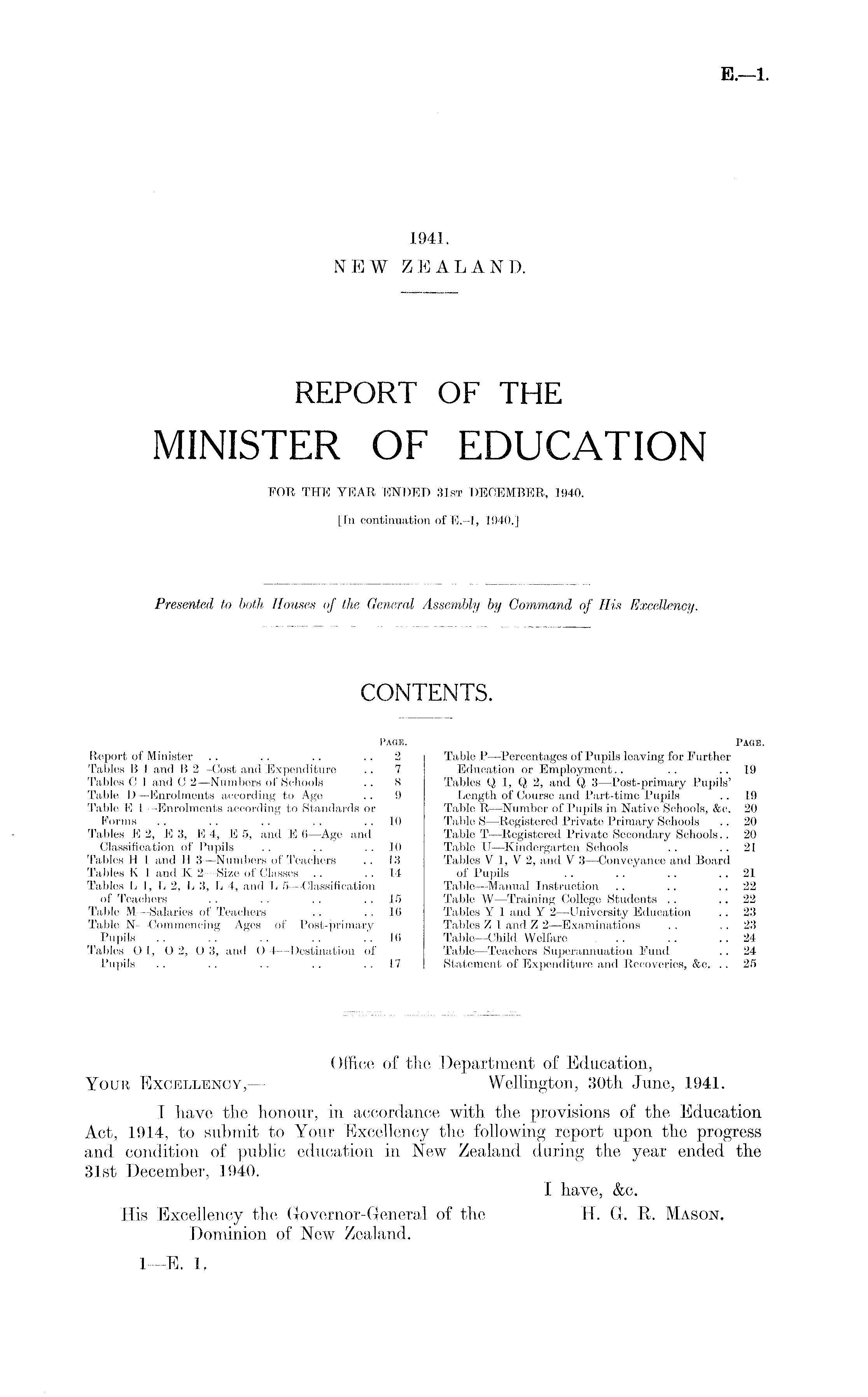 Office of the Department of Education, Your Excellency,— Wellington, 30th June, 1941. I have the honour, in accordance with the provisions of the Education Act, 1914, to submit to Your Excellency the following report upon the progress and condition of public education in New Zealand during the year ended the 31st December, 1940. I have, &c. His Excellency the Governor-General of the H. G. R. Mason. Dominion of New Zealand.