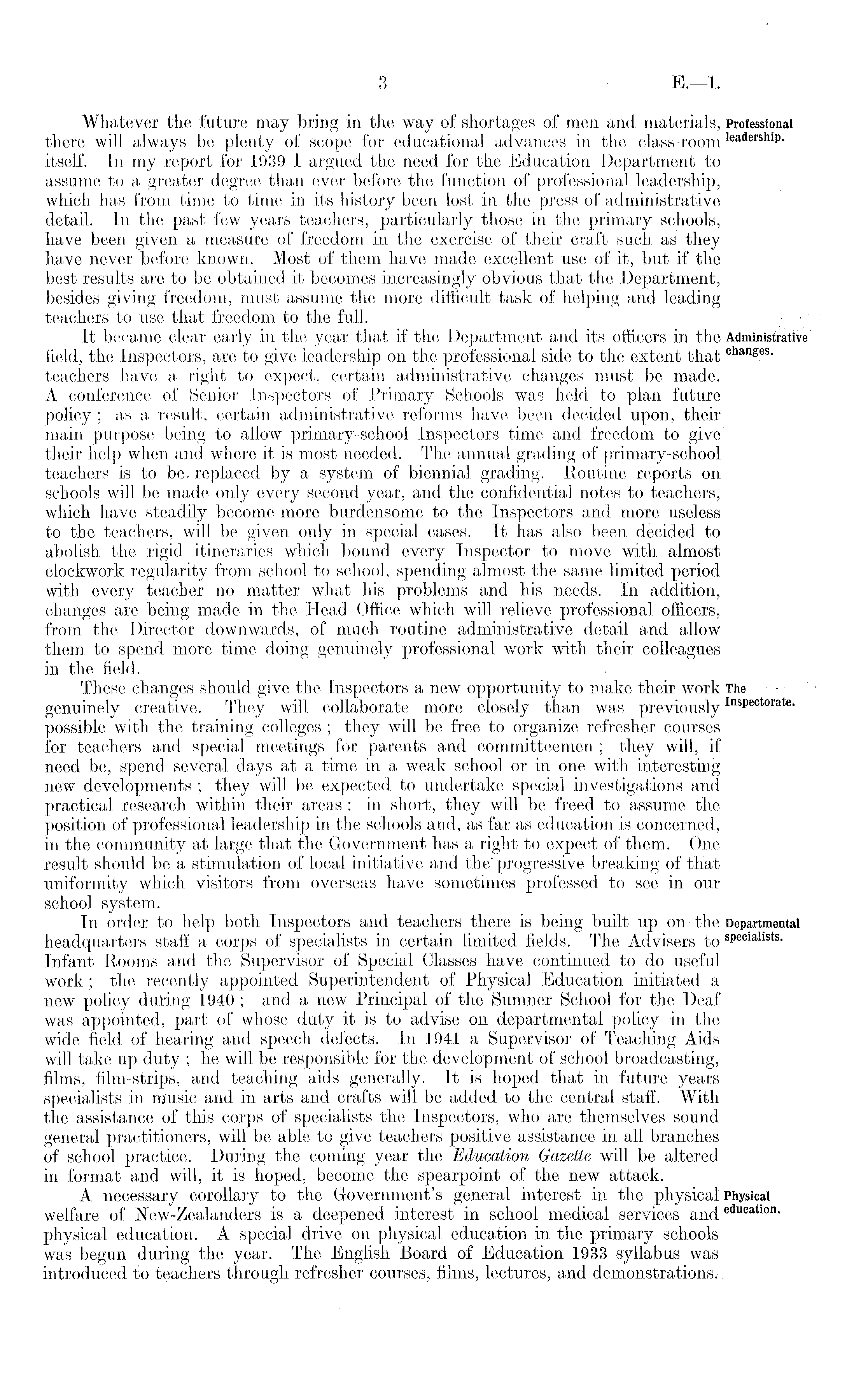 Whatever the future may bring in the way of shortages of men and materials, there will always be plenty of scope for educational advances in the class-room itself. In my report for 1939 I argued the need for the Education Department to assume to a greater degree than ever before the function of professional leadership, which has from time to time in its history been lost in the press of administrative detail. In the past few years teachers, particularly those in the primary schools, have been given a measure of freedom in the exercise of their craft such as they have never before known.. Most of them have made excellent use of it, but if the best results are to be obtained it becomes increasingly obvious that the Department, besides giving freedom, must assume the more difficult task of helping and leading teachers to use that freedom to the full. It became clear early in the year that if the Department and its officers in the held, the Inspectors, are to give leadership on the professional side to the extent that teachers have a right to expect, certain administrative changes must be made. A conference of Senior Inspectors of Primary Schools was held to plan future policy ; as a result,, certain administrative reforms have been decided upon, their main purpose being to allow primary-school Inspectors time and freedom to give their help when and where it is most needed." The annual grading of primary-school teachers is to be. replaced by a system of biennial grading. Routine reports on schools will be made only every second year, and the confidential notes to teachers, which have steadily become more burdensome to the Inspectors and more useless to the teachers, will be given only in special cases. It has also been decided to abolish the rigid itineraries which bound every Inspector to move with almost clockwork regularity from school to school, spending almost the same limited period with every teacher no matter what his problems and his needs. In addition, changes are being made in the Head Office which will relieve professional officers, from the Director downwards, of much routine administrative detail and allow them to spend more time doing genuinely professional work with their colleagues in the field. These changes should give the Inspectors a new opportunity to make their work genuinely creative. They will collaborate more closely than was previously possible with the training colleges ; they will be free to organize refresher courses for teachers and special meetings for parents and committeemen ; they will, if need be, spend several days at a time in a weak school or in one with interesting new developments ; they will be expected to undertake special investigations and practical research within their areas : in short, they will be freed to , assume the position of professional leadership in the schools and, as far as education is concerned, in the community at large that the Government lias a right to expect of them. One result should be a stimulation of local initiative and the' progressive breaking of that uniformity which visitors from overseas have sometimes professed to see in our school system. In order to help both Inspectors and teachers there is being built up on the headquarters staff a corps of specialists in certain limited fields. The Advisers to Infant Rooms and the Supervisor of Special Classes have continued to do useful work ; the recently appointed Superintendent of Physical Education initiated a new policy during 1940 ; and a new Principal of the Sumner School for the Deaf was appointed, part of whose duty it is to advise on departmental policy in the wide field of hearing and speech defects. In 1941 a Supervisor of Teaching Aids will take up duty ; he will be responsible for the development of school broadcasting, films, film-strips, and teaching aids generally. It is hoped that in future years specialists in music and in arts and crafts will be added to the central staff . With the assistance of this corps of specialists the Inspectors, who are themselves sound general practitioners, will be able to give teachers positive assistance in all branches of school practice. During the coming year the Education Gazette will be altered in format and will, it is hoped, become the spearpoint of the new attack. A necessary corollary to the Government's general interest in the physical welfare of New-Zealanders is a deepened interest in school medical services and physical education. A special drive on physical education in the primary schools was begun during the year. The English Board of Education 1933 syllabus was introduced to teachers through refresher courses, films, lectures, and demonstrations.
