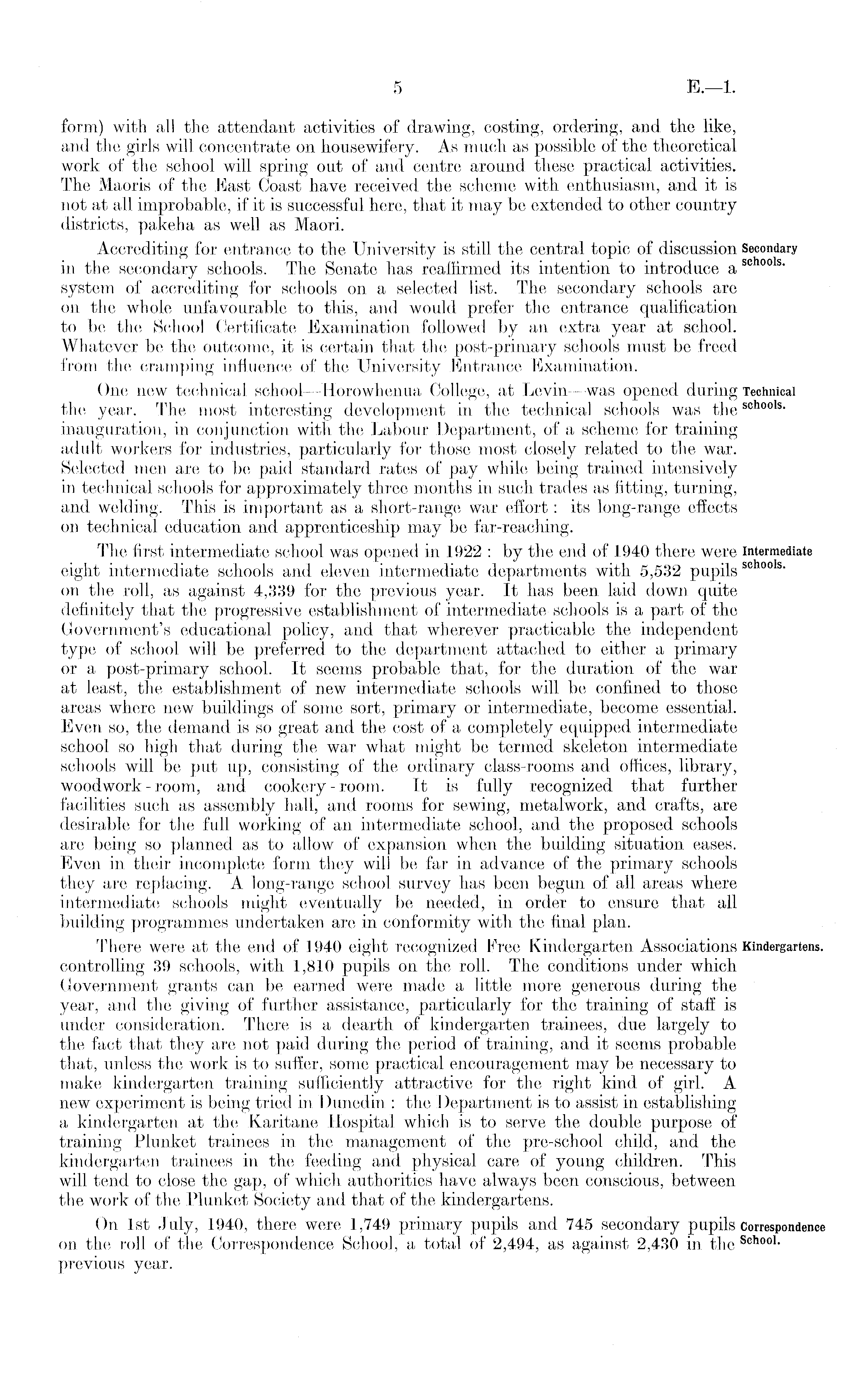form) with all the attendant activities of drawing, costing, ordering, and the like, and the girls will concentrate on housewifery. As much as possible of the theoretical work of the school will spring out of and centre around these practical activities. The Maoris of the East Coast have received the scheme with enthusiasm, and it is not at all improbable, if it is successful here, that it may be extended to other country districts, pakeha as well as Maori. Accrediting for entrance to the University is still the central topic of discussion in the secondary schools. The Senate has reaffirmed its intention to introduce a system of accrediting for schools on a selected list. The secondary schools are on the whole unfavourable to this, and would prefer the entrance qualification to be the School Certificate Examination followed by an extra year at school. Whatever be the outcome, it is certain that the post-primary schools must be freed from the cramping influence of the University Entrance Examination. One new technical school—Horowhenua College, at Levin—was opened during the year. The most interesting development in the technical schools was the inauguration, in conjunction with the Labour Department, of a scheme for training adult workers for industries, particularly for those most closely related to the war. Selected men are to be paid standard rates of pay while being trained intensively in technical schools for approximately three months in such trades as fitting, turning, and welding. This is important as a short-range war effort: its long-range effects on technical education and apprenticeship may be far-reaching. The first intermediate school was opened in 1922 :by the end of 1940 there were eight intermediate schools and eleven intermediate departments with 5,532 pupils on the roll, as against 4,339 for the previous year. It has been laid down quite definitely that the progressive establishment of intermediate schools is a part of the Government's educational policy, and that wherever practicable the independent type of school will be preferred to the department attached to either a primary or a post-primary school. It seems probable that, for the duration of the war at least, the establishment of new intermediate schools will be confined to those areas where new buildings of some sort, primary or intermediate, become essential. Even so, the demand is so great and the cost of a completely equipped intermediate school so high that during the war what might be termed skeleton intermediate schools will be put up, consisting of the ordinary class-rooms and offices, library, woodwork - room, and cookery - room. It is fully recognized that further facilities such as assembly hall, and rooms for sewing, metalwork, and crafts, are desirable for the full working of an intermediate school, and the proposed schools are being so planned as to allow of expansion when the building situation eases. Even in their incomplete form they will be far in advance of the primary schools they are replacing. A long-range school survey has been begun of all areas where intermediate schools might eventually be needed, in order to ensure that all building programmes undertaken are in conformity with the final plan. There were at the end of 1940 eight recognized Free Kindergarten Associations controlling 39 schools, with 1,810 pupils on the roll. The conditions under which Government grants can be earned were made a little more generous during the year, and the giving of further assistance, particularly for the training of staff is under consideration. There is a dearth of kindergarten trainees, due largely to the fact that they are not paid during the period of training, and it seems probable that, unless the work is to suffer, some practical encouragement may be necessary to make kindergarten training sufficiently attractive for the right kind of girl. A new experiment is being tried in Dunedin : the Department is to assist in establishing a kindergarten at the Karitane Hospital which is to serve the double purpose of training Plunket trainees in the management of the pre-school child, and the kindergarten trainees in the feeding and physical care of young children. This will tend to close the gap, of which authorities have always been conscious, between the work of the Plunket Society and that of the kindergartens. On Ist July, 1940, there were 1,749 primary pupils and 745 secondary pupils on the roll of the Correspondence School, a total of 2,494, as against 2,430 in the previous year.