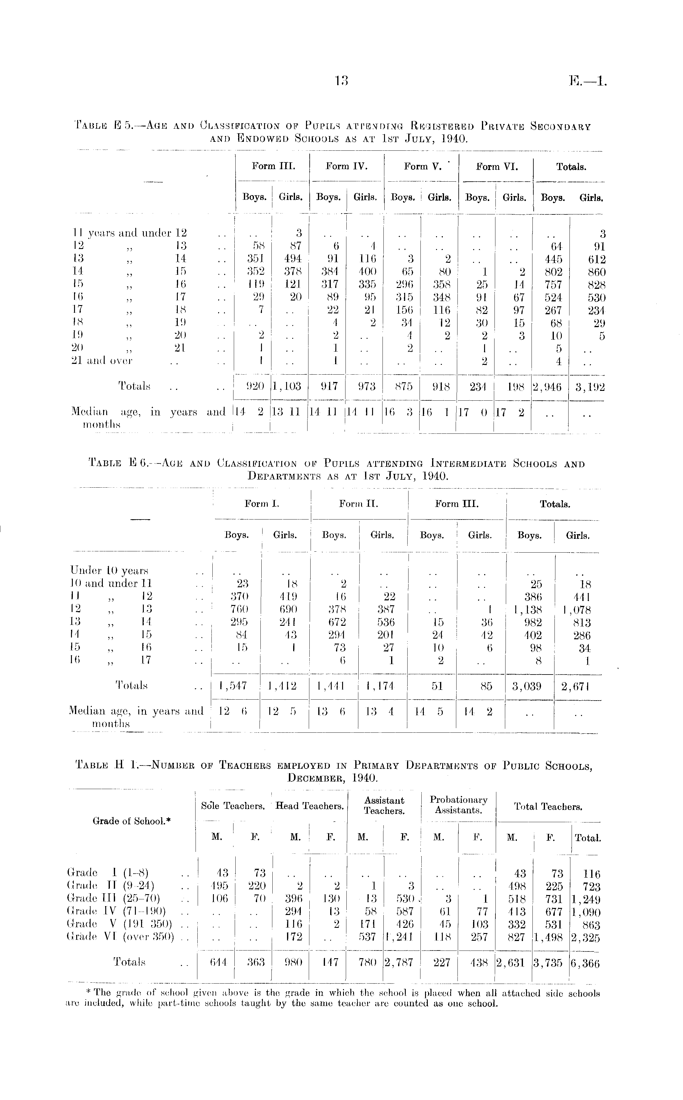 Table E5.— Age and Classification of Pupils attending Registered Private Secondary and Endowed Schools as at 1st July, 1940.